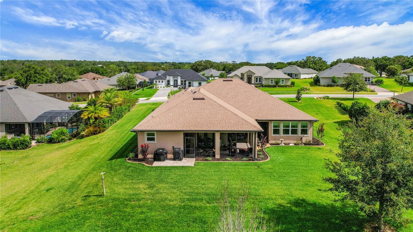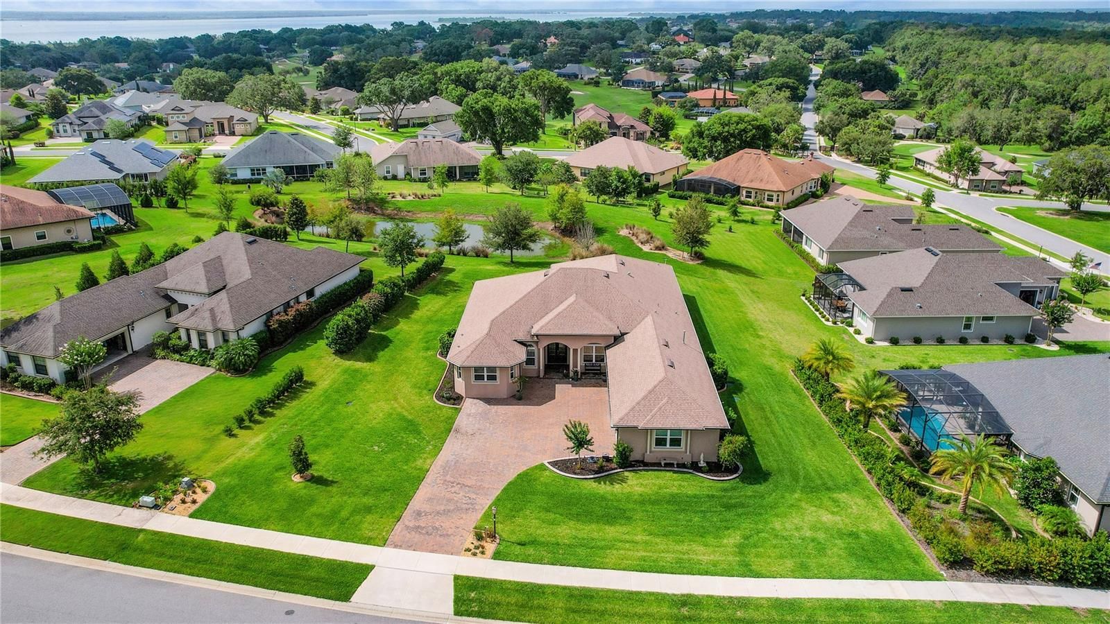 Experience luxury living in this impeccably upgraded 4 bed + Office + Bonus Room + 3 bath home with a rare 4-car garage, built in 2021 and located with a pond view on .48 acre with room for a pool in the desirable Harbor Hills Golf & Chain of Lake community. This one of a kind customized Willow Model featuring 3,432 sq ft heated is sure to impress. From the moment you step inside, you'll notice the soaring ceilings, elegant 6" baseboards, and 7.25" crown molding that add a refined touch throughout. Beautiful porcelain tile plank flooring spans the entire home, providing both style and durability. The chef’s kitchen is truly a showstopper—featuring a gas cooktop, large island with dual-sided cabinetry, upgraded appliances, stylish cabinetry and hardware, a designer tile backsplash, and an upgraded sink and faucet. Ample storage is available in the walk-in pantry and oversized appliance cabinet. All bathrooms have been thoughtfully upgraded with premium countertops, cabinetry, sinks, faucets, and comfort-height toilets. The spacious primary suite (26 x 15) includes a luxurious en suite bath with dual vanities and a large walk-through shower. Additional highlights include a spacious laundry room (6’6 x 20) with upgraded cabinetry and sink, a dedicated indoor storage closet, and an expansive screened lanai with peaceful pond views and ceiling fans for added comfort. This home is equipped for peace of mind with a 24 kWh whole-house generator and a 250-gallon in-ground propane tank, including a gas line to the outdoor grill area—perfect for entertaining. AN ADDED BONUS IS THE EXTREMELY LOW ELECTRIC BILLS that range from $40-$235 throughout the year-WOW!!! Located just minutes to shopping, restaurants, doctors, medical facilities, the Villages Square with nightly entertainment and so much more!