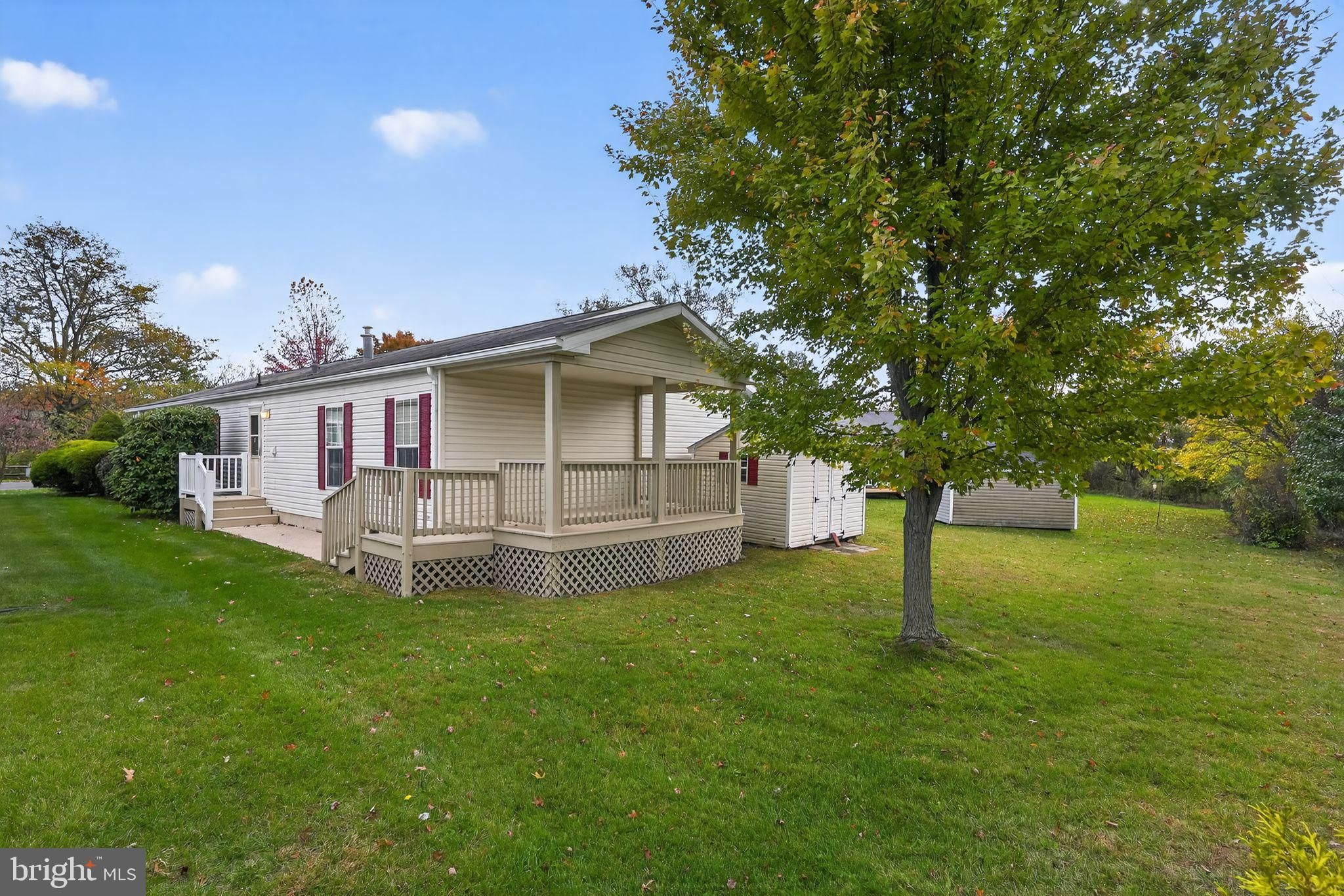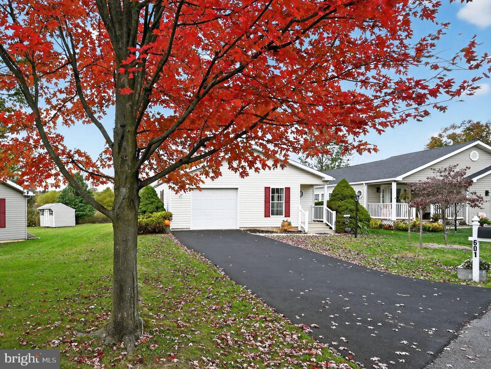 The Willow Manor model in the village of Willow Run, a 55+ community, boasts 2 bedrooms, 2 baths with a larger foot print than most in the community. The home is situated on a corner lot that faces a woodsy view from the front- not another home- and a back yard with a covered porch that looks out to open space. Stepping over the threshold one is greeted with a foyer that includes a front facing window and coat closet. Commodious living room leads to dining room with kitchen to the left. Eating space is large with room for a desk, extra kitchen cabinetry, perhaps some book shelves or an easy chair to enjoy looking out the double windows. Cooking side of the kitchen has an island, a storage pantry next to the refrigerator and a door leading to a single car garage. Garbage disposal and microwave are new this year. Electric smooth cook top stove makes cleanup a breeze. Center hall leading to the bedrooms and bathrooms has a roomy closet. Hall bath has a single sink vanity and tub/shower combination. Laundry room offers stackable washer and dryer next to a deep sink and a door to the back porch. Both bedrooms offer good closet space. Master bath has single sink vanity, plenty of storage, separate tub and low threshold shower. There is additional cabinetry serving as a linen closet making this bathroom very convenient. Dry wall throughout means painting and decorating pose no issues for hanging anything on the walls. There is a shed out back in addition to garage storage. This house is light and bright even on a dreary day! Front steps and back porch newly painted. HVAC replaced in 2022, washer/dryer 2019, water heater 2018.