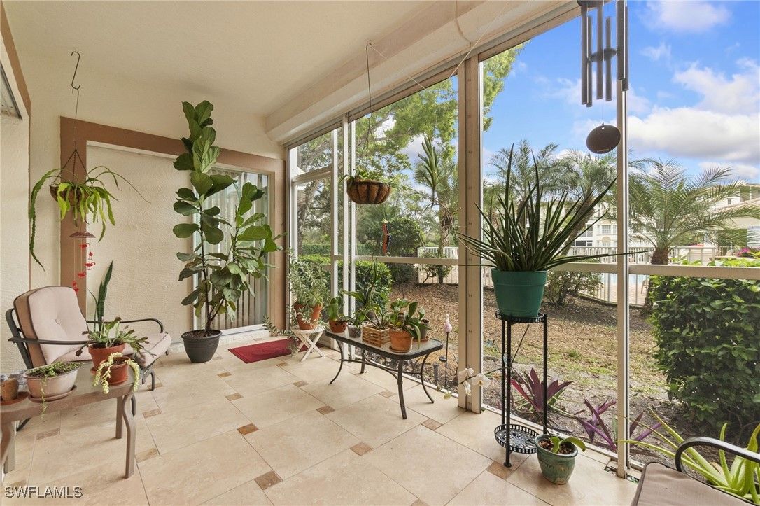 FIRST FLOOR CONDO. This exceptional condominium is impeccably cared for. The layout is designed for effortless Florida living, 1,414 square feet of thoughtfully designed living space, this home offers a serene retreat with spacious rooms, abundant windows and sliders, and both front and back screened lanais that invite in the sunshine. The kitchen is ideal for entertaining, seamlessly flowing into the living room and an eat-in area that opens to the front screened lanai. Granite counters, stainless steel appliances, and ample cabinetry enhance the space. The living room extends to the back screened lanai, offering panoramic views of pool and foliage and featuring an electric Hurricane Shutter. The generously sized primary suite boasts a charming bay window overlooking the pool and a slider leading to the lanai. A walk-in closet and well-appointed primary bath with a walk-in shower, garden tub, and dual sinks, complete the suite. The guest suite offers privacy and convenient access to the carport. Vineyards offers an adjacent Shopping Center w/Dining, Shopping, Medical Center w/Hospital & Emergency Room, CRUNCH Gym, Walgreens, Publix etc, as well as Vineyards 32 acre Community Park! VINEYARDS COUNTRY CLUB, WITH AWARD WINNING FITNESS/SPA & WELLNESS CENTER, is OPTIONAL and available at an additional cost and offers 2 championship Golf Courses, 12 Tennis Courts, Pickle Ball Courts, Bocce Ball Courts, 2 Restaurants, 2 pools, etc.