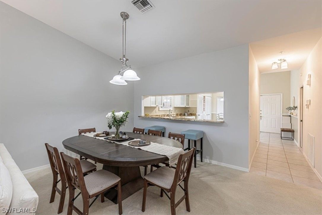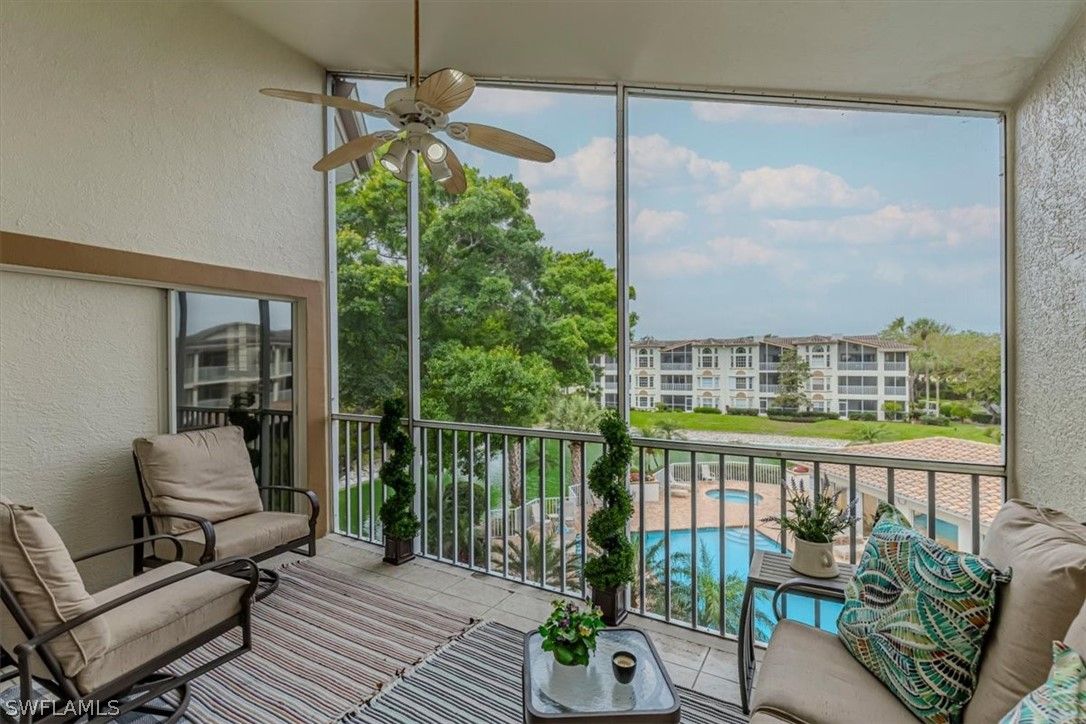 Rarely available top-floor residence in Chardonnay at The Vineyards! This bright and spacious three-bedroom, two-bath condo features vaulted ceilings and a thoughtfully designed floor plan filled with natural light. The expansive living and dining areas flow seamlessly into the kitchen with granite countertops, white cabinetry, and matching appliances, creating a welcoming space for everyday living and entertaining. The primary suite offers a generous layout with beautiful bay windows, abundant natural light, and an en-suite bath with a frameless glass shower. Guests will appreciate the privacy of the split-bedroom design and the well-appointed guest bathroom. The 3rd bedroom can easily function as a third bedroom, home office, or additional guest space. Enjoy the Florida lifestyle with two screened lanais — an eastern-facing front lanai perfect for morning coffee and a western-facing lanai overlooking the community pool and pond, ideal for relaxing sunsets. Additional features include covered carport parking, a private storage unit, and convenient elevator access to the third floor. Furnishings are negotiable, offering the opportunity for a seamless move-in and the ability to begin enjoying the Naples lifestyle immediately. This home enjoys a truly exceptional location adjacent to Vineyards Community Park, home to a variety of outdoor activities, walking paths, community events, and recreational spaces. Located in one of Naples’ most convenient locations, residents are just minutes from shopping, dining, Physicians Regional Hospital, and the Gulf beaches. Easy access to I-75 provides a quick drive to RSW International Airport, making travel simple for both seasonal and full-time residents. Optional membership to Vineyards Country Club offers access to 36 holes of championship golf, tennis, pickleball, a world-class wellness center and spa, and a vibrant social calendar. A wonderful opportunity to enjoy the Vineyards lifestyle in a spacious top-floor residence.