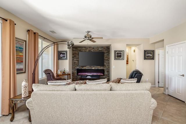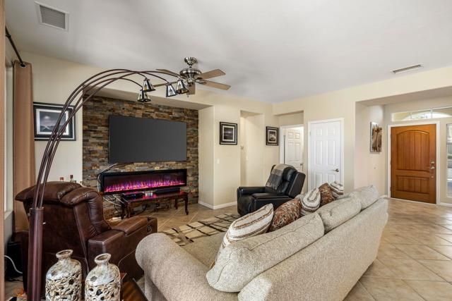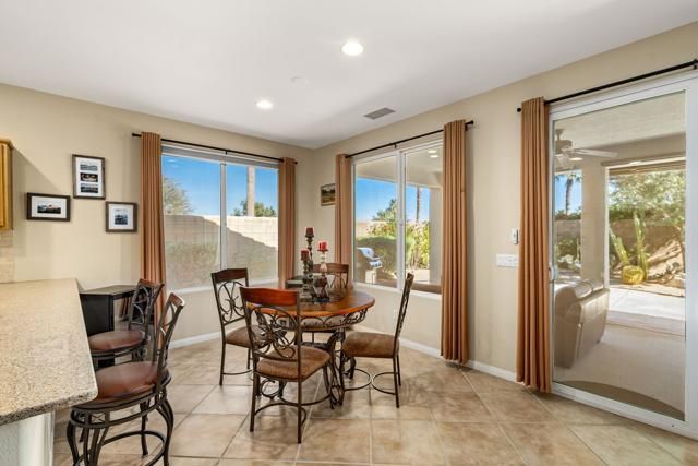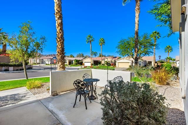 This impeccably maintained 2BR/2BA Maurea model is a standout value, offering super‑clean living, a newer A/C system, and front courtyard--all set on an elevated 9,148sqft lot capturing dramatic mountain vistas, glowing sunsets, and charming peek‑a‑boo views. Fresh upgrades shine throughout, from newer kitchen appliances to a striking stack‑stone encased media wall with flat‑screen TV and a sleek elongated electric fireplace that flickers with vibrant, colorful flames. Bright and uplifting interiors feature tile flooring, soaring ceilings, abundant windows, and views of the lush, private, artfully landscaped yard complete with a bubbling fountain. Outdoor living is exceptional with a spacious covered patio enhanced by ceiling fans, custom solar shades, and electronic awnings. The open‑concept layout flows effortlessly, with a chef‑friendly kitchen boasting custom cabinetry, travertine backsplash, slab granite counters, and a generous breakfast bar, while the adjacent dining area opens directly to the patio. The serene primary suite offers a bay window, patio access and a spa‑style bath with dual vanities, marble counters, walk‑in shower stall, with bench seat, and a large walk‑in closet--creating a luxurious retreat in a home that truly has it all. Enjoy the close proximity to the Santa Rosa Clubhouse with world class amenities.