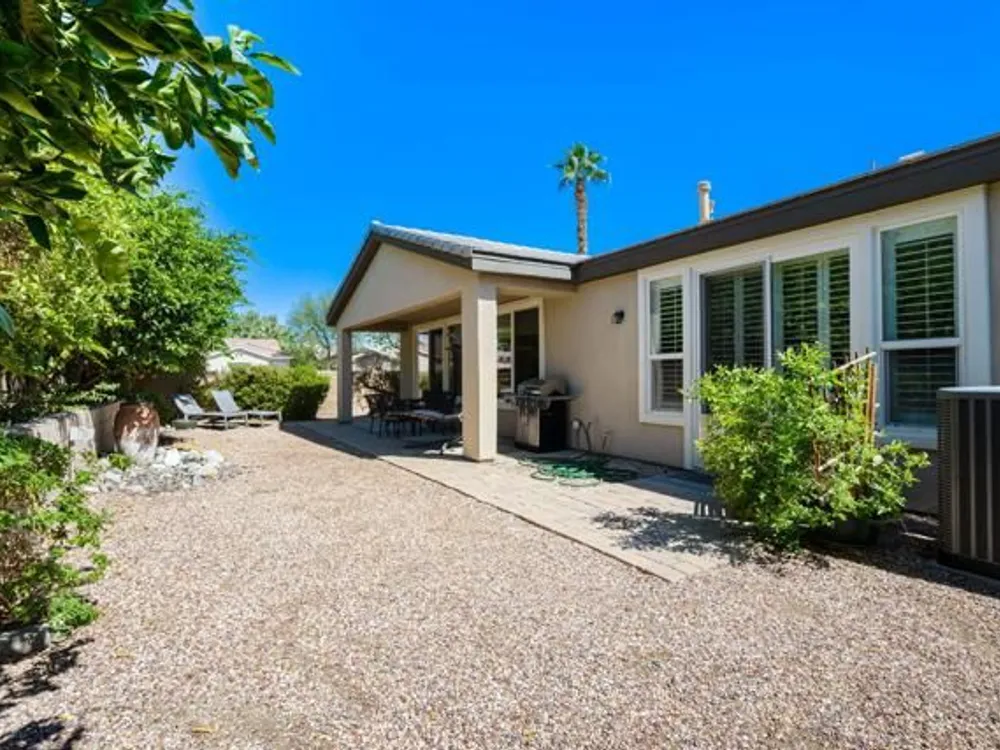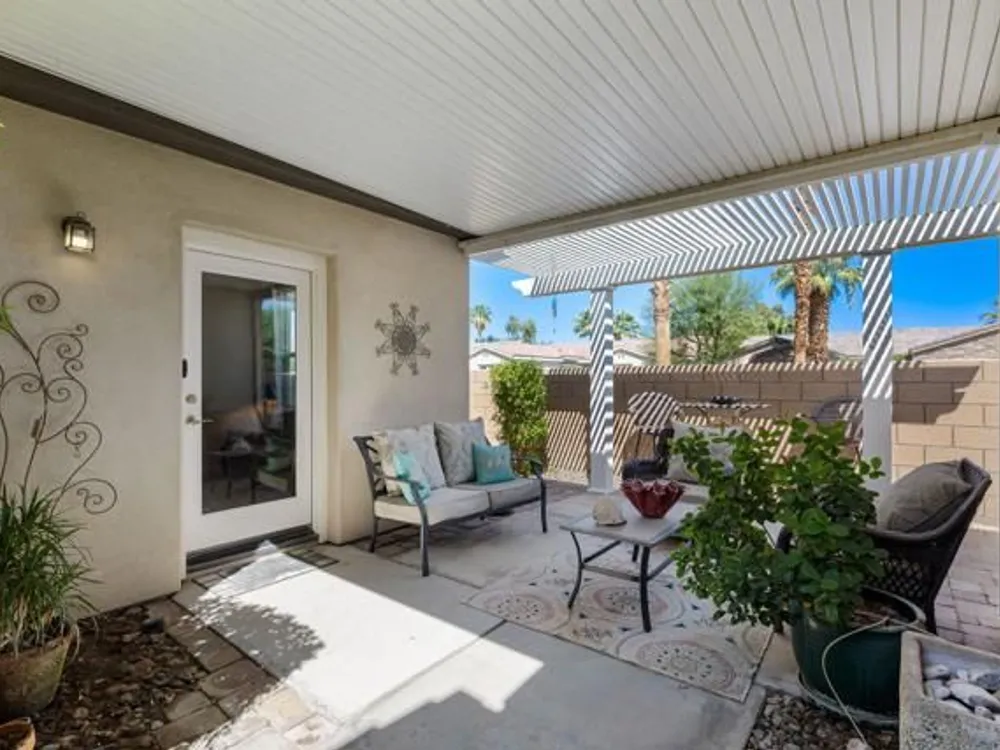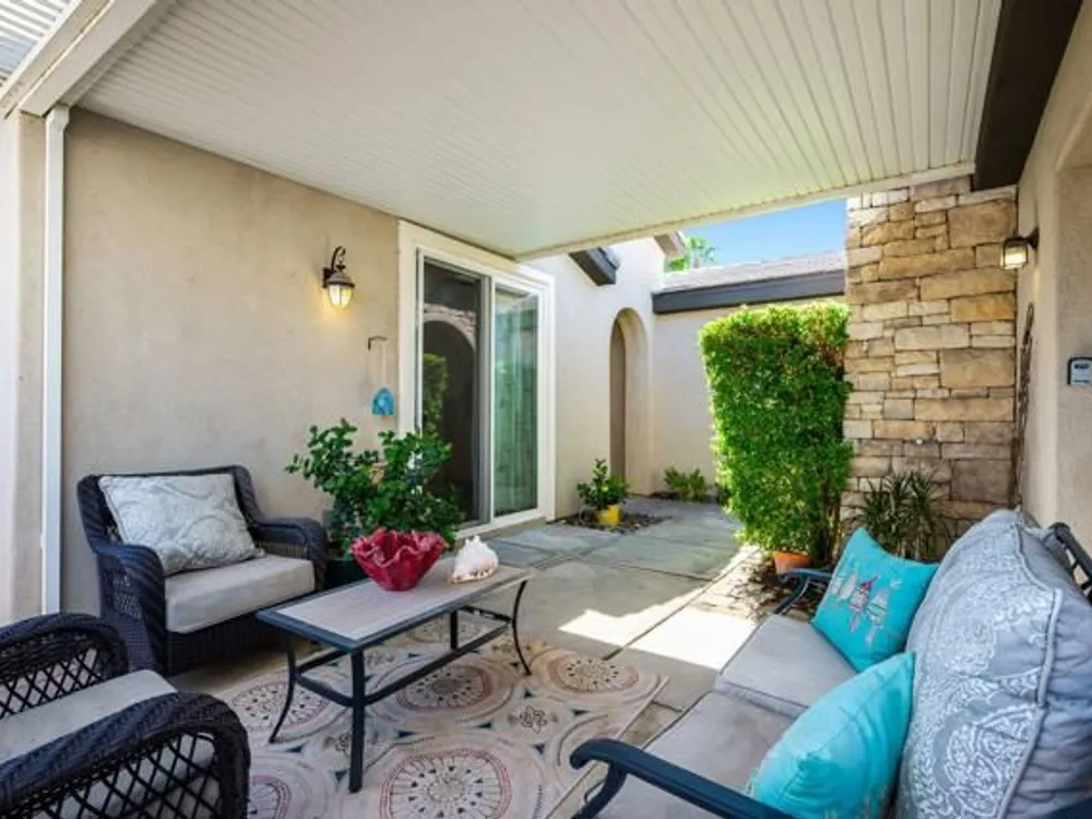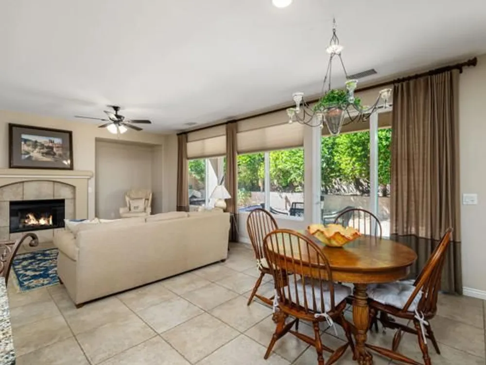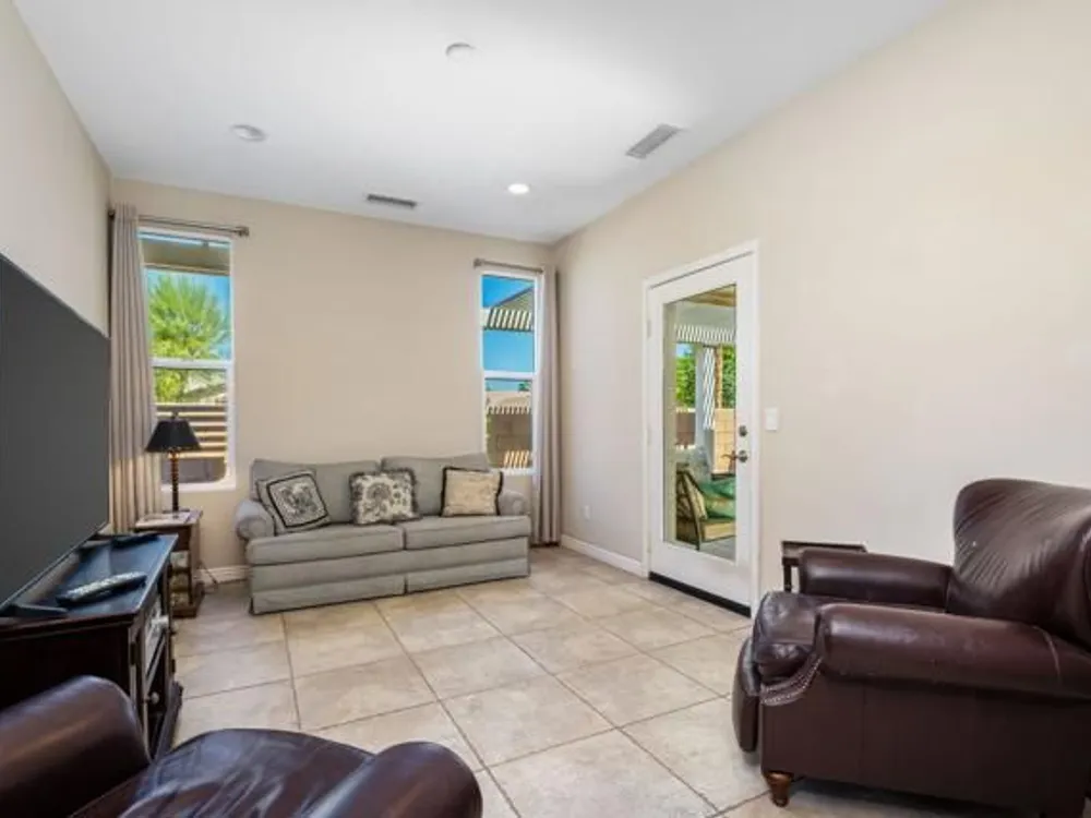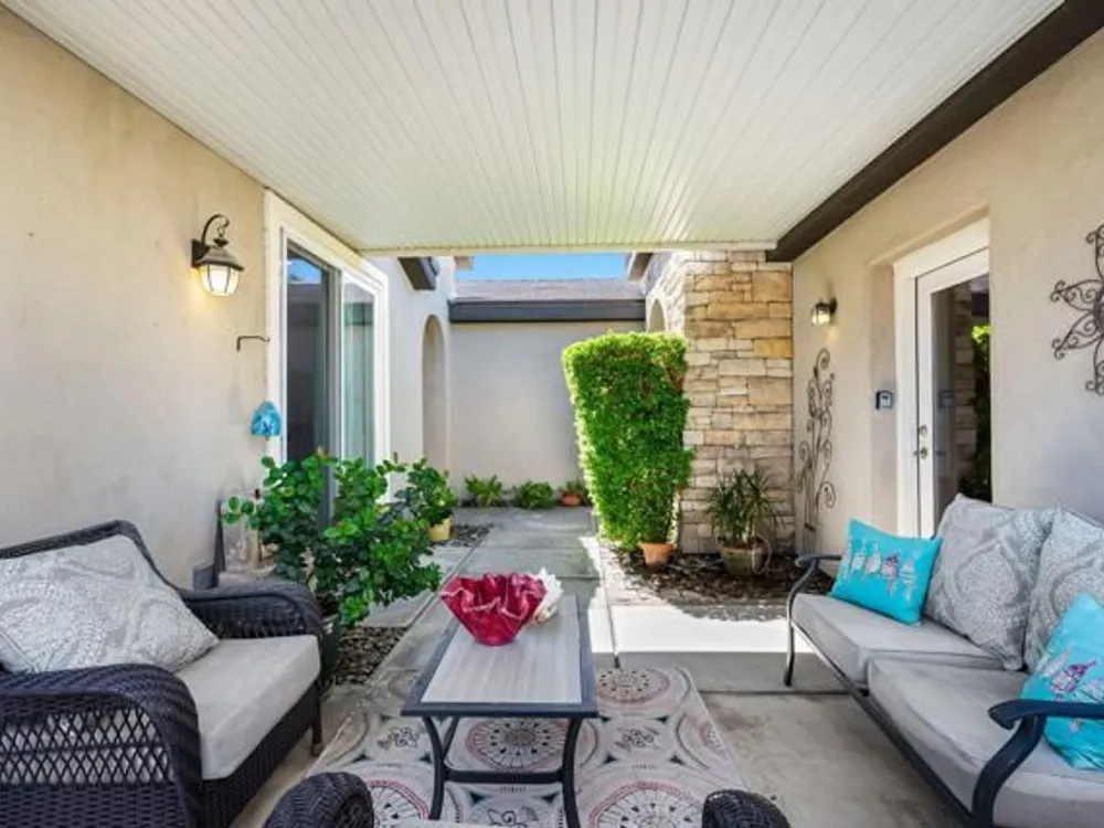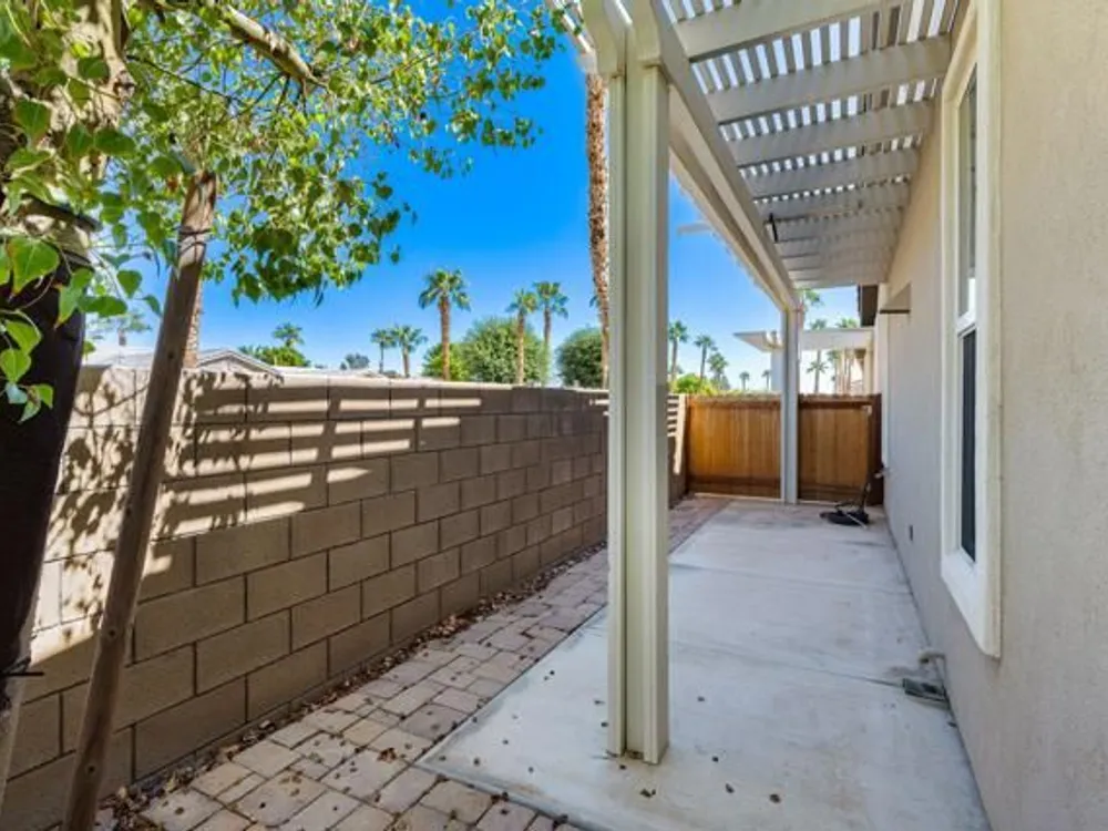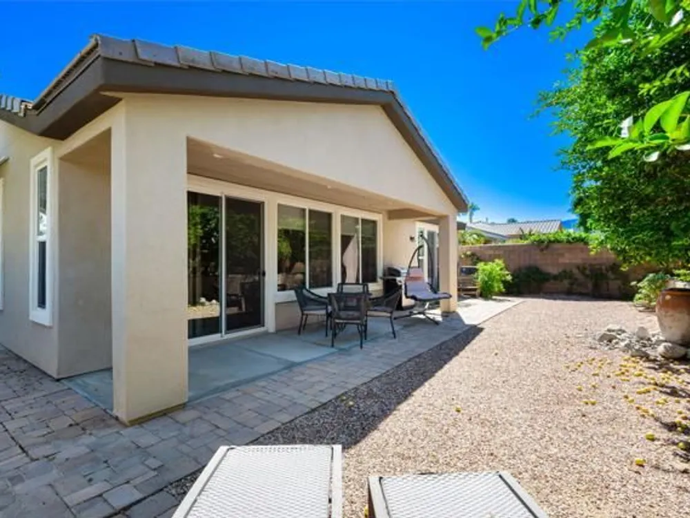Perched on an 8,276sqft. premium corner lot, this beautifully appointed Monterey plan with detached Casita offers the perfect blend of comfort, style, and resort living in the heart of Trilogy at La Quinta. Featuring 3 bedrooms, 3 bathrooms, and a versatile den/office with its own private entry, this 1939 sq. ft. single family residence is designed to maximize both indoor and outdoor living. The Tuscan-inspired exterior, enhanced with stone accents and a custom wrought iron gate, opens into a serene private courtyard (with pergola) that seamlessly extends your living and entertaining space. Inside, soaring ceilings, gorgeous 20'' Italian tile flooring, and expansive picture windows create a bright and inviting ambiance. The chef's kitchen is equipped with upgraded cabinetry, a walk-in pantry, extensive granite counters and backsplash, stainless steel appliances including double ovens, gas cooktop, counter depth fridge, and a generous center island, with bar seating, making it ideal for cooking and entertaining alike. The open concept great room showcases a cozy tile encased gas fireplace and TV/Media niche. The spacious primary suite boasts plantation shutters and slider to rear yard, and guest accommodations, including the separate Casita, ensure comfort and privacy for family and visitors. Outdoors, the lush backyard features a paver deck, mature lemon and lime trees, providing a private oasis. Additional upgrades include a fully replaced A/C and HVAC system (2022) and 26-foot-deep garage. Great proximity to the Santa Rosa Clubhouse with its world-class amenities, this home offers the quintessential desert resort lifestyle. Schedule your private tour today!