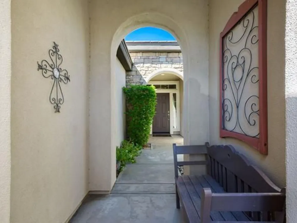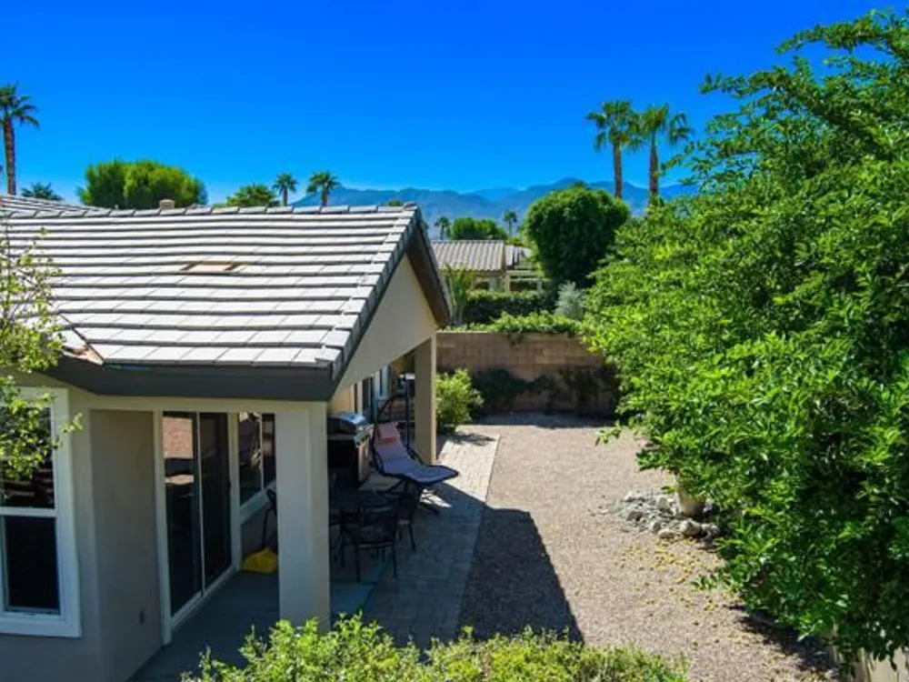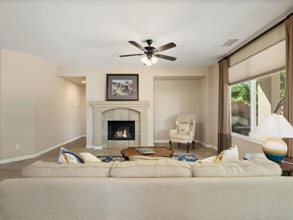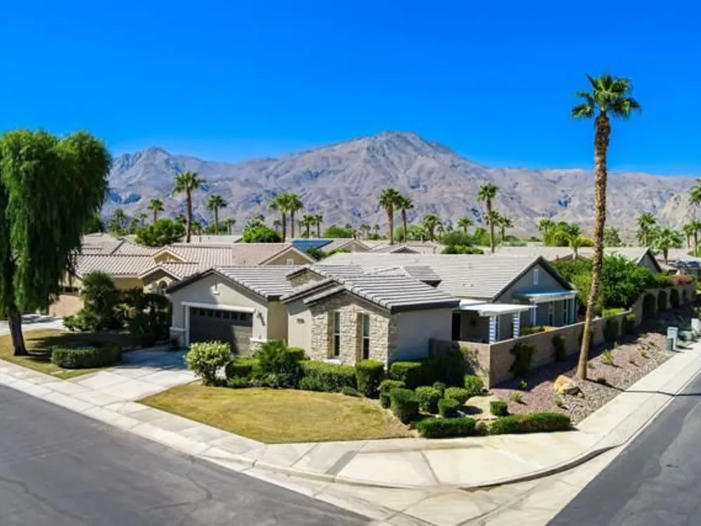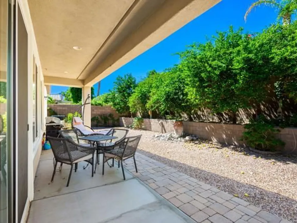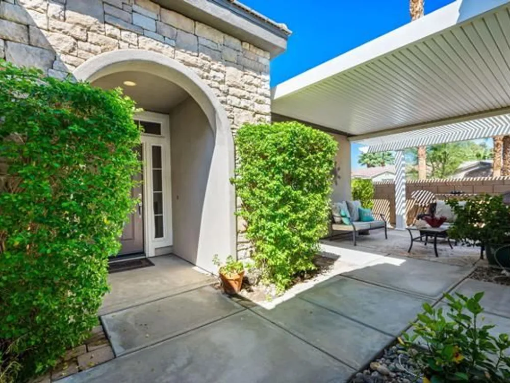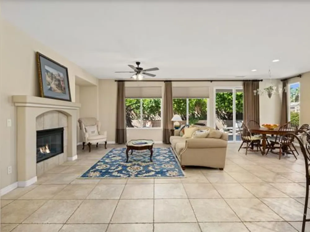 Perched on an 8,276sqft. premium corner lot, this beautifully appointed Monterey plan with detached Casita offers the perfect blend of comfort, style, and resort living in the heart of Trilogy at La Quinta. Featuring 3 bedrooms, 3 bathrooms, and a versatile den/office with its own private entry, this 1939 sq. ft. single family residence is designed to maximize both indoor and outdoor living. The Tuscan-inspired exterior, enhanced with stone accents and a custom wrought iron gate, opens into a serene private courtyard (with pergola) that seamlessly extends your living and entertaining space. Inside, soaring ceilings, gorgeous 20'' Italian tile flooring, and expansive picture windows create a bright and inviting ambiance. The chef's kitchen is equipped with upgraded cabinetry, a walk-in pantry, extensive granite counters and backsplash, stainless steel appliances including double ovens, gas cooktop, counter depth fridge, and a generous center island, with bar seating, making it ideal for cooking and entertaining alike. The open concept great room showcases a cozy tile encased gas fireplace and TV/Media niche. The spacious primary suite boasts plantation shutters and slider to rear yard, and guest accommodations, including the separate Casita, ensure comfort and privacy for family and visitors. Outdoors, the lush backyard features a paver deck, mature lemon and lime trees, providing a private oasis. Additional upgrades include a fully replaced A/C and HVAC system (2022) and 26-foot-deep garage. Great proximity to the Santa Rosa Clubhouse with its world-class amenities, this home offers the quintessential desert resort lifestyle. Schedule your private tour today!