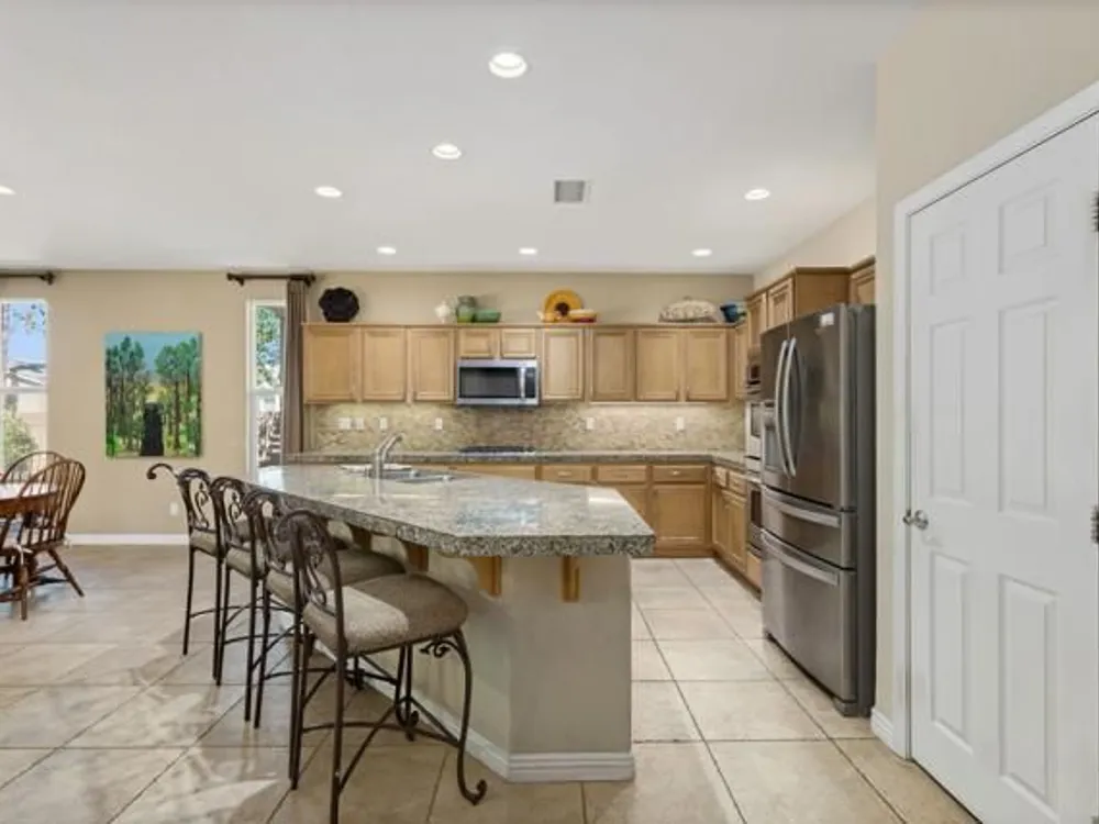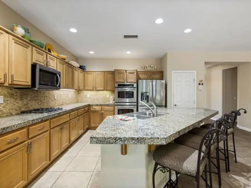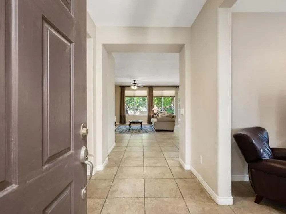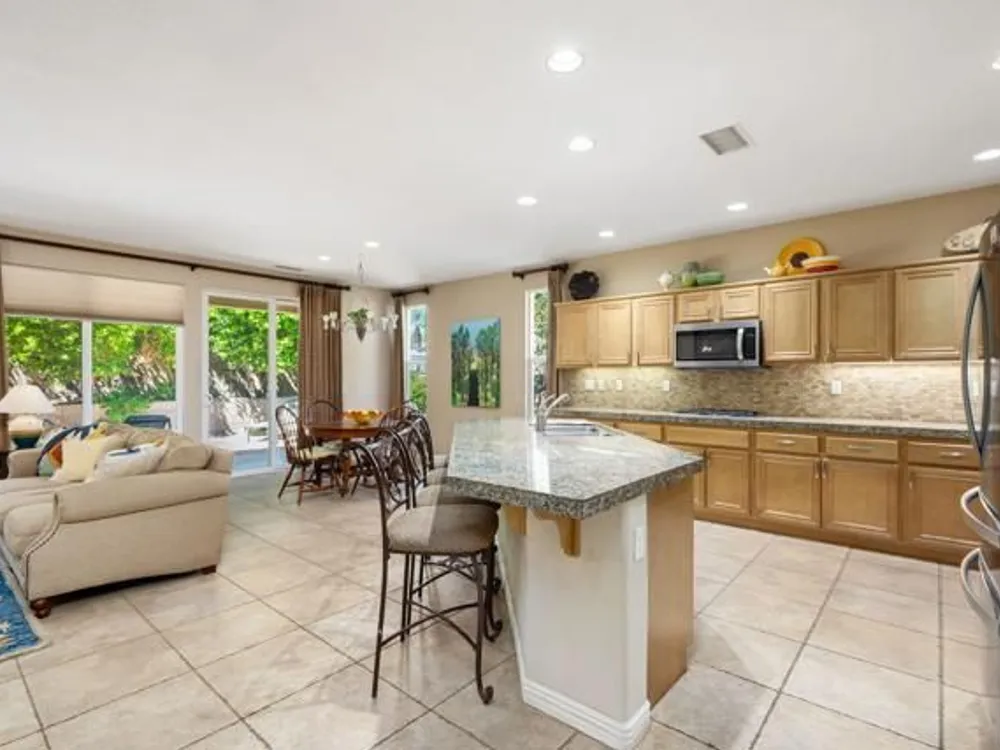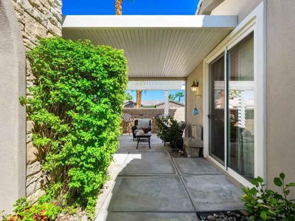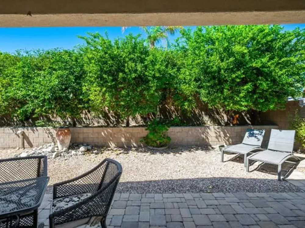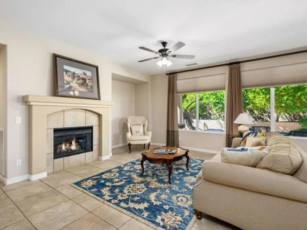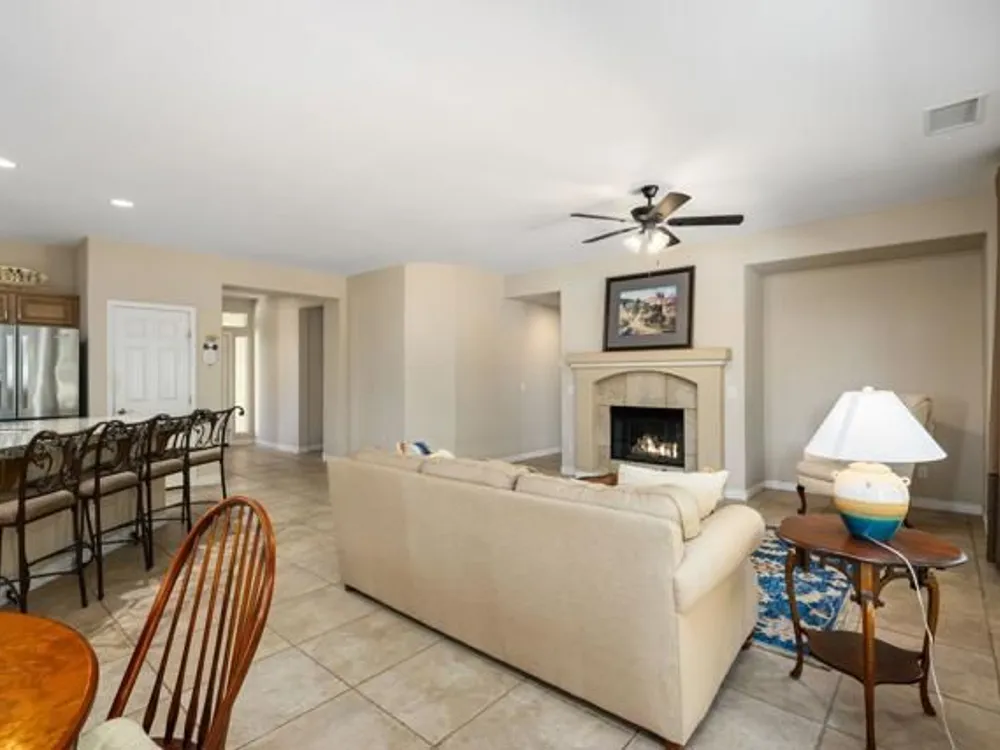 Perched on an 8,276sqft. premium corner lot, this beautifully appointed Monterey plan with detached Casita offers the perfect blend of comfort, style, and resort living in the heart of Trilogy at La Quinta. Featuring 3 bedrooms, 3 bathrooms, and a versatile den/office with its own private entry, this 1939 sq. ft. single family residence is designed to maximize both indoor and outdoor living. The Tuscan-inspired exterior, enhanced with stone accents and a custom wrought iron gate, opens into a serene private courtyard (with pergola) that seamlessly extends your living and entertaining space. Inside, soaring ceilings, gorgeous 20'' Italian tile flooring, and expansive picture windows create a bright and inviting ambiance. The chef's kitchen is equipped with upgraded cabinetry, a walk-in pantry, extensive granite counters and backsplash, stainless steel appliances including double ovens, gas cooktop, counter depth fridge, and a generous center island, with bar seating, making it ideal for cooking and entertaining alike. The open concept great room showcases a cozy tile encased gas fireplace and TV/Media niche. The spacious primary suite boasts plantation shutters and slider to rear yard, and guest accommodations, including the separate Casita, ensure comfort and privacy for family and visitors. Outdoors, the lush backyard features a paver deck, mature lemon and lime trees, providing a private oasis. Additional upgrades include a fully replaced A/C and HVAC system (2022) and 26-foot-deep garage. Great proximity to the Santa Rosa Clubhouse with its world-class amenities, this home offers the quintessential desert resort lifestyle. Schedule your private tour today!