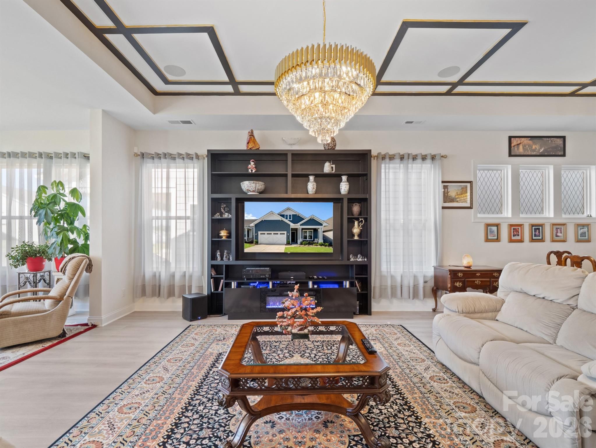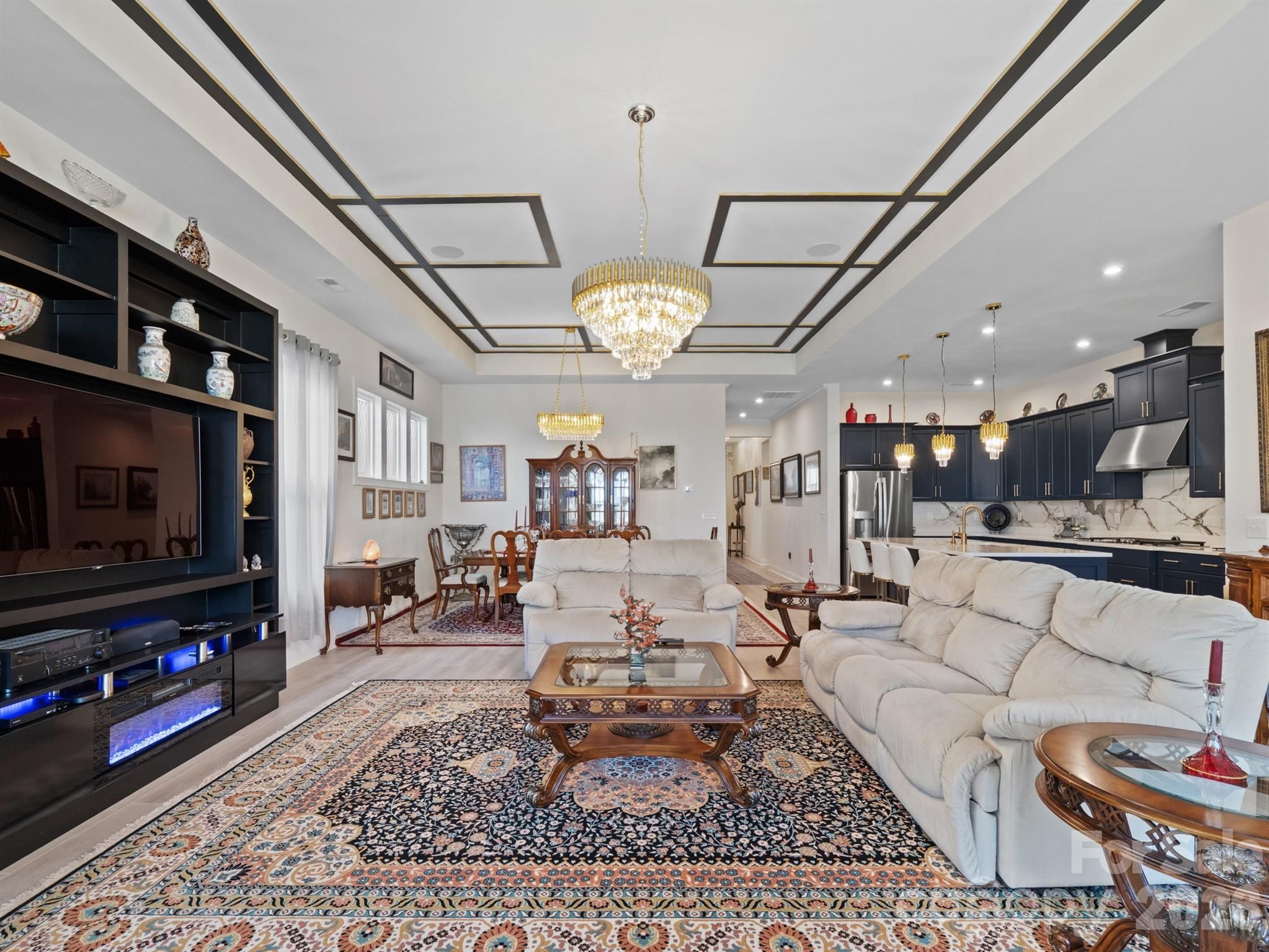Beautiful and meticulously maintained, this stunning home offers designer finishes, spacious living areas, and access to resort-style amenities. A private office with elegant French doors provides the perfect space for working from home or quiet study. The chef’s kitchen is a true highlight, featuring a massive island with a one-bowl sink, 5-burner gas cooktop, wall oven, walk-in pantry, quartz countertops, and a porcelain marble backsplash—ideal for both everyday living and entertaining. Natural light pours into the sunroom, which extends off the living room to create a bright and airy space perfect for lounging or hosting guests. The primary bedroom suite is a peaceful retreat with dual vanities, a large tiled shower, and a custom closet organizer designed for optimal storage and convenience. Secondary bedrooms are spacious and thoughtfully designed. Bedroom 2 includes its own private bathroom, making it perfect for guests or as a mother-in-law suite. Bedroom 3 offers a generous walk-in closet, providing plenty of storage space. Throughout the home, stylish design elements such as tray ceiling accents, updated chandeliers, and 7.5 -inch luxury vinyl plank (LVP) flooring elevate the overall aesthetic. Large-format tile in wet areas adds both beauty and durability. The garage is equally impressive, featuring gleaming epoxy flooring and a utility sink for easy clean-up. This home is conveniently located near Village Commons, offering quick access to shopping, dining, and everyday essentials. As part of a vibrant community, residents can enjoy a full suite of resort-style amenities including a clubhouse, art studio, swimming pool, pickleball, bocce ball, and tennis courts. From its functional layout and thoughtful upgrades to its unbeatable location and lifestyle offerings, this home truly has it all. Don’t miss the opportunity to make it yours!