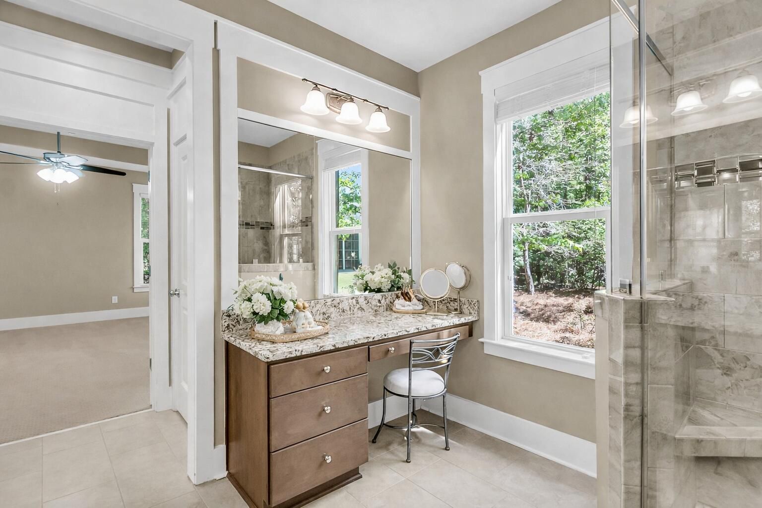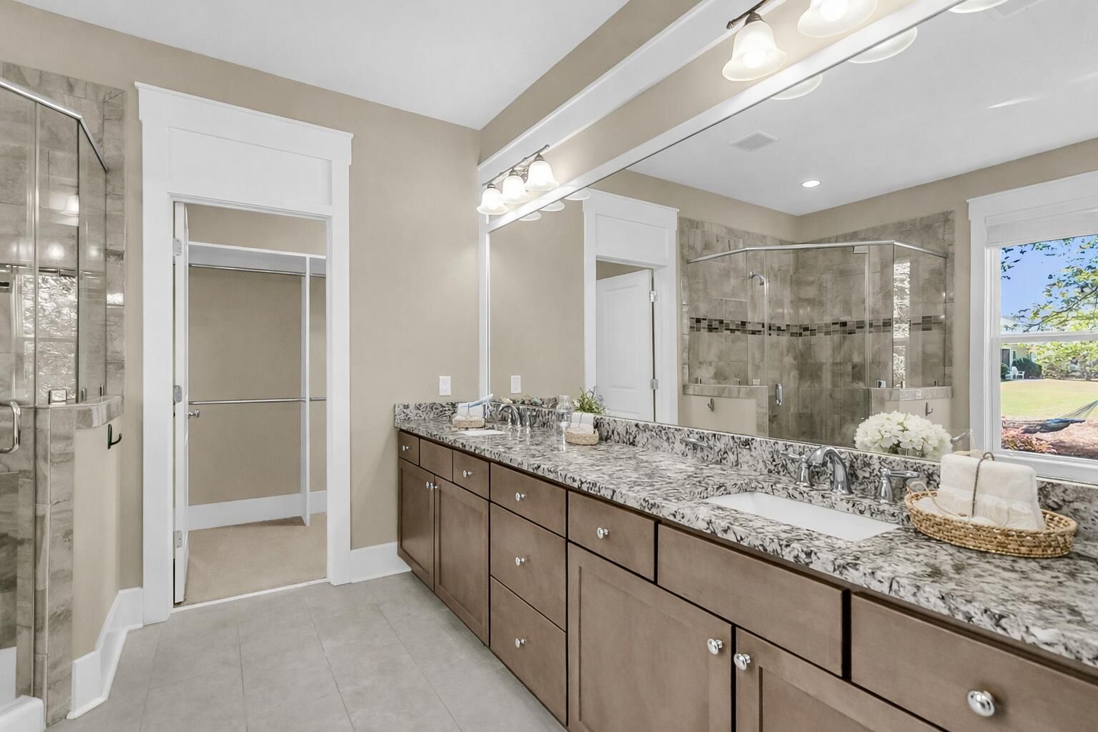 Welcome to Cresswind a gated 55+ living at its finest! This beautifully designed home showcases exceptional curb appeal with a stone-accented facade and welcoming front porch. Inside, the open-concept layout features tray ceilings, rich wood flooring, and a spacious great room with soaring ceilings, a gas fireplace, custom built-ins, and surround sound--perfect for both relaxing and entertaining. The gourmet kitchen is a standout, offering a large center island, gas range, gas wall oven with microwave, granite countertops, and an expansive custom walk-in pantry. Enjoy casual meals in the sunlit breakfast area or unwind in the bright sunroom overlooking a beautifully landscaped yard and peaceful wooded backdrop. The private owner's suite is a true retreat, complete with a spa-inspired bathfeaturing dual vanities, a walk-in shower, and a large custom-designed closet. The main level also includes a built-in office nook, Jack-and-Jill guest bedrooms with individual vanities, an oversized laundry room, and an all- season screened porch with tinted panels, ceiling fans and a vaulted ceiling. Upstairs, a spacious bonus room with a full bath and walk-in closet provides flexible living space--ideal for guests, hobbies, or a private getaway. This home is thoughtfully positioned deep on the lot, with an extended driveway that creates a striking and impressive approach. Enjoy low-maintenance, resort-style living in an amenity-rich community--this is one you don't want to miss!