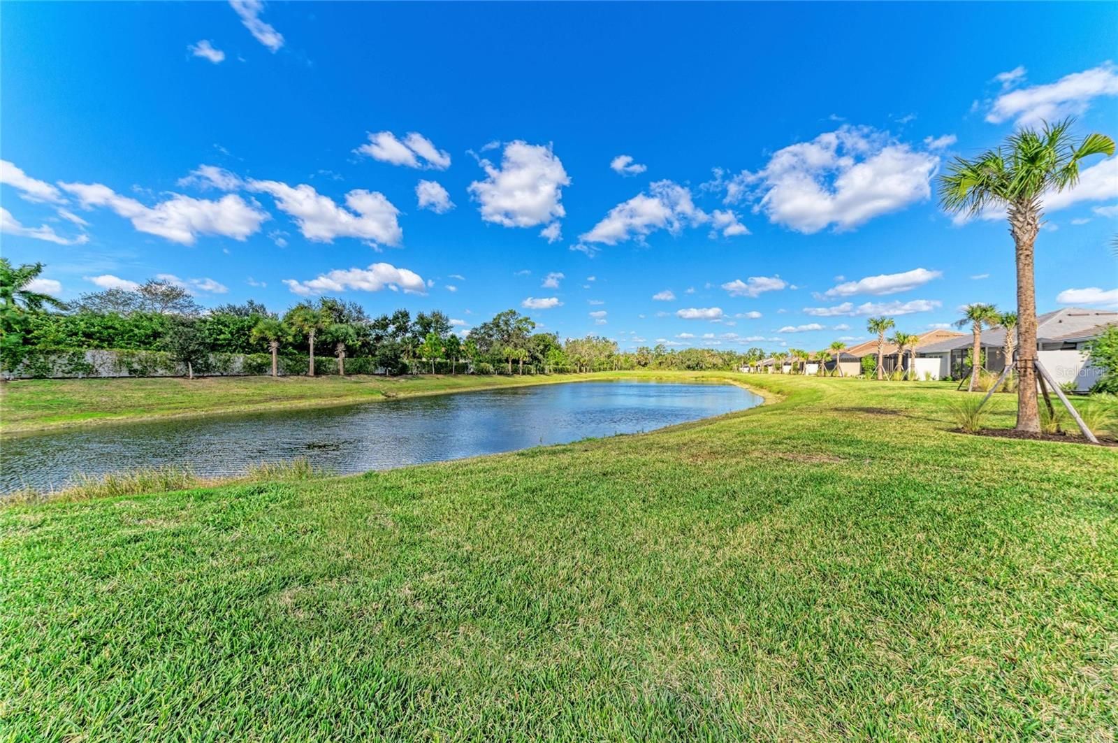 Like-new 2025 coastal-inspired WATERFRONT twin villa with breathtaking water views on a private dead-end street in the gated Esplanade at The Heights. This move-in-ready Ibis floor plan by Taylor Morrison features a sleek flat tile roof, rare water-access lot with a spacious backyard, 2 bedrooms, 2 bathrooms, and a versatile den/study that can serve as a 3rd bedroom, offering a fresh, modern alternative to older Mediterranean elevations. This light-filled home features IMPACT RESISTANT windows and sliding glass doors for energy efficiency, storm protection, and year-round comfort. The open Gathering Room showcases a tray ceiling with four recessed lights and sliders leading to the screened-in lanai with gorgeous and tranquil water views. The chef’s kitchen includes natural gas cooking, quartz countertops, a stainless-steel farmhouse sink, upgraded 42” cabinetry, a closet pantry, and pendant lighting over the breakfast bar. The dining area with tray ceiling is perfect for entertaining. The private primary suite features peaceful water views from the row of windows, a tray ceiling, newer laminate flooring, a spa-like en-suite bath with frameless glass shower, grab bars in water closet, and a large walk-in closet. The guest bedroom includes newer laminate flooring, its own en-suite bath, walk-in closet and is located near the study/den with pocket doors, tray ceiling and recessed lighting. Additional highlights include a customized laundry room with newer washer/dryer and pre-plumbing for sink, 8-foot doors throughout, no carpeting, smart home features, and a two-car garage with newer epoxy flooring and a reinforced storm-rated door. Builder’s bumper to bumper warranty and mechanical warranty remains in effect and can be transferred to a new homeowner. Enjoy the Esplanade resort-style living with a clubhouse, spa, fitness center, lifestyle manager, heated pool, tennis, pickleball, bocce courts, scenic trails on Mount Tumalo, and Bark Park with exercise stations. Conveniently located near UTC, downtown Sarasota & Bradenton, I-75, Gulf beaches, top-rated schools—and NO CDD FEES.