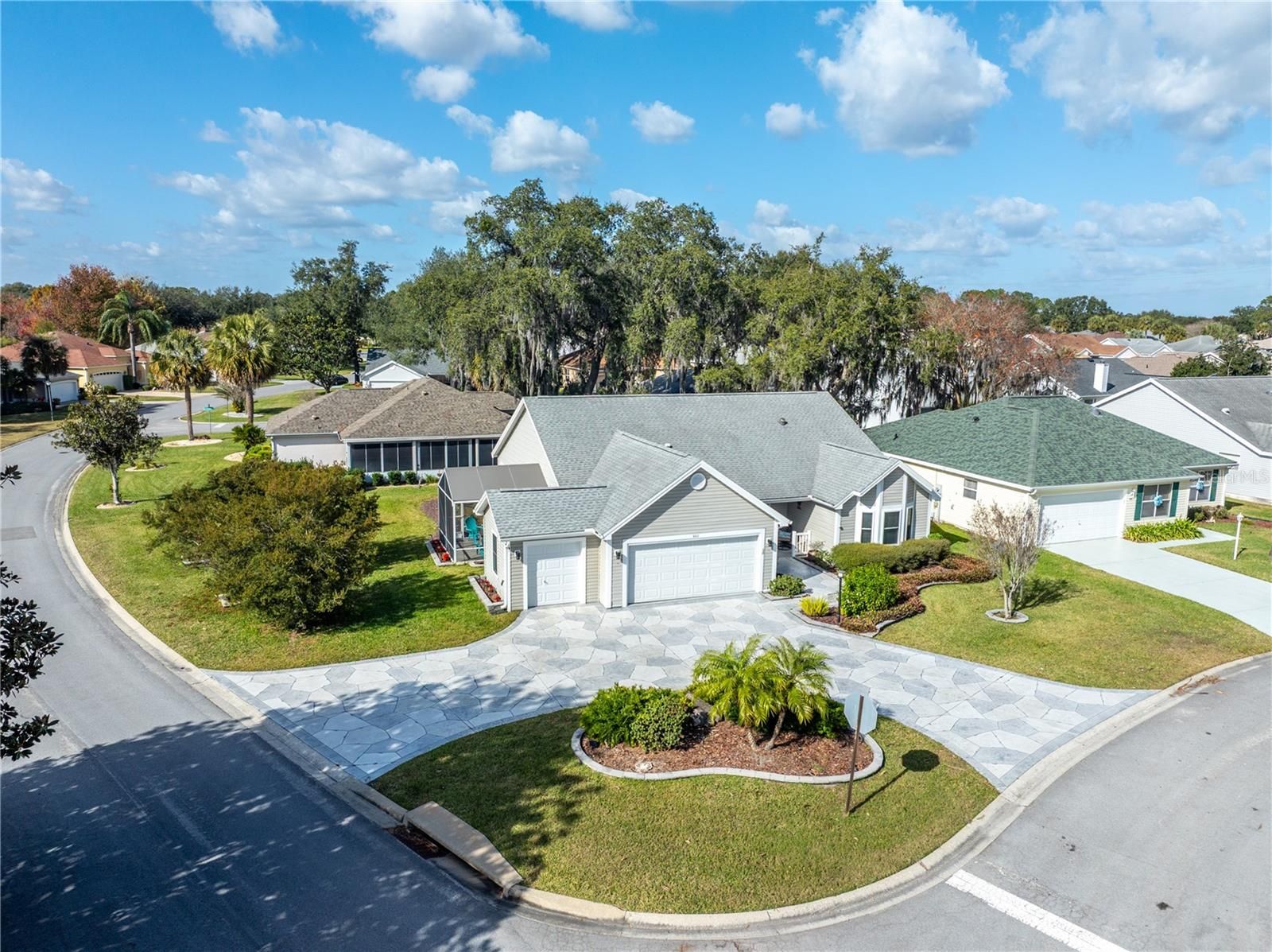 Lovely 2-bedroom, 2 bath home with den located on a spacious corner lot in the Village of De La Vista. This pristinely maintained home has a stamped concrete crescent driveway and attractive landscaping with concrete edging and boasts a 2-car garage as well as a golf cart garage for added convenience. The double door entry opens to a Grand Ficus open floor plan with pretty, laminate flooring and tile throughout. The kitchen has granite countertops, beautiful glass tile backsplash, stainless steel appliances and crown molding on the cabinets. A handy breakfast nook sits adjacent to the kitchen with lots of windows allowing natural light to flow in. The breakfast nook and den have plantation shutters as well. The dining room has sliding glass doors leading to a paver back patio, and the den opens to a covered and screened lanai. The spacious master suite boasts a dual vanity, granite countertops, a linen closet and a large walk-in closet. Other pluses include central vacuuming, NO BOND, and the location is conveniently close to Lake Sumter Landing and Spanish Springs in addition to quick access to Morse Boulevard. This is a beautiful home that is move-in ready! Roof is 11 years old, A/C is 4 years old and the Water heater is 3 years old.
