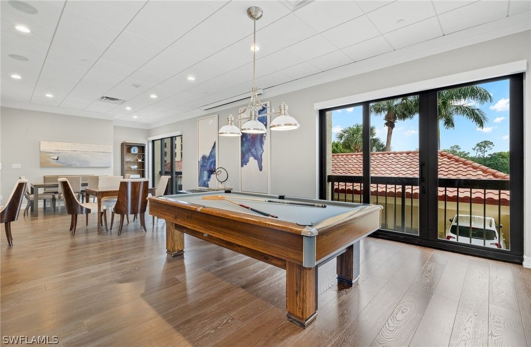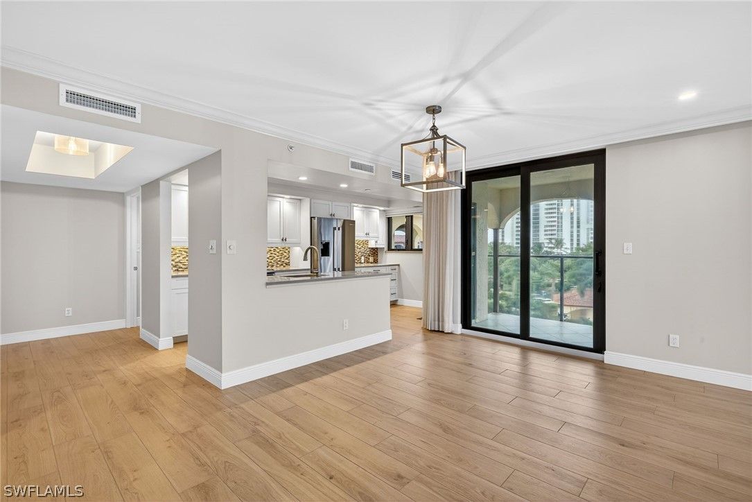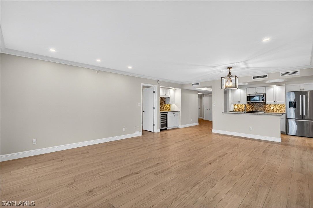 Set high above it all, this top-floor corner residence delivers a rare sense of quiet, space, and visual drama. From nearly every angle, sweeping views unfold across shimmering lake waters, manicured golf greens, glowing sunsets, and the soft sparkle of evening lights. A generous wraparound lanai of approximately 440 feet captures cooling cross-breezes and creates a seamless indoor–outdoor living experience. Inside, the home has been thoughtfully reimagined with warm wood-look tile flooring and a refined, contemporary aesthetic. The updated kitchen features quartz countertops, Bosch appliances, soft-close cabinetry with roll-out storage, and a built-in workspace ideal for remote work or everyday planning. The owner’s suite is both spacious and serene, highlighted by a redesigned bath with a frameless glass shower, dual quartz-topped vanities, and a walk-in closet. Hurricane-rated sliding doors provide added peace of mind, while recent upgrades—including the HVAC system, water heater, washer, and dryer—enhance comfort and reliability. Located within Chateaumere, a beautifully maintained 10-acre enclave, residents enjoy three resort-style pools and spa, an award-winning community room, fitness facilities, an active social calendar, guest suites, under-building parking, and attentive on-site management. Just moments away, Pelican Bay offers exclusive access to private beach clubs with two beachfront dining options, cabana service, and world-class tennis, along with an upcoming racquets center featuring pickleball and Har-Tru courts. The location is exceptional, with close proximity to Waterside Shops, Artis–Naples, Mercato, and some of Naples’ most acclaimed dining and cultural destinations. This residence offers an elevated lifestyle defined by views, comfort, and one of Naples’ most desirable coastal settings.