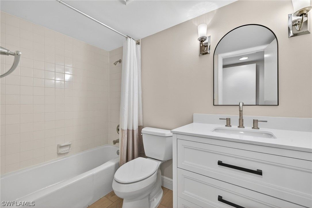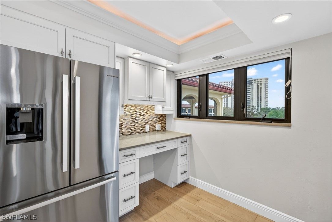 Set high above it all, this top-floor corner residence delivers a rare sense of quiet, space, and visual drama. From nearly every angle, sweeping views unfold across shimmering lake waters, manicured golf greens, glowing sunsets, and the soft sparkle of evening lights. A generous wraparound lanai of approximately 440 feet captures cooling cross-breezes and creates a seamless indoor–outdoor living experience. Inside, the home has been thoughtfully reimagined with warm wood-look tile flooring and a refined, contemporary aesthetic. The updated kitchen features quartz countertops, Bosch appliances, soft-close cabinetry with roll-out storage, and a built-in workspace ideal for remote work or everyday planning. The owner’s suite is both spacious and serene, highlighted by a redesigned bath with a frameless glass shower, dual quartz-topped vanities, and a walk-in closet. Hurricane-rated sliding doors provide added peace of mind, while recent upgrades—including the HVAC system, water heater, washer, and dryer—enhance comfort and reliability. Located within Chateaumere, a beautifully maintained 10-acre enclave, residents enjoy three resort-style pools and spa, an award-winning community room, fitness facilities, an active social calendar, guest suites, under-building parking, and attentive on-site management. Just moments away, Pelican Bay offers exclusive access to private beach clubs with two beachfront dining options, cabana service, and world-class tennis, along with an upcoming racquets center featuring pickleball and Har-Tru courts. The location is exceptional, with close proximity to Waterside Shops, Artis–Naples, Mercato, and some of Naples’ most acclaimed dining and cultural destinations. This residence offers an elevated lifestyle defined by views, comfort, and one of Naples’ most desirable coastal settings.