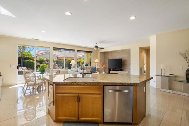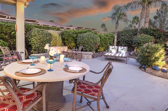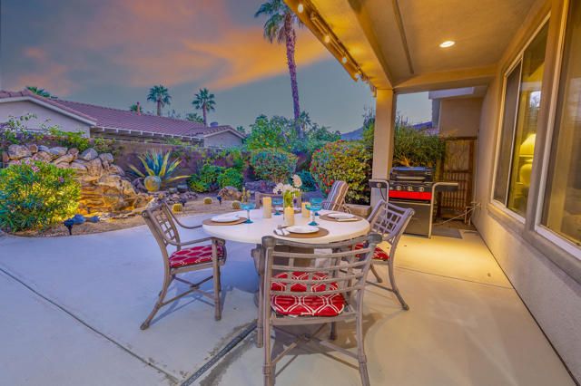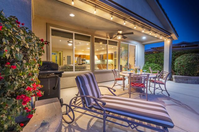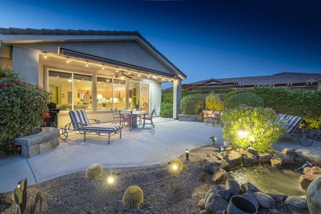 Beautifully designed and freshly updated this popular Monterey model with 1,693 SQ FT, 2-spacious bedrooms, 2-full bathrooms, and a sunny multi-purpose den with a sliding barn door to be used as a 3rd bedroom, office, or both. Located in the 55+ gated golf course community of Trilogy at La Quinta, this home is situated on large 7,840 SQ FT lot with a deep front on a small cul-de-sac and is brilliantly positioned to capture spectacular west-facing, mountain and sunset views from the expansive front courtyard, and east to south facing views from the private backyard. The home incorporates elevated design elements in an inspired blend of modern and classic styles, and the home is available turnkey furnished (per inventory). The classic and popular stucco exterior of the home features a seamless flow between indoor and multiple outdoor patio spaces. The property enters through a custom stack stone wall and wrought iron gateway into a spacious and welcoming courtyard with custom paver decking. Walk into the foyer and immediately experience the airy feeling of the open concept floor plan, the nine-foot ceilings, gleaming porcelain floors, and wall of windows that overlook the outdoor covered patio, soothing waterfalls, custom built-in fire pit, and beautiful mature desert landscaping. The custom automated awning extends the covered patio for comfortable dining and entertaining almost year-round. The great room is roomy and bright, with a large recessed media area that can easily accommodate future custom built-ins and even the largest of home theatre TV's. Spacious and updated, the kitchen is delightful and efficient with newer stainless appliances, including a pro grade 5-burner cooktop with custom range hood, refrigerator, microwave, and dishwasher, and water filtration. Perfect for cooking and entertaining, the kitchen has an abundance of rich wood cabinets and a pantry for storage. Custom polished granite countertops adorn the large kitchen island with counter seating and blends seamlessly with the custom glass tile backsplash. Slide out drawers keep pots and pans, cooking appliances right at hand. The den overlooks the front patio and mountain views. Light and cheerful with tall arched windows and shutters, an attractive barn door makes the room perfect for use as a 3rd bedroom for guests. The primary bedroom suite is spacious with picture windows overlooking the back yard landscape and rock waterfalls. The bathroom is updated with a contemporary flair.