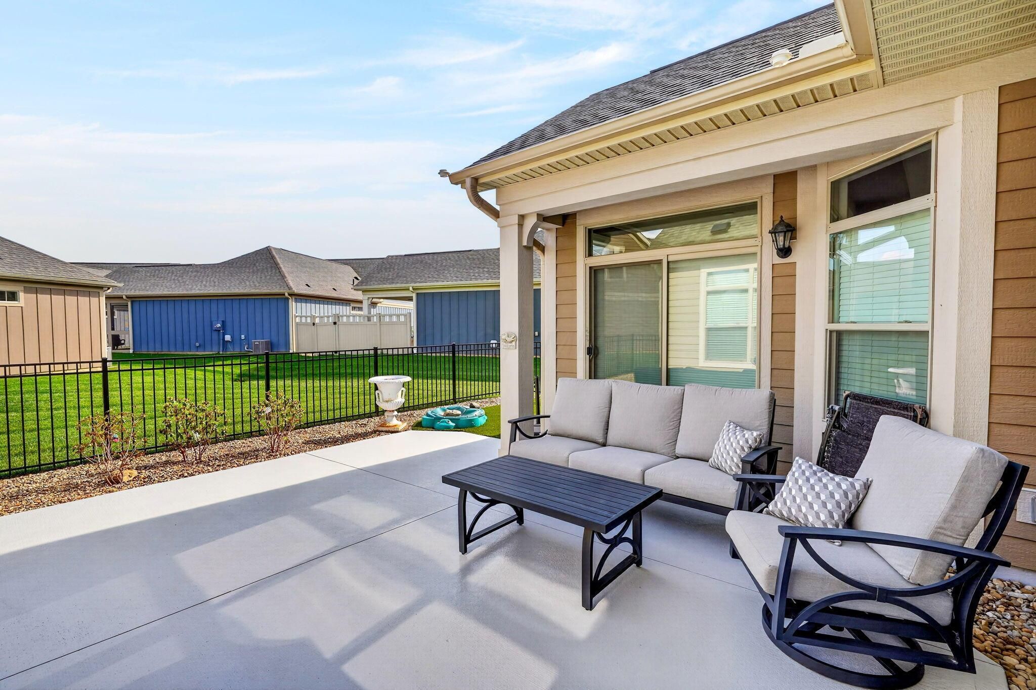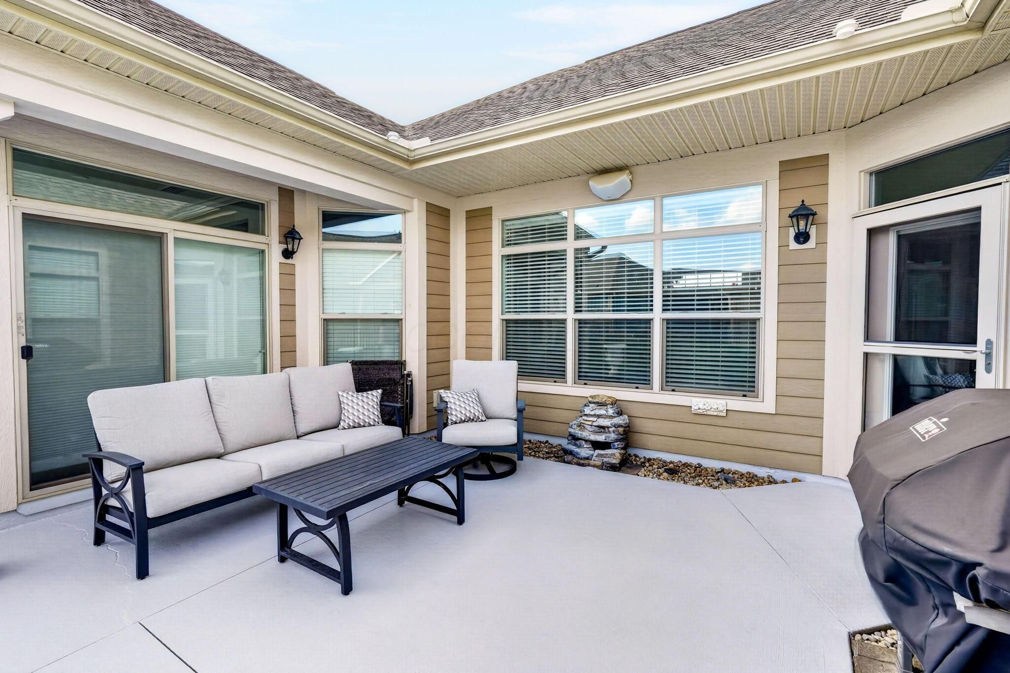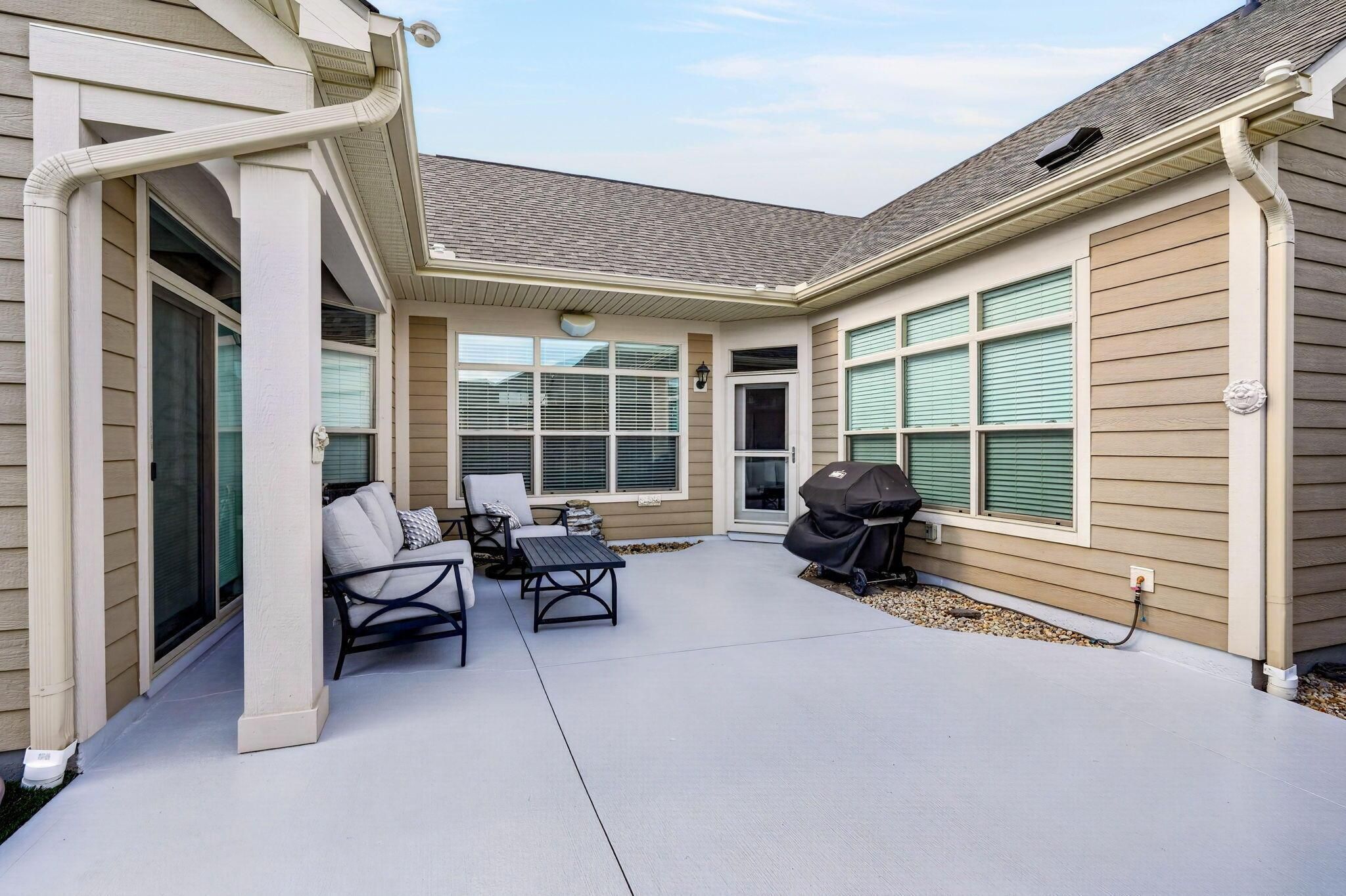 Single story condo in desirable Courtyards on Hyatt's! This beautiful Portico model, built by Epcon Communities, is situated on a large corner lot with long concrete driveway, a covered front porch, and is surrounded by lush green space. Interior features include tray ceilings, transom windows, upgraded trim package with crown molding & solid core doors, and a whole house surround system. The main living areas feature premium LVP flooring, upgraded carpeting & pad in the bedrooms and tile flooring in the bathrooms and laundry room. The living room features a gas log fireplace with custom built-in shelving on both sides, a lighted ceiling fan and views of the fenced courtyard and open green space. The well appointed kitchen offers a Deluxe layout, a large center island, granite counter tops, stainless steel appliances, gas cook-top, double ovens, tile back splash, can and pendant lighting. The dining room & den are just steps away and both have views of the outdoor living! The spacious primary bedroom with tray ceilings & lighted ceiling fan, has an added sitting room for additional flex space with patio doors leading the the courtyard. The primary closet has been upgraded with custom built-ins for premium storage. The primary bath offers raised vanity, double sinks, framed mirrors and a walk-in tile shower with transom window. The guest bedroom & bathroom are conveniently located at the front of the home for privacy for guests. The courtyard offers painted concrete, open view fencing and Sylawn turf. Community amenities include a clubhouse with gathering space for social activities, a fitness room, a swimming pool, sidewalks, Bocce ball and pickleball courts and a community garden.