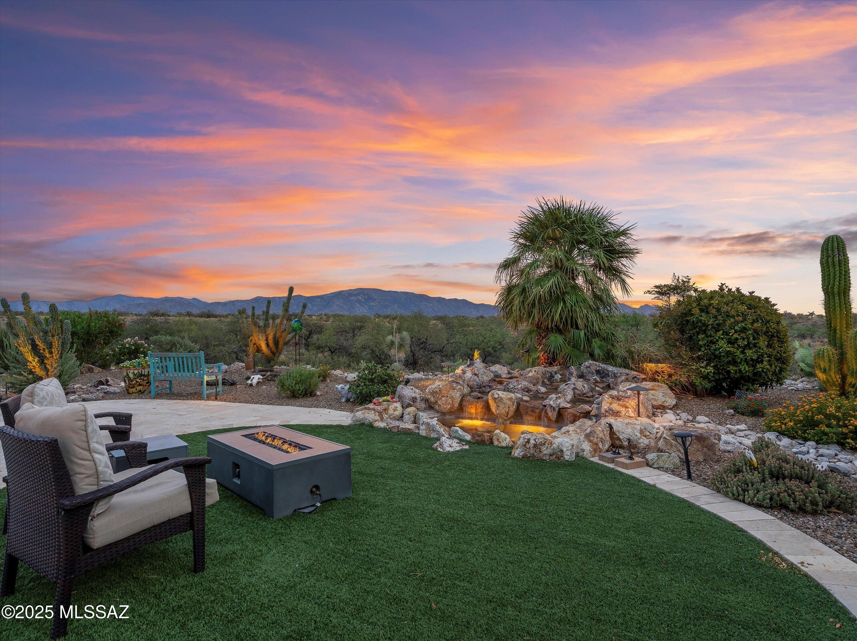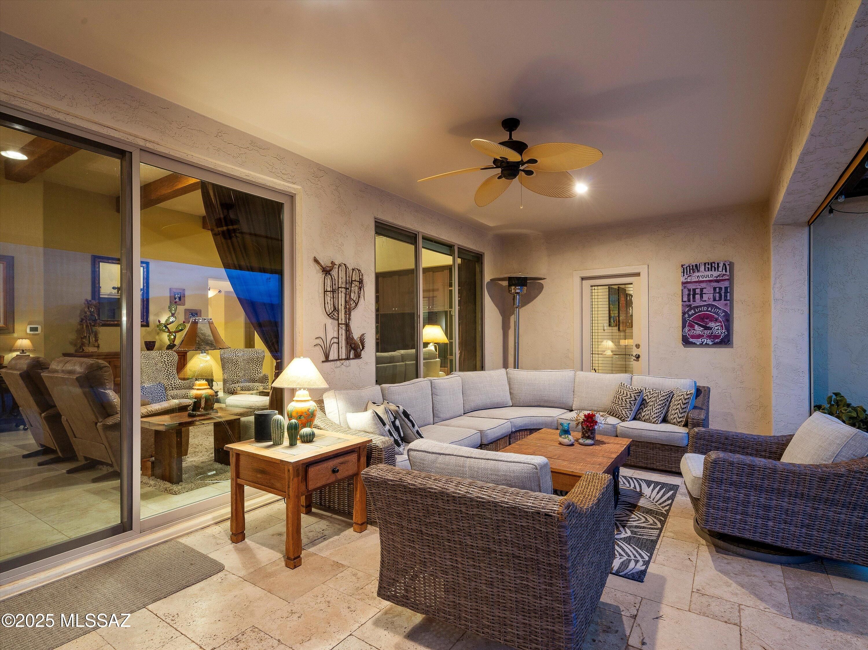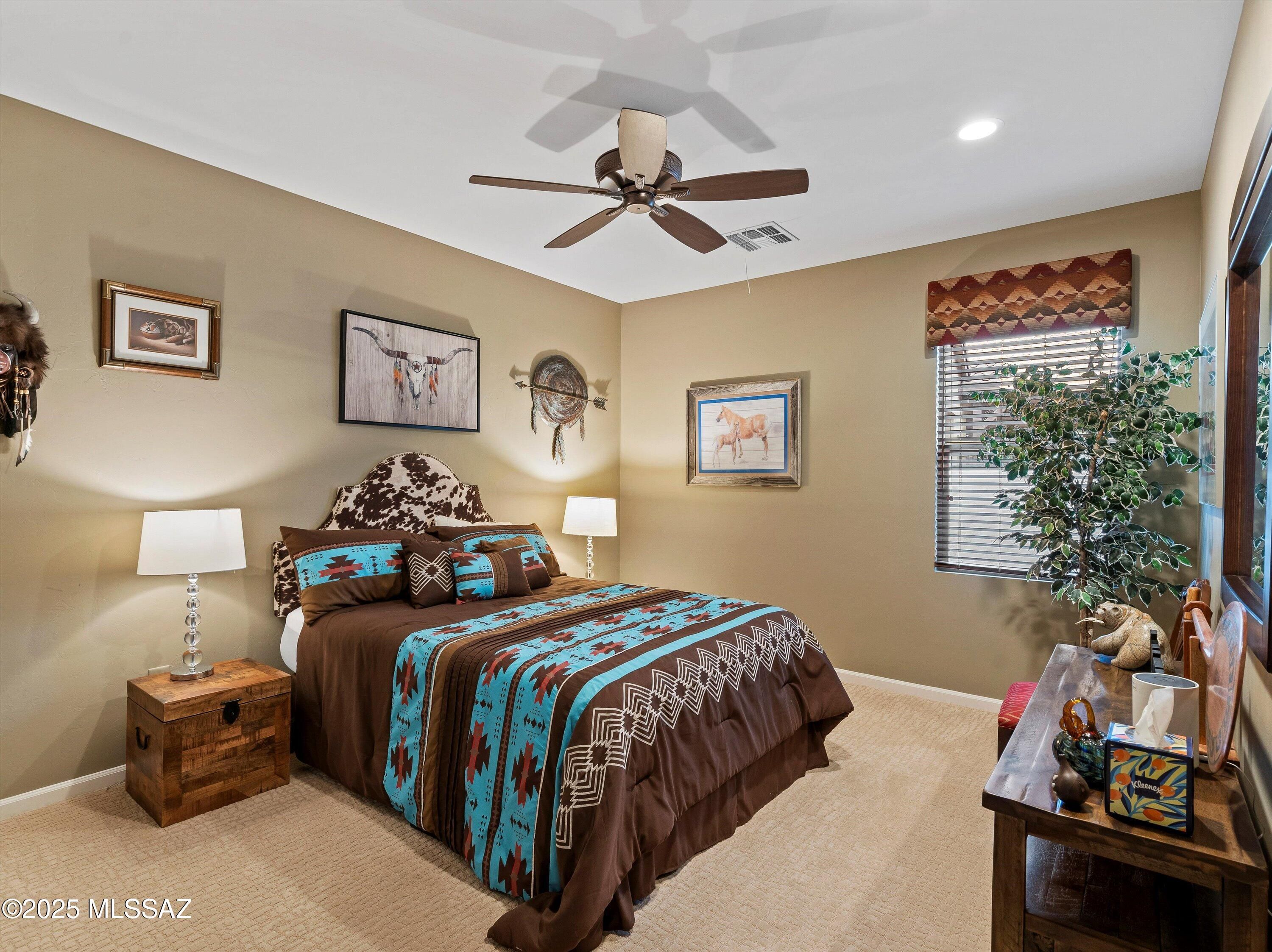 Currently-accepted offer is contingent upon Buyer selling home, other offers can be submitted/accepted.Enjoy breathtaking panoramic mountain views from your extended travertine patio, perfect for outdoor entertaining. This highly upgraded Pima model has a special casita hobby room that makes a wonderful retreat & hobbyist's dream! The gourmet kitchen features a sleek induction cooktop, full tile backsplash, dual roll-out base cabinets, a lazy Susan, Edison pendant lighting, solar tube, & a spacious walk-in pantry. The adjacent laundry room is equally impressive, offering full cabinetry, a convenient hang bar, & built-in ironing board for seamless functionality. The primary bedroom features a door for easy access to the patio, bay window, a soaking tub & separate shower,