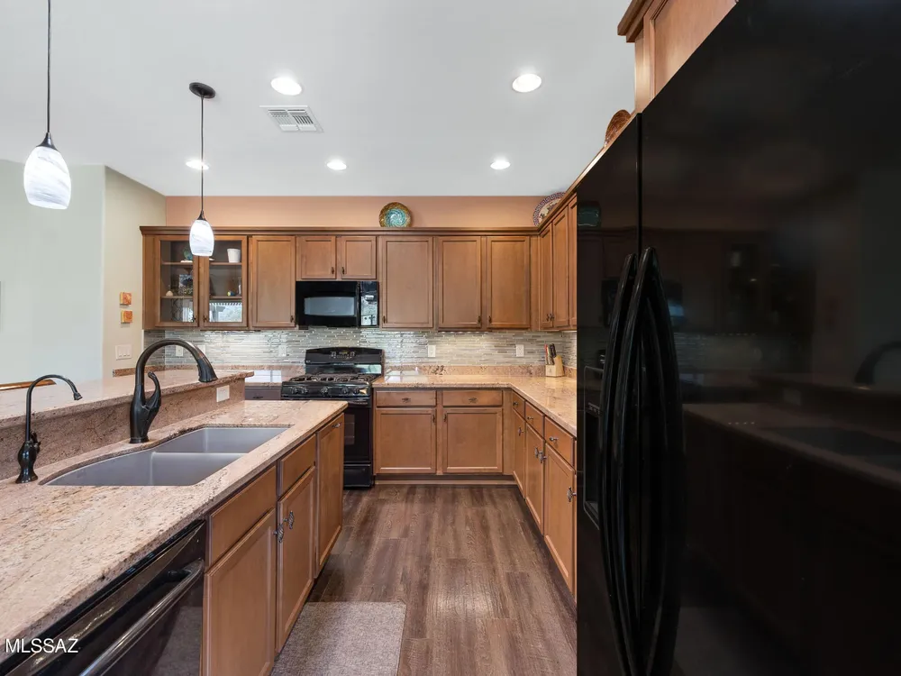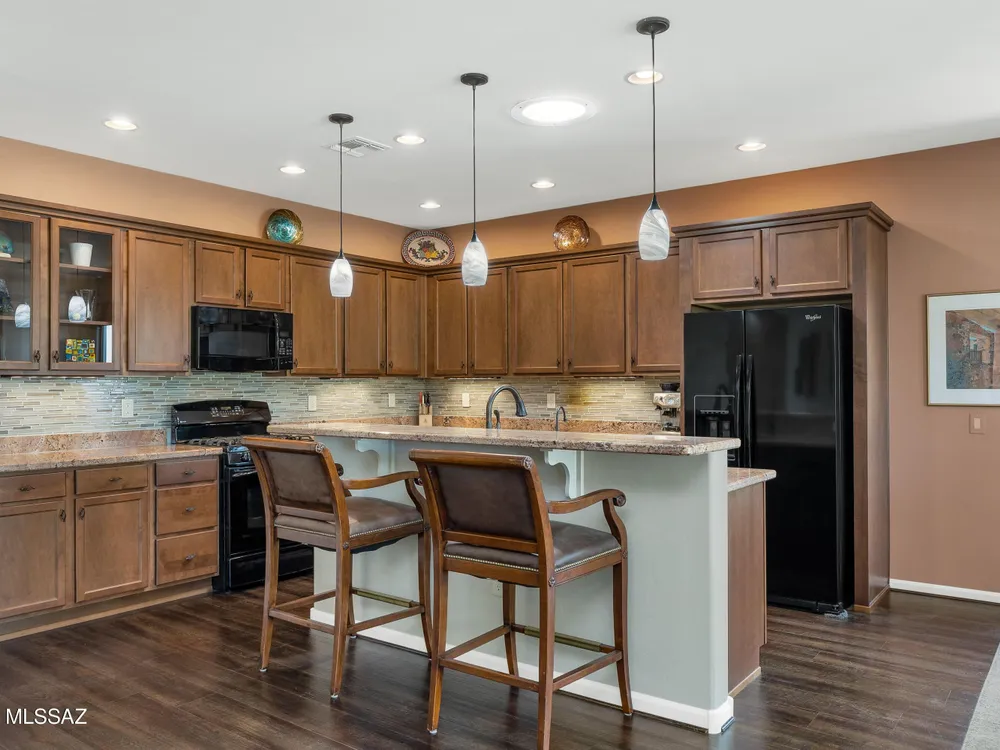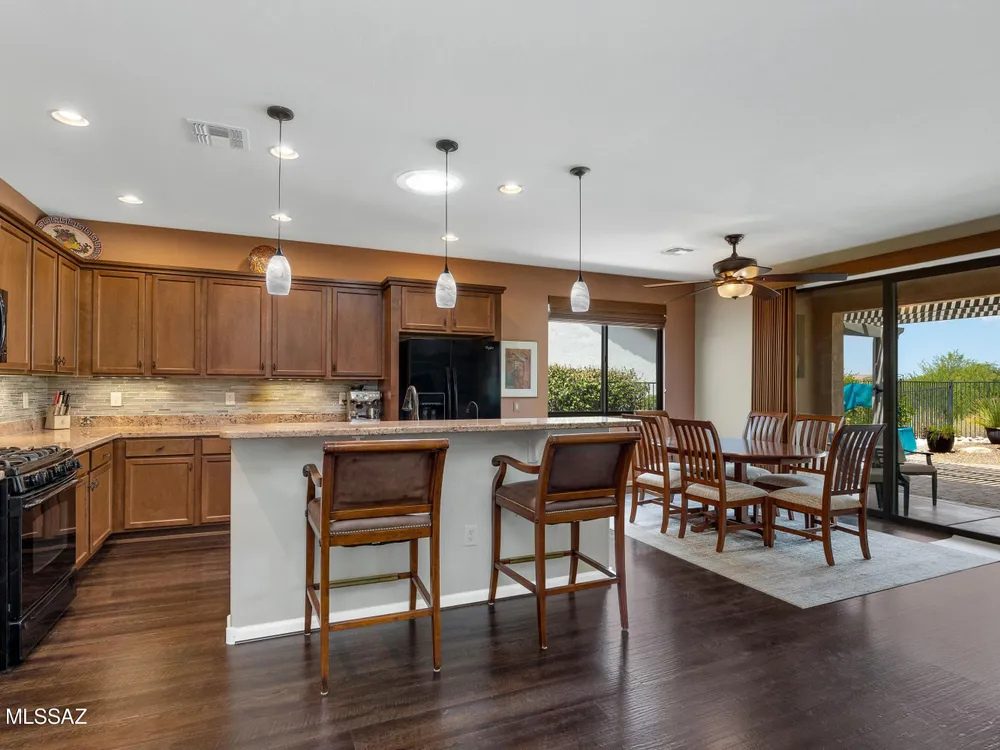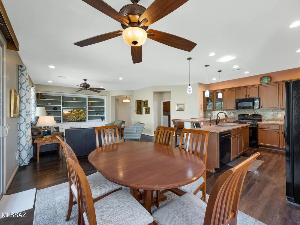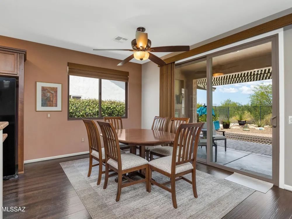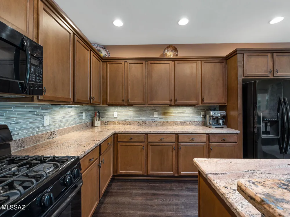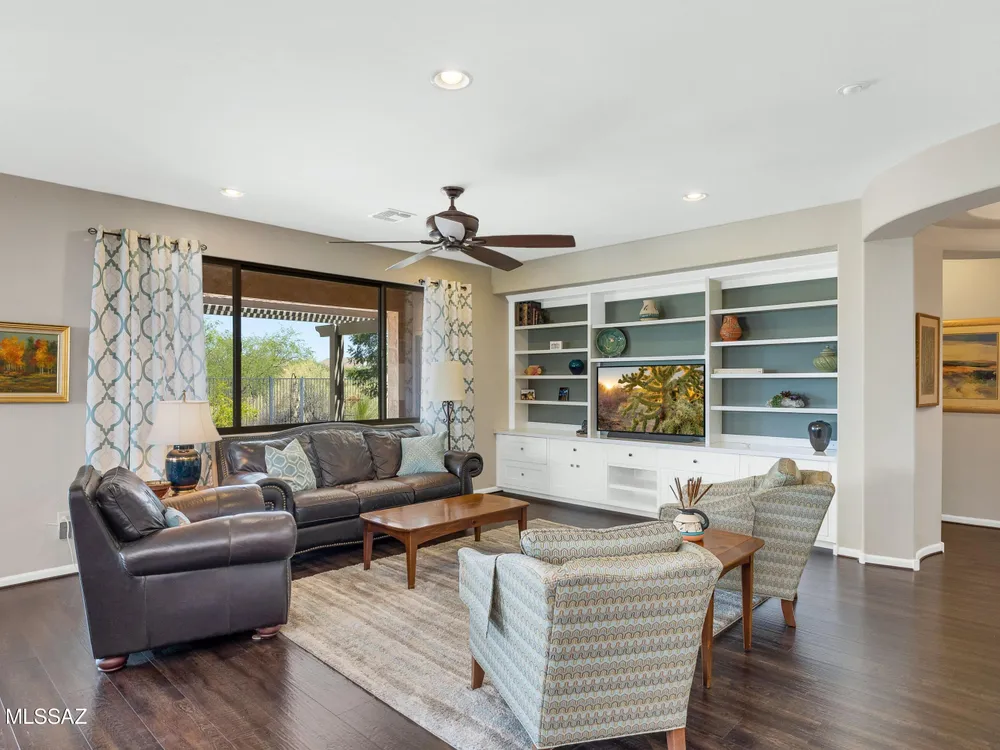 2012 Mateo with Private Yard & Nature Behind! Paver Courtyard & Custom Entry Door. Open Concept Living! Great Room has custom Built-in Media Wall. Dining Area has Slider to Patio. Kitchen has Granite Counters, Black Appliances, Gas Range, Cabinets with Tile Backsplash, Island, & Under Sink R/O System. Owner's Suite has Bay Window & Patio Door. Owner's Bathroom has Walk-in Shower & Closet. Guest Bedroom has Bay Window & Walk-in Closet. Guest Bathroom nearby. Laundry Room has W/D, Sink & Cabinets. Kinetico Whole House Water System & 3 Solar Tubes. Engineered Wood Flooring & Tile in Laundry Room & Bathrooms. Extended 2.5 Car Garage has Cabinets & Work Bench. Covered Patio with Gas Fireplace. Pergola & Extended Paver Patio. Gated Yard has Lovely Landscaping & Tortolita Sunset Views to enjoy!