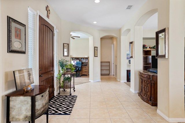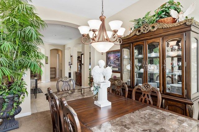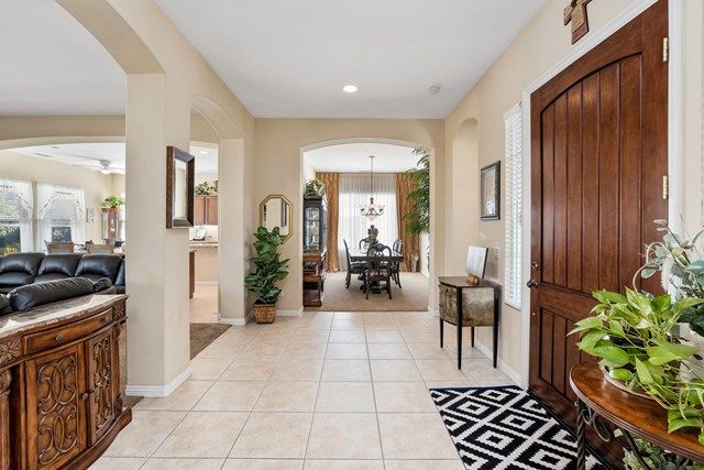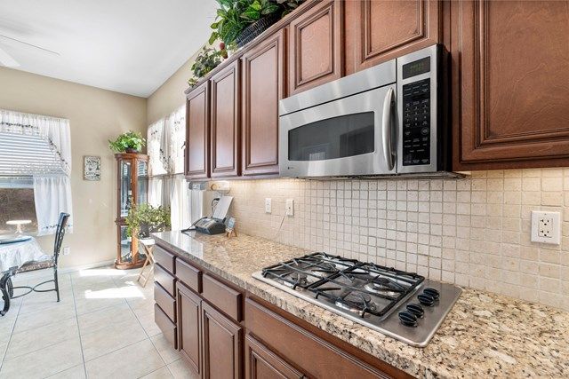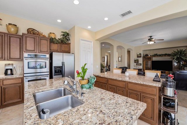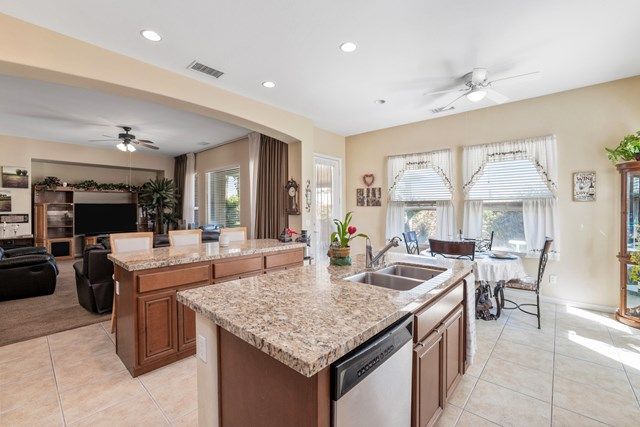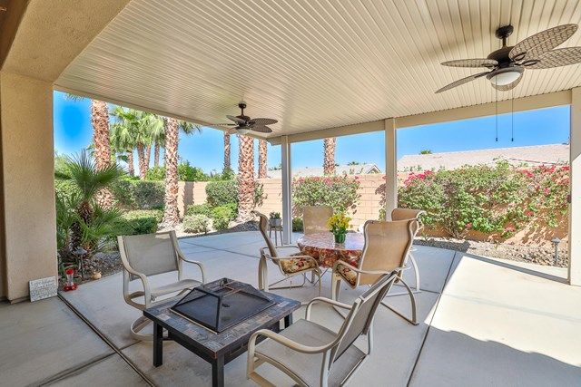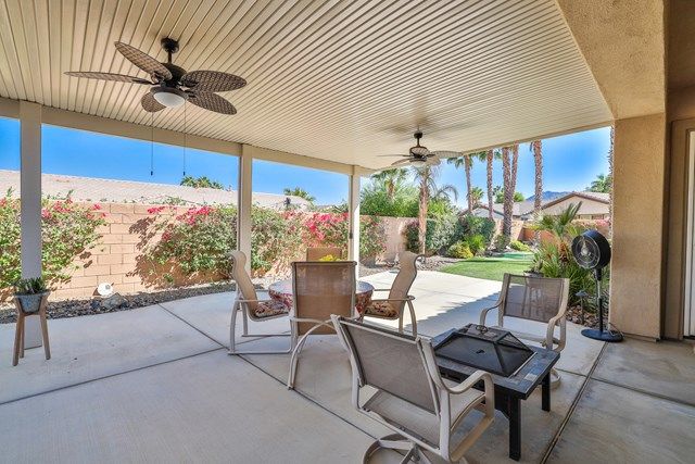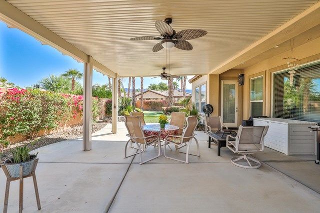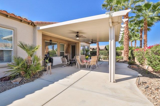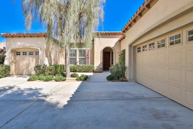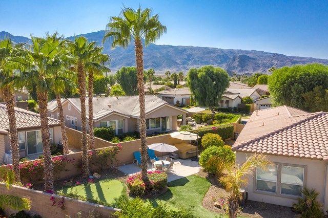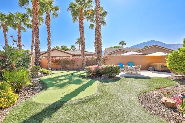 This beautiful Oreas Plan offers a split floorplan of two bedrooms, each with private en-suites as well as a spacious office or den, a formal dining room and large living room into the kitchen which features double islands, stainless steel appliances, custom backsplash, walk in pantry and ceramic tile throughout. The master bathroom includes dual vanities and a large walk in closet. The beautiful backyard can be accessed via the master bedroom or the kitchen, to which you will find an oversized patio with alumiwood patio cover, luscious mature landscaping, fruit trees and an incredible private putting green! Many evenings could be enjoyed in this fantastic yard with Santa Rosa mountain views. A two car garage plus separate detached golf cart garage provide ample storage! Located on an oversized lot and just a short distance to the clubhouse in the fabulous 55+ community of Trilogy, which offers an indoor and outdoor pool, spa, cabanas, fully equipped fitness center, tennis, pickle ball, bocce ball courts, a library, game room, movie theater, restaurant and incredible golf course, host of the Skins game!
