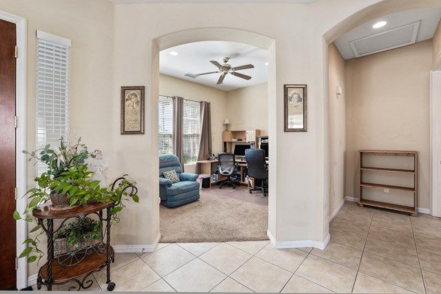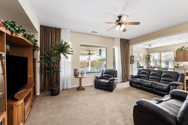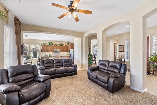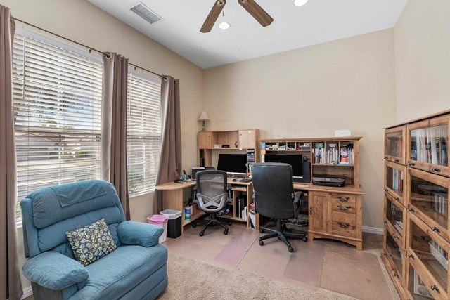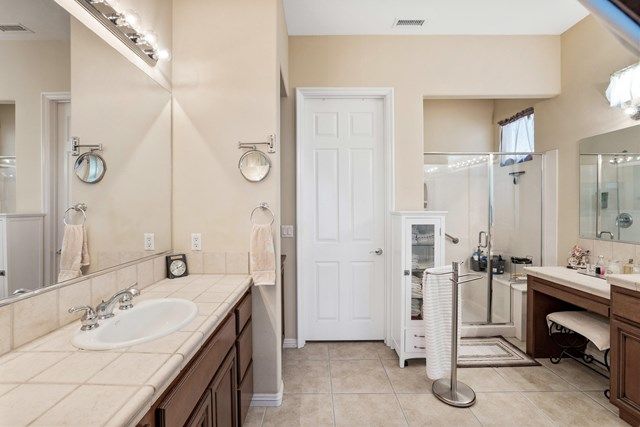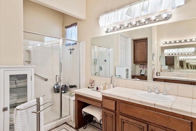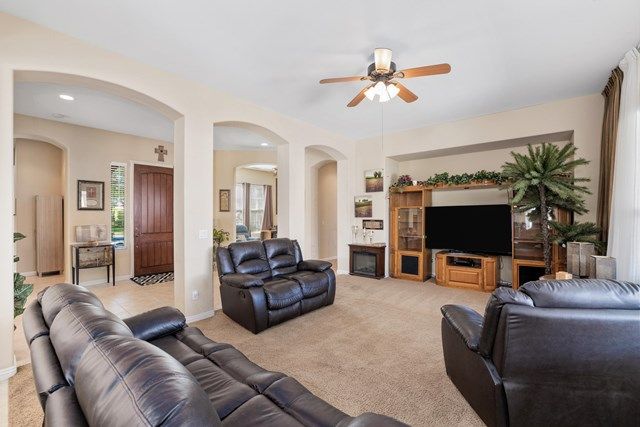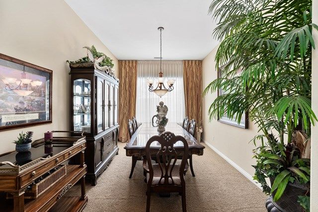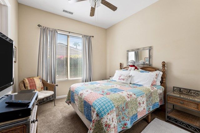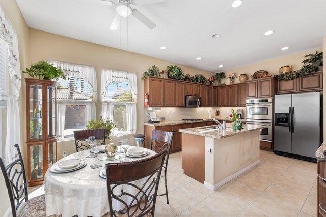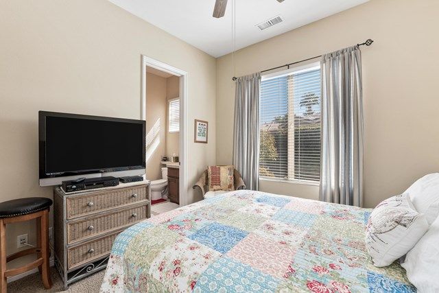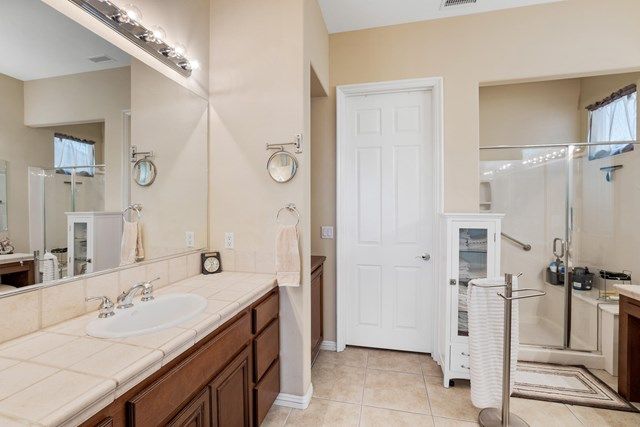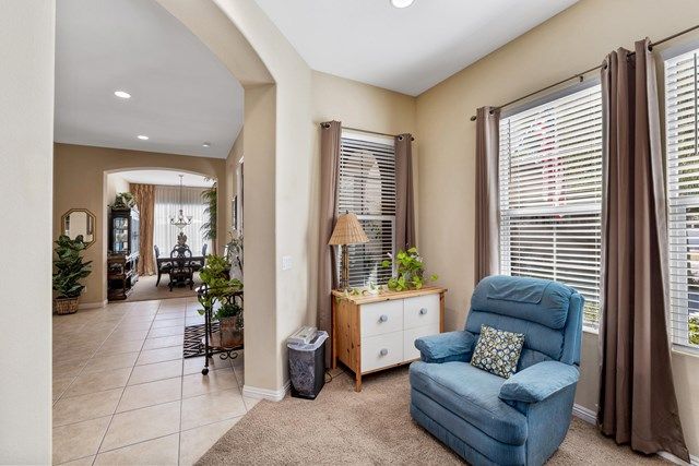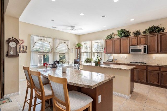 This beautiful Oreas Plan offers a split floorplan of two bedrooms, each with private en-suites as well as a spacious office or den, a formal dining room and large living room into the kitchen which features double islands, stainless steel appliances, custom backsplash, walk in pantry and ceramic tile throughout. The master bathroom includes dual vanities and a large walk in closet. The beautiful backyard can be accessed via the master bedroom or the kitchen, to which you will find an oversized patio with alumiwood patio cover, luscious mature landscaping, fruit trees and an incredible private putting green! Many evenings could be enjoyed in this fantastic yard with Santa Rosa mountain views. A two car garage plus separate detached golf cart garage provide ample storage! Located on an oversized lot and just a short distance to the clubhouse in the fabulous 55+ community of Trilogy, which offers an indoor and outdoor pool, spa, cabanas, fully equipped fitness center, tennis, pickle ball, bocce ball courts, a library, game room, movie theater, restaurant and incredible golf course, host of the Skins game!