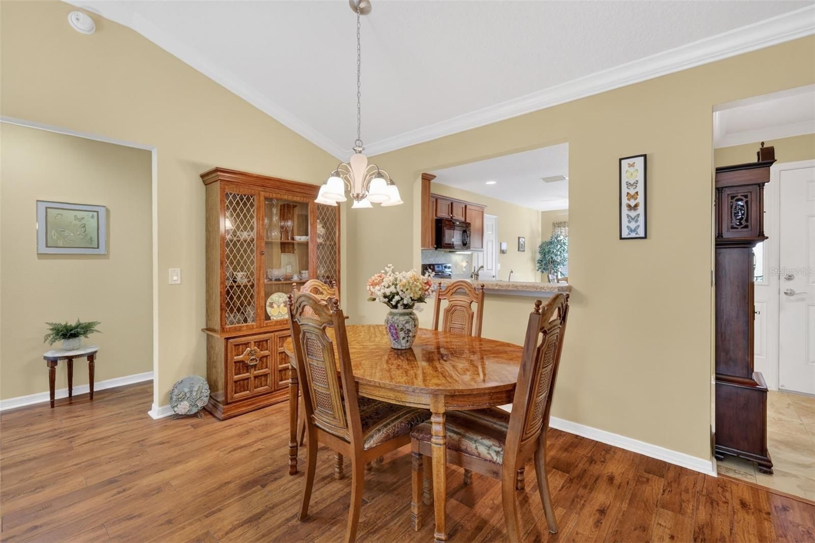 - Ceiling Fan(s), Crown Molding, Eat-in Kitchen, High Ceilings, Living/Dining Room, Open Floorplan, Main Level Primary, Solid-Wood Cabinets, Thermostat, Vaulted Ceiling(s), Walk-In Closet(s), Window Treatments