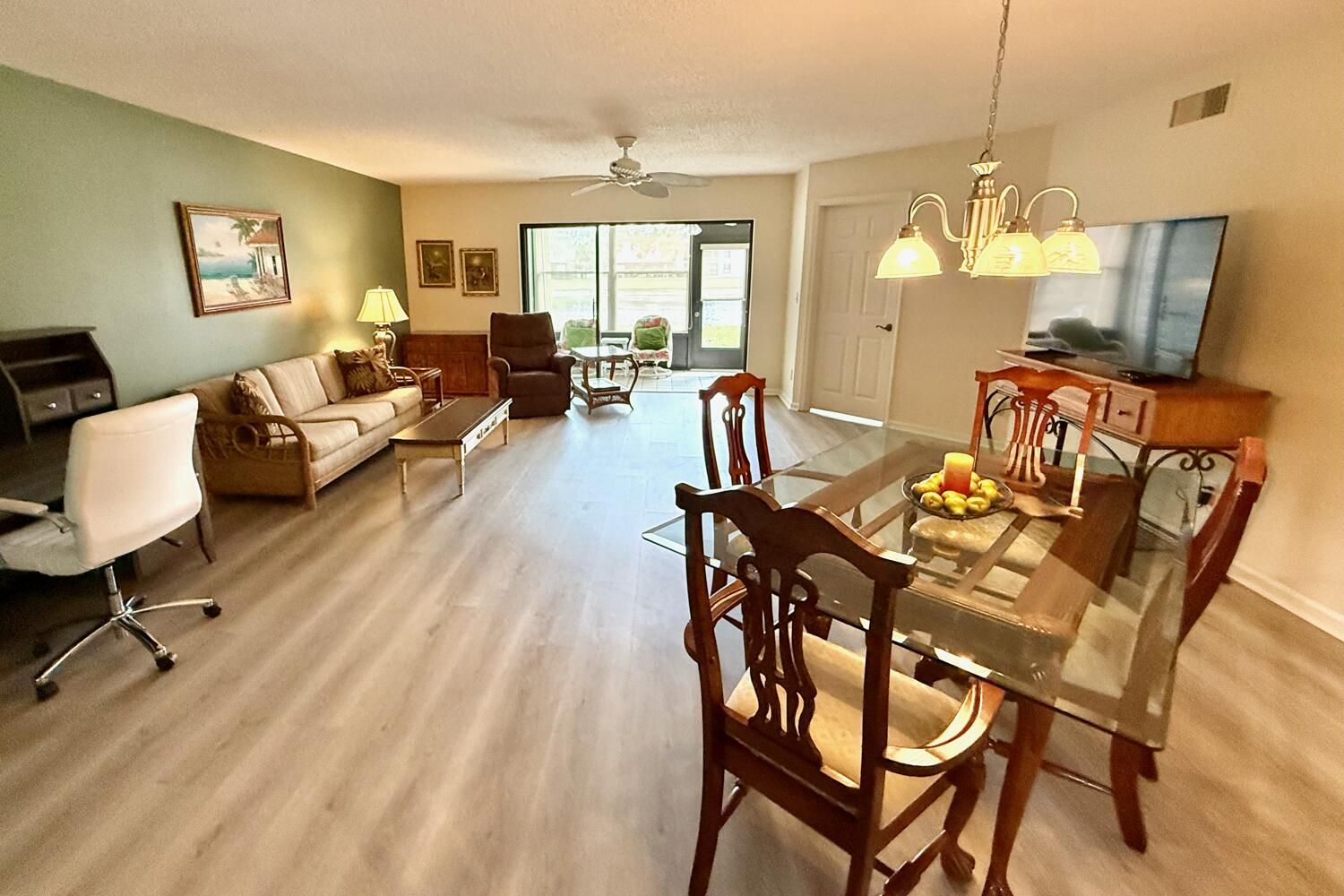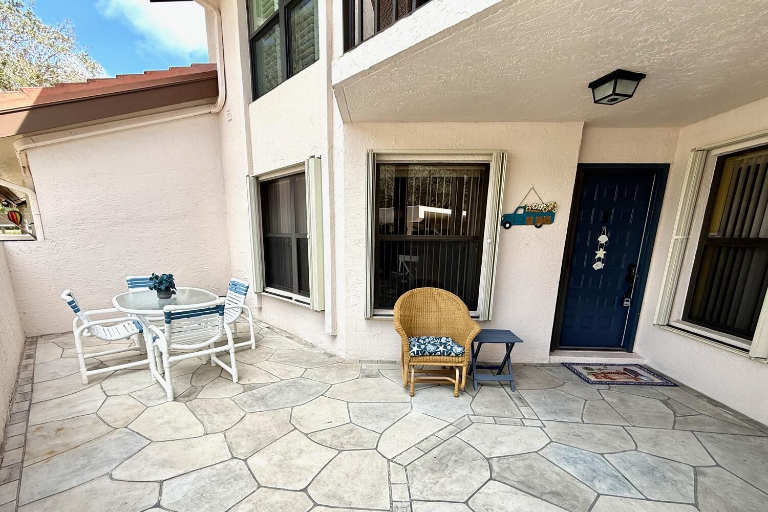 This updated two-bedroom, two-bathroom condo in Montego Cove, a 55-plus community, features a spacious courtyard patio and an enclosed porch with lake views. Inside, you'll find newer LVT flooring, an updated kitchen with granite countertops, and a generous living and dining area. The primary suite has walk-in closets, and there's storm protection with accordion hurricane shutters. Community amenities include two swimming pools, tennis and pickleball courts, and a clubhouse for social activities. Conveniently located near downtown Stuart, US-1 shopping, local beaches, and medical facilities.
