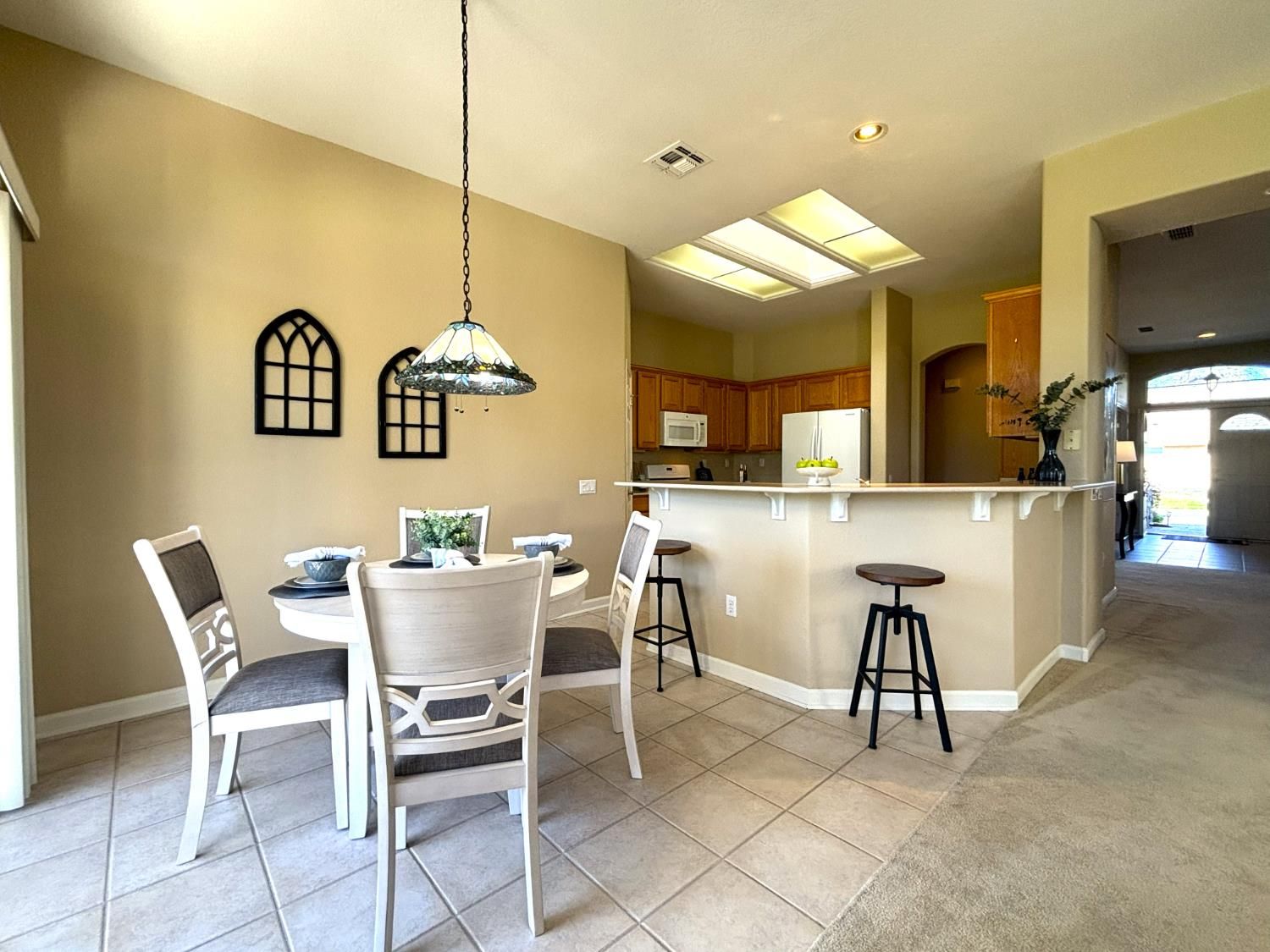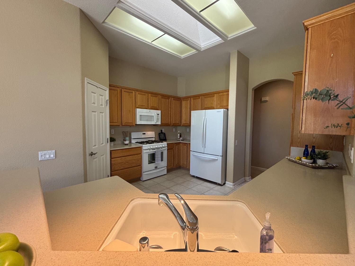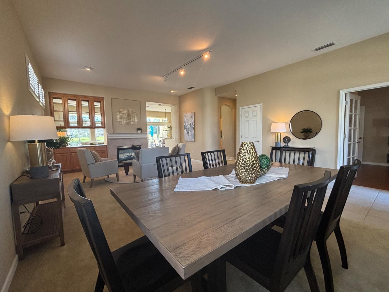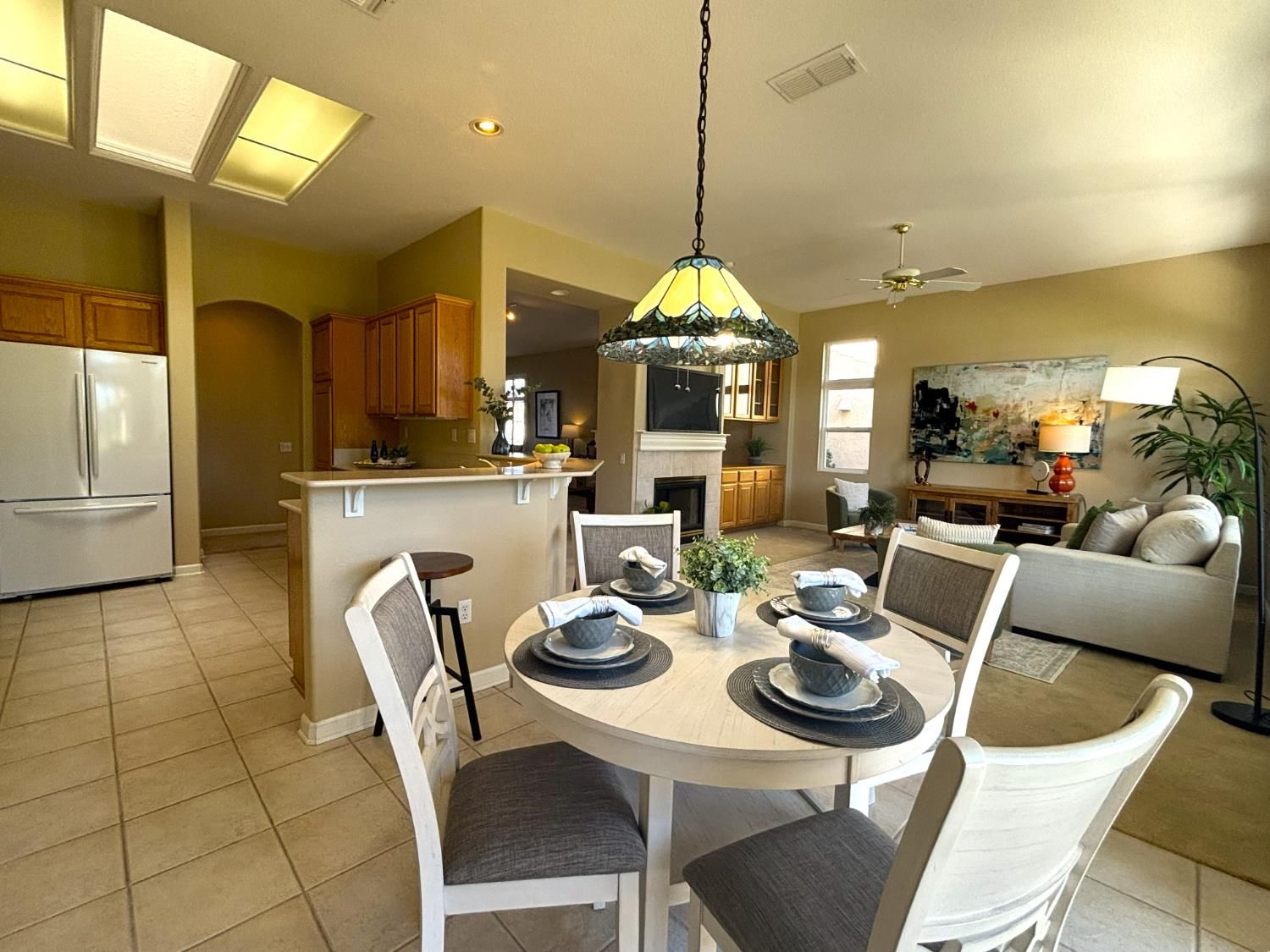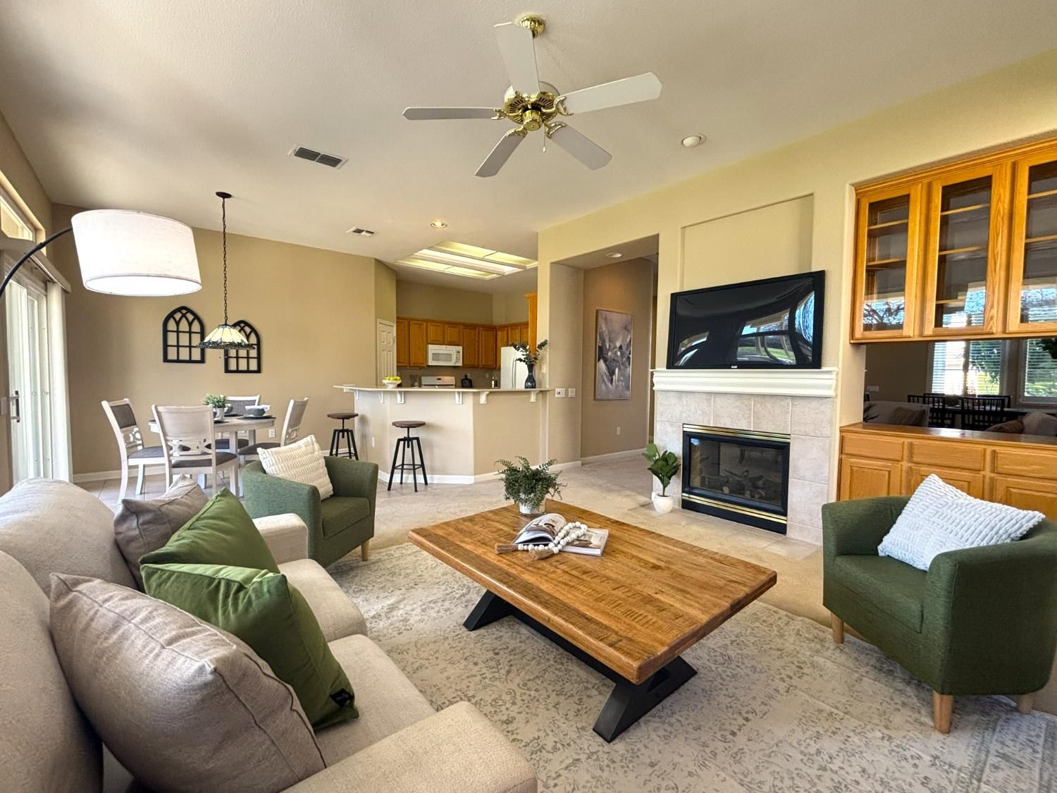 Discover the highly sought-after Sun City Sierra Model, offering two bedrooms plus a versatile den just off the entry, beautifully accented with glass French doors. The kitchen features Corian countertops, abundant cabinetry, and a convenient pantry, with a cozy breakfast nook positioned to capture views of the 18th fairway. The gathering room shares this same captivating backdrop and features a charming two-sided fireplace that also serves the spacious formal living and dining area. This flexible front room is ideal for entertaining, hosting game nights, reading, or creating a comfortable conversation space near the fire. The primary suite is a true retreat, complete with a sitting area, generous walk-in closet, additional storage cabinetry, and private patio access. The ensuite bath offers a long, storage-rich vanity and a modern walk-in shower framed by glass block, allowing for excellent natural light. A guest bedroom, interior laundry room, and a second full bath with shower complete the interior layout. The oversized garage includes two full car bays plus an extended area ideal for golf cart parking, storage, or a workshop. The true highlight of this home is the expansive fairway view, framed by mature trees and enjoyed from the covered patio a welcoming space for dining, entertaining, or simply relaxing. Home is living-ready with a new HVAC (Dec 2025), fresh paint, professionally cleaned inc windows, repairs completed by professionals.