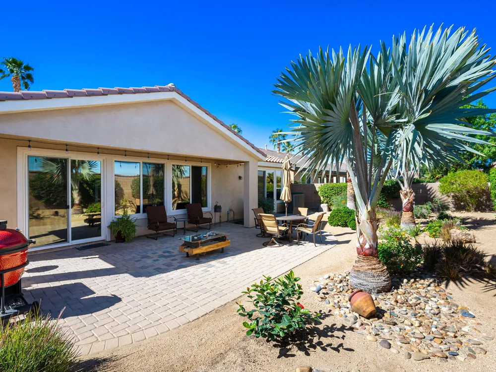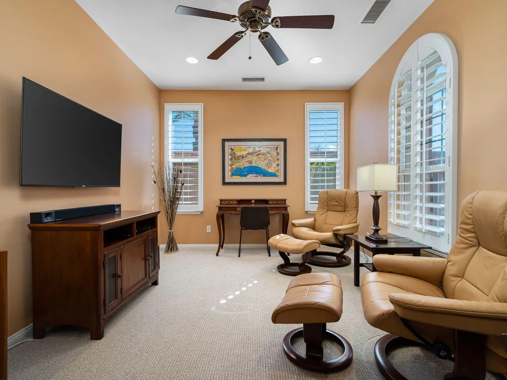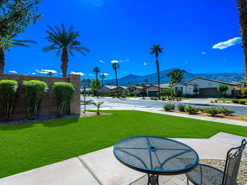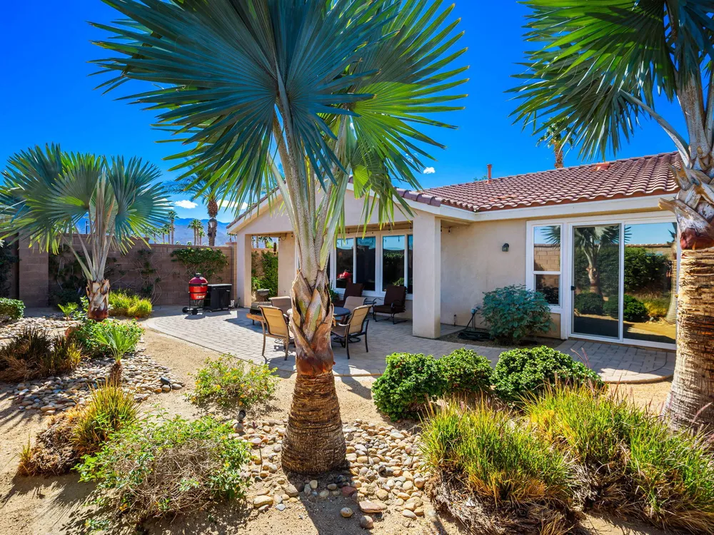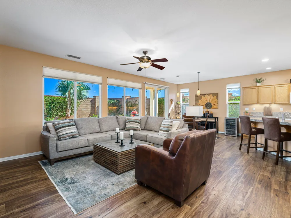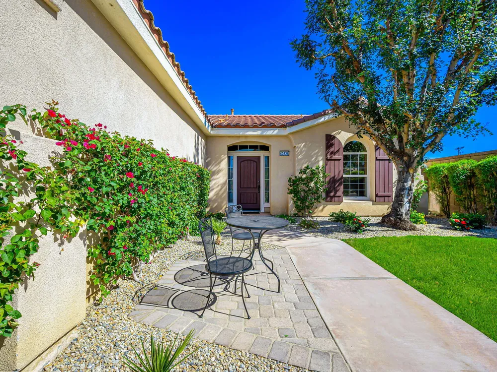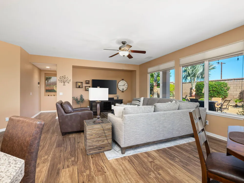 A Suite Deal! Charm and quality are hallmarks of this immaculate and beautifully crafted 1,667 SQ FT Monterey Model with 2-bedrooms, a den or 3rd bedroom, and 2-full baths, located in the highly desired Trilogy Golf Club at La Quinta. Richly upgraded with stunning wide-plank floors in the main living areas, and available fully furnished, with newer A/C, the home offers all the comforts of a fun vacation property coupled with the durability, efficiency, and ease of maintenance of a rental. Experience the splendor of desert living in a home that makes indoor and outdoor living seamless. Outdoors, the towering Santa Rosa Mountains from the front and back patios will have you awestruck, while indoors, the sun as it radiates softly through the big picture windows make the whole home feel airy and cheerful. The kitchen with its extensive counters, cabinets, and pantry offers plenty of space for even the most prolific chefs, while the extra-large center island makes food preparation and entertaining a breeze. Serve up dinners in the dining area or outdoor BBQ on the covered patio. The den offers a soothing and comfortable respite perfect for snuggling up with a movie or good book. The main bedroom suite is spacious with sliding doors that step out to the private back patio. The bath features dual vanities, a linen closet, walk-in shower, and deep walk-in closet. Separated for privacy, friends and family will love the guest bedroom and full bath. A separate laundry room with deep sink and cabinets is steps away from the oversized garage that easily fits up to 2-cars, golf cart, bikes, and athletic equipment. Take in the beauty of the professionally landscaped yard, with custom pavers and richly textured, mature trees and flowering plants. By day, enjoy a cup of Joe on the patio as the sun casts its first shadows as it rises in the east. At nightfall, grab a glass of wine and sit fireside as the landscape spotlights come alive, and the moon makes its magnificent ascent over the valley. Trilogy at La Quinta is a 55+ active adult community of 1,238 homes offering the ultimate in golf and desert resort living.