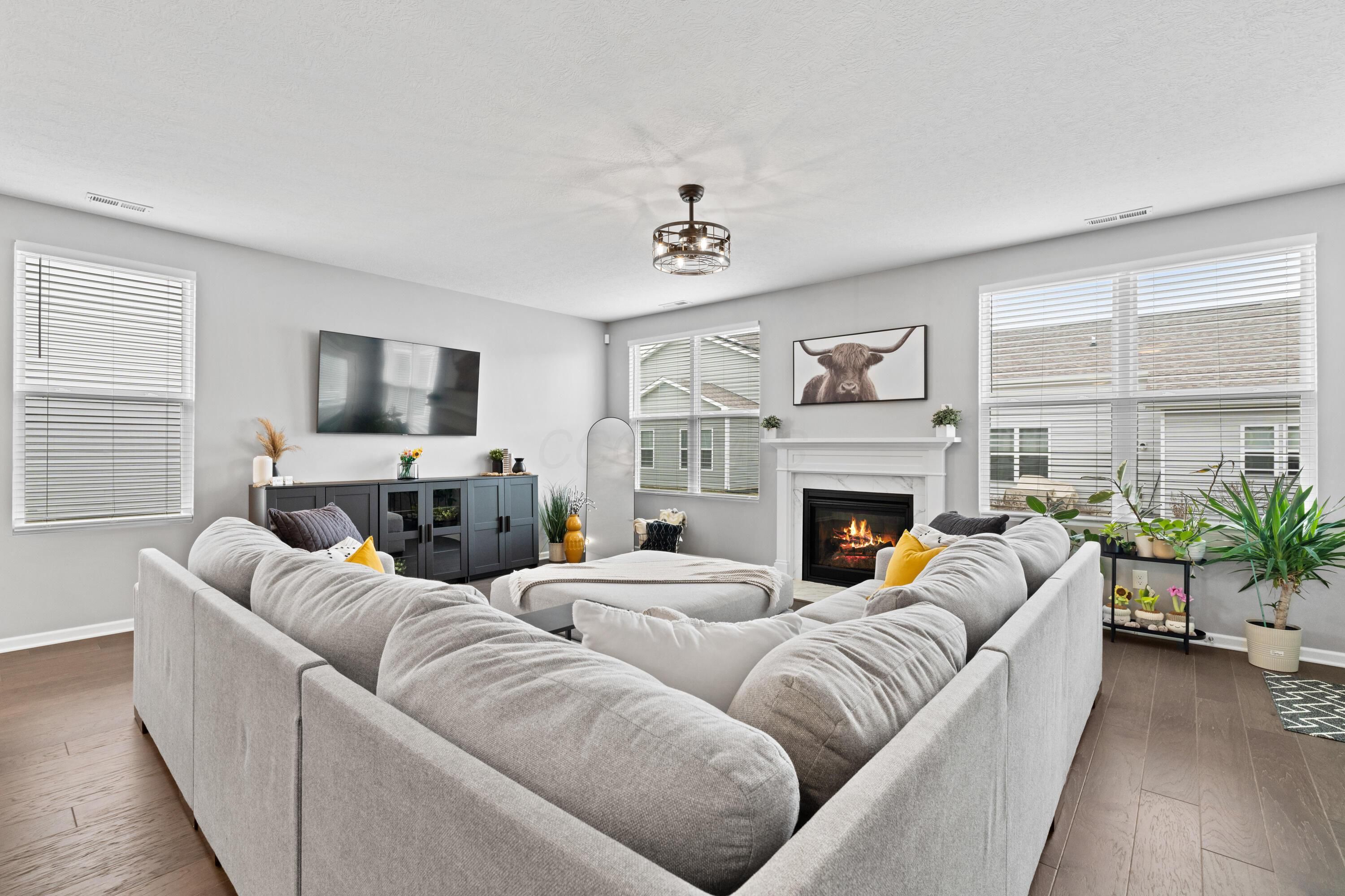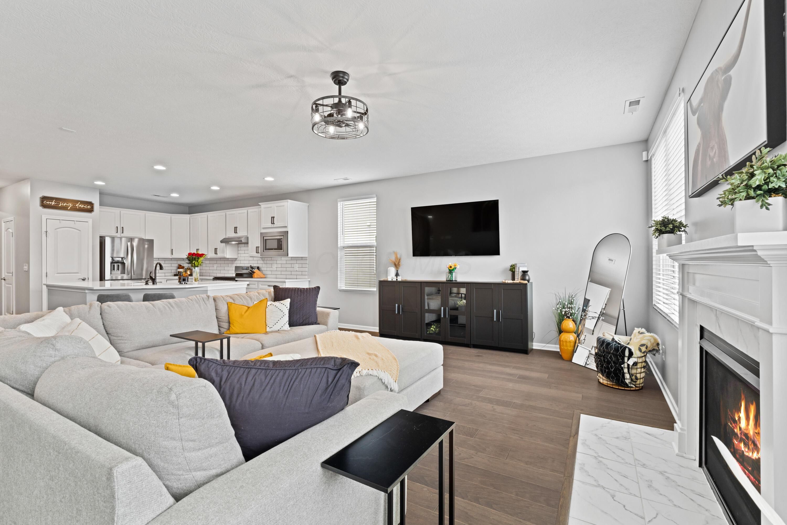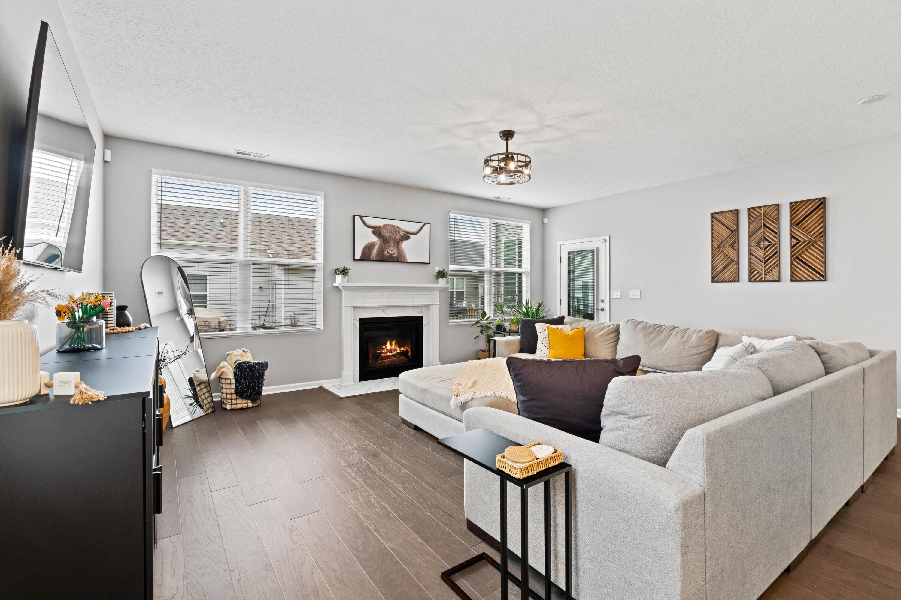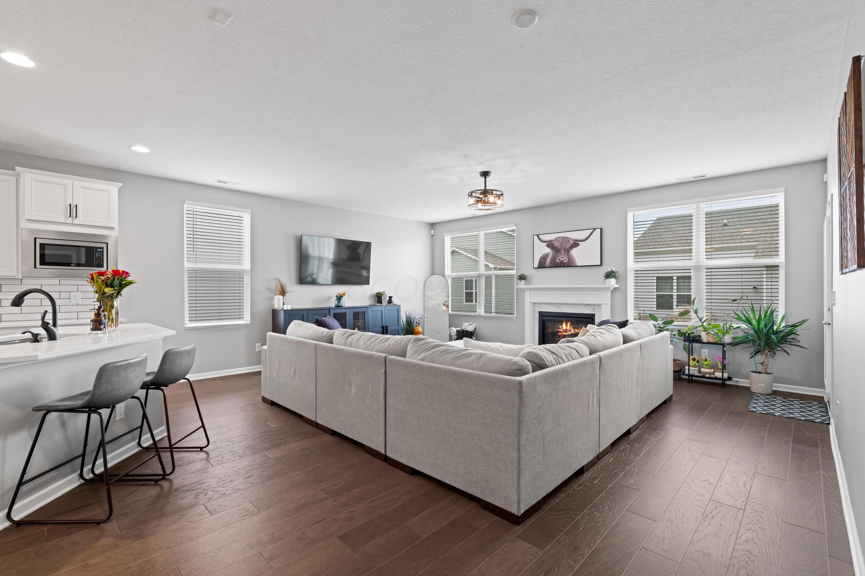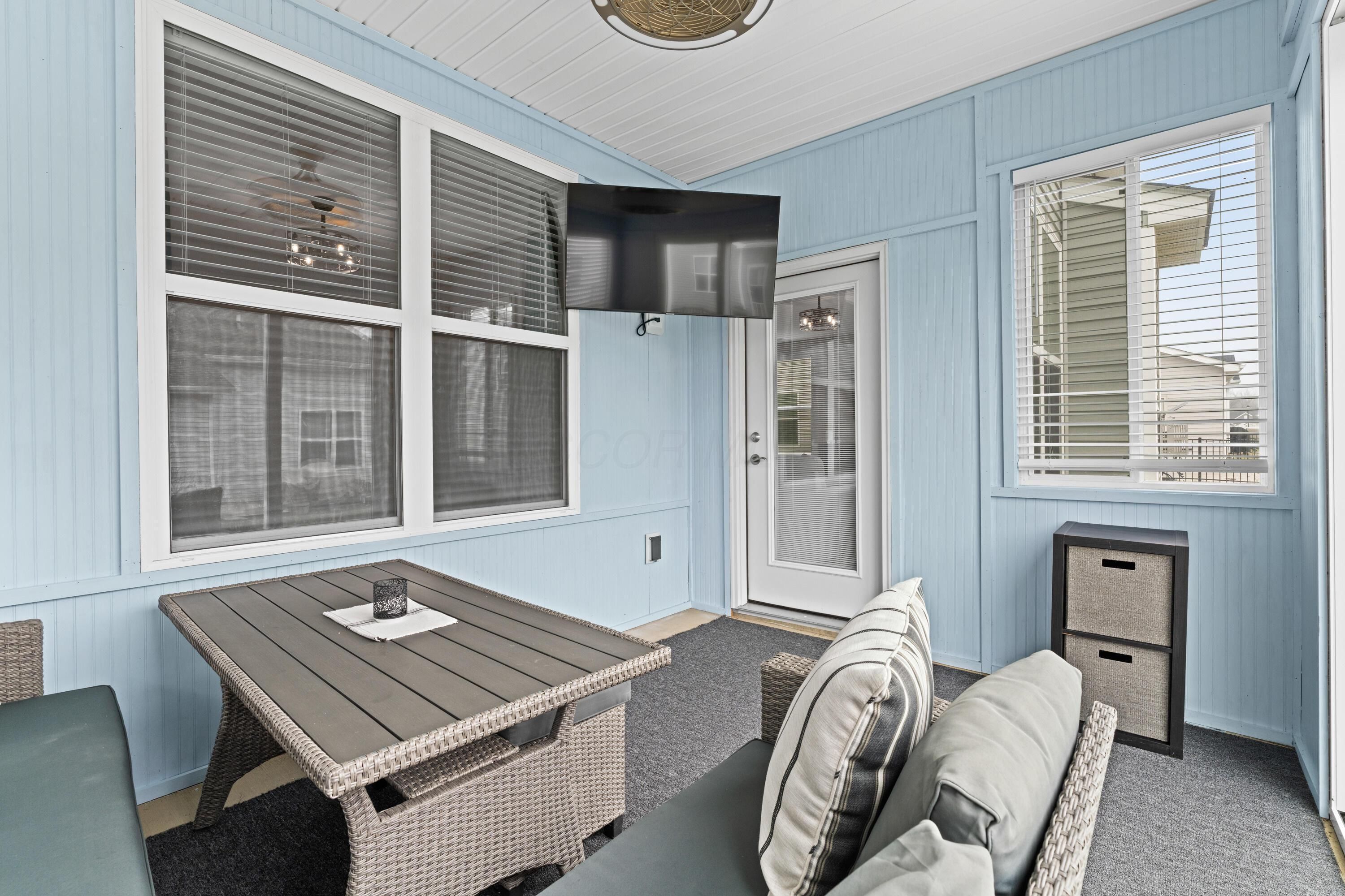 Welcome to this freestanding condo/patio home. Stylish open concept Pulte Blue Rock model in the Preserve at Rocky Fork with extensive upgrades throughout! Engineered hardwood floors and a fireplace in the living area. New tile in all the bathrooms and laundry. The primary suite offers a double-bowl marble vanity, 35' cabinet, and an upgraded tiled shower with semi-frameless glass and built-in seat. The second floor serves as a private suite with a large bedroom, living area, full bath, and walk-in closet. The kitchen features an angled island with bar seating, new tile backsplash, 42' cabinets, quartz countertops, and a Whirlpool stainless appliance package including a gas range. After market improvements include a barn door to the laundry with added storage cabinets, custom closets in bedrooms and pantry, and a Sun Craft 3-season room with windows, tongue-and-groove wood walls, mounted TV, and a 9' custom collapsible sliding door leading to an additional patio. Two-car attached garage. Lawn care and snow removal included. Prime location near parks, and walking paths, with quick freeway access.