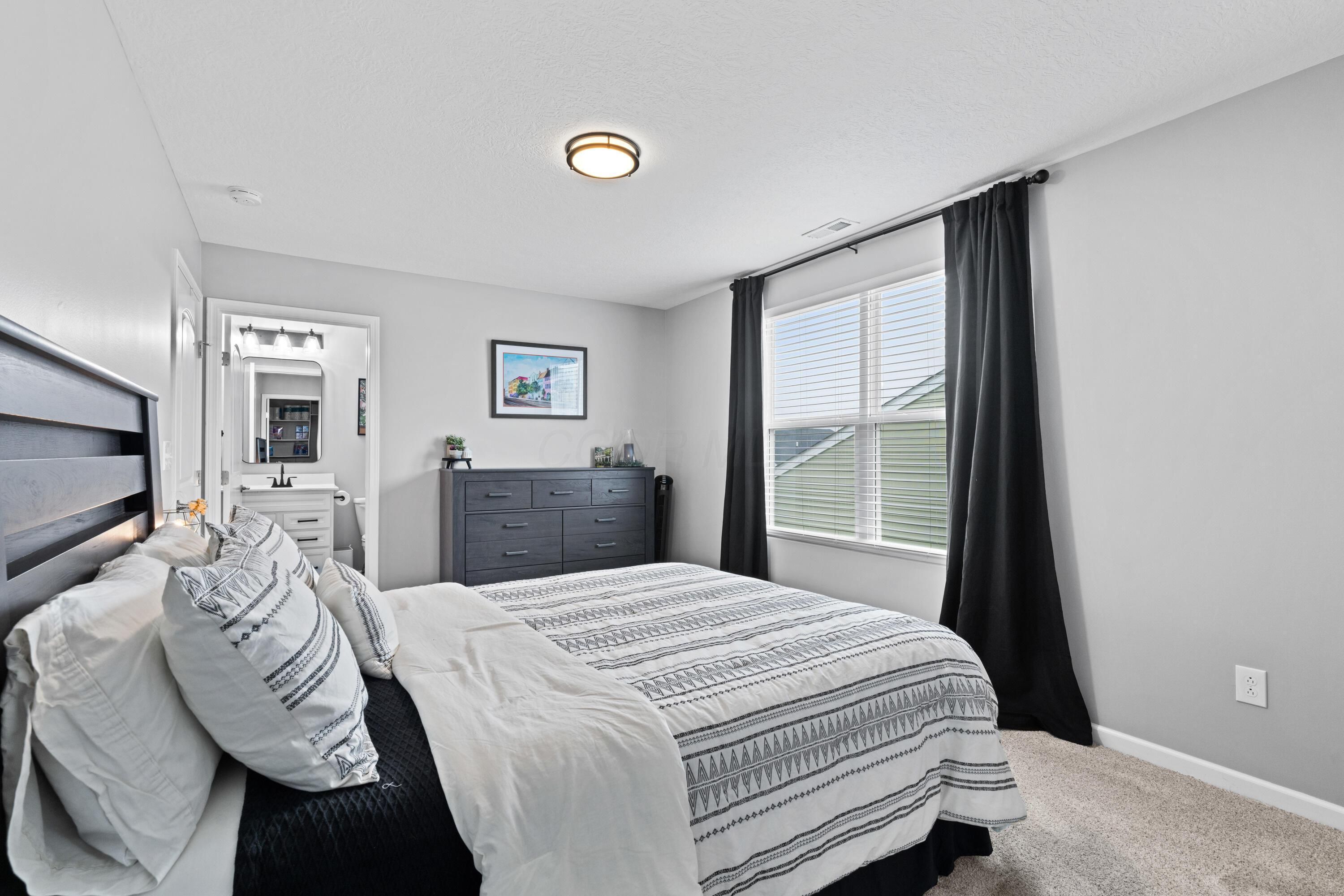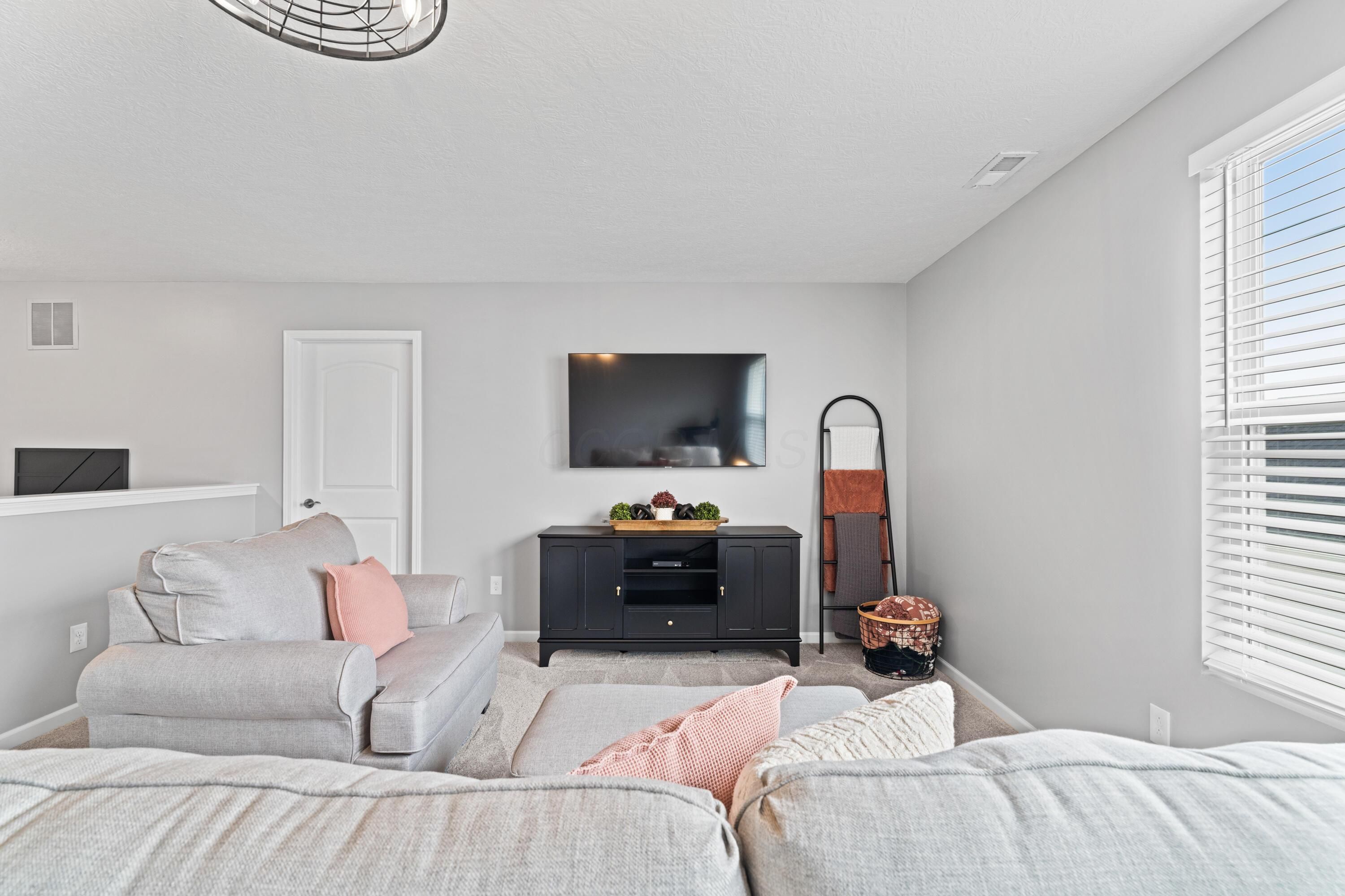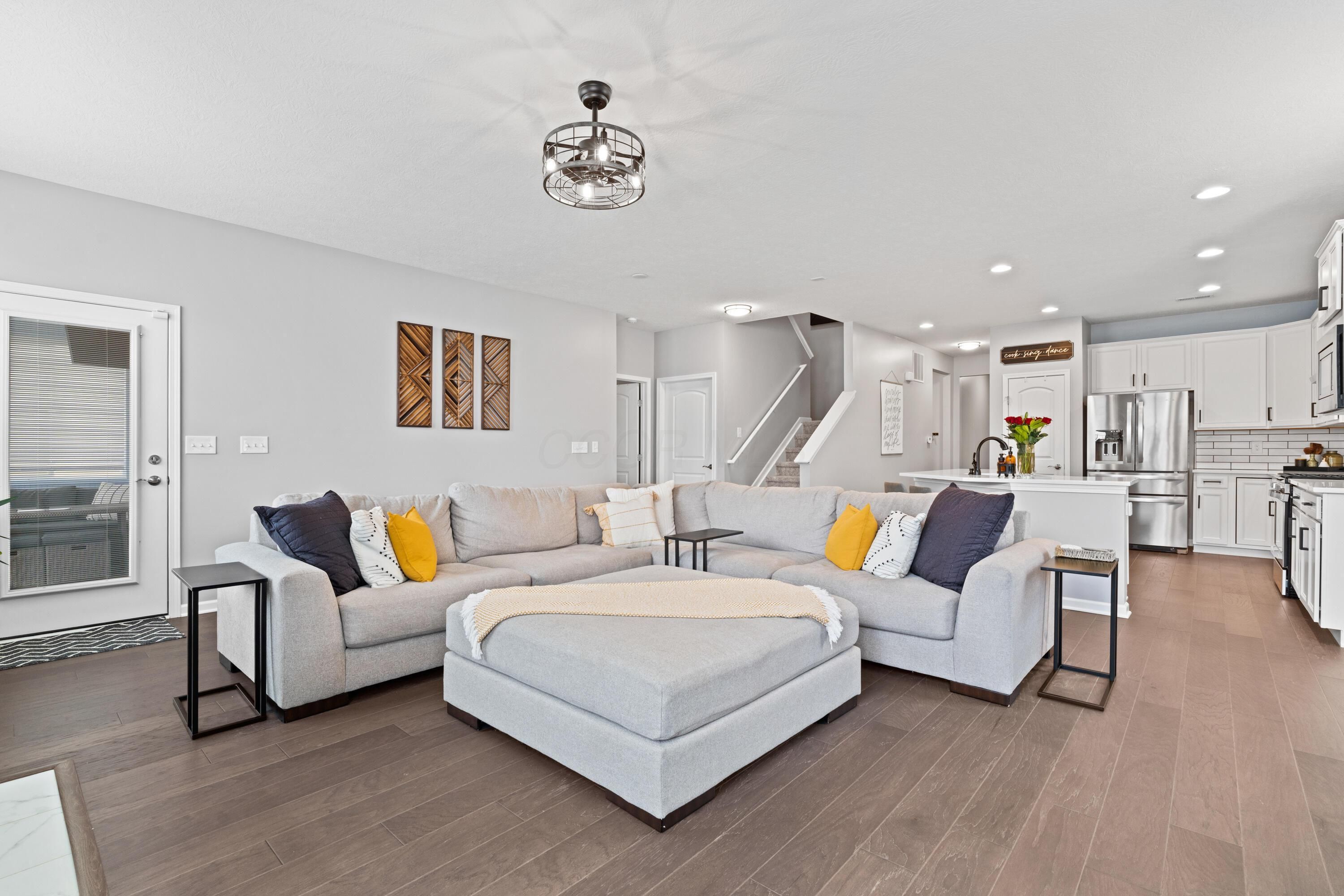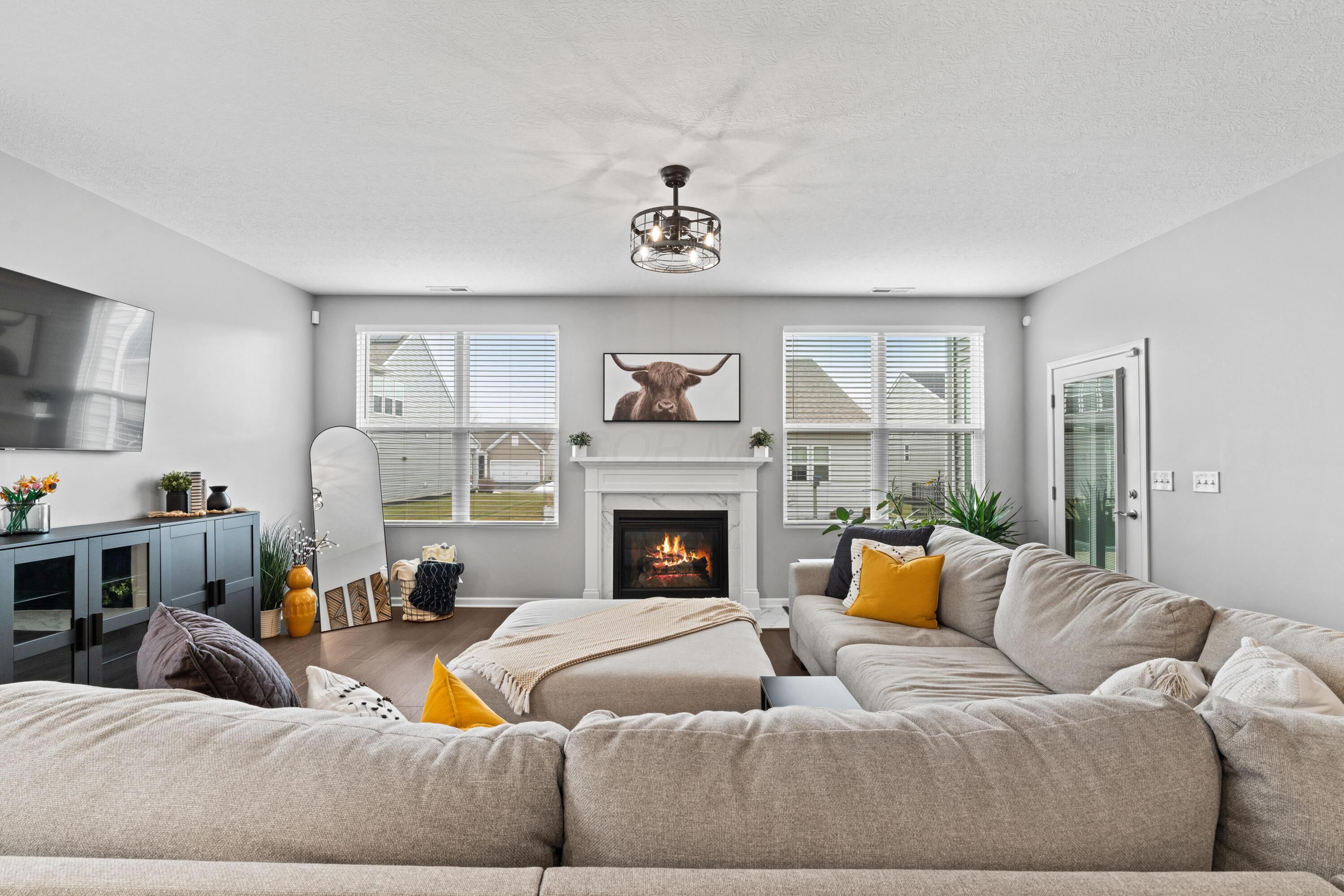 Welcome to this freestanding condo/patio home. Stylish open concept Pulte Blue Rock model in the Preserve at Rocky Fork with extensive upgrades throughout! Engineered hardwood floors and a fireplace in the living area. New tile in all the bathrooms and laundry. The primary suite offers a double-bowl marble vanity, 35' cabinet, and an upgraded tiled shower with semi-frameless glass and built-in seat. The second floor serves as a private suite with a large bedroom, living area, full bath, and walk-in closet. The kitchen features an angled island with bar seating, new tile backsplash, 42' cabinets, quartz countertops, and a Whirlpool stainless appliance package including a gas range. After market improvements include a barn door to the laundry with added storage cabinets, custom closets in bedrooms and pantry, and a Sun Craft 3-season room with windows, tongue-and-groove wood walls, mounted TV, and a 9' custom collapsible sliding door leading to an additional patio. Two-car attached garage. Lawn care and snow removal included. Prime location near parks, and walking paths, with quick freeway access.