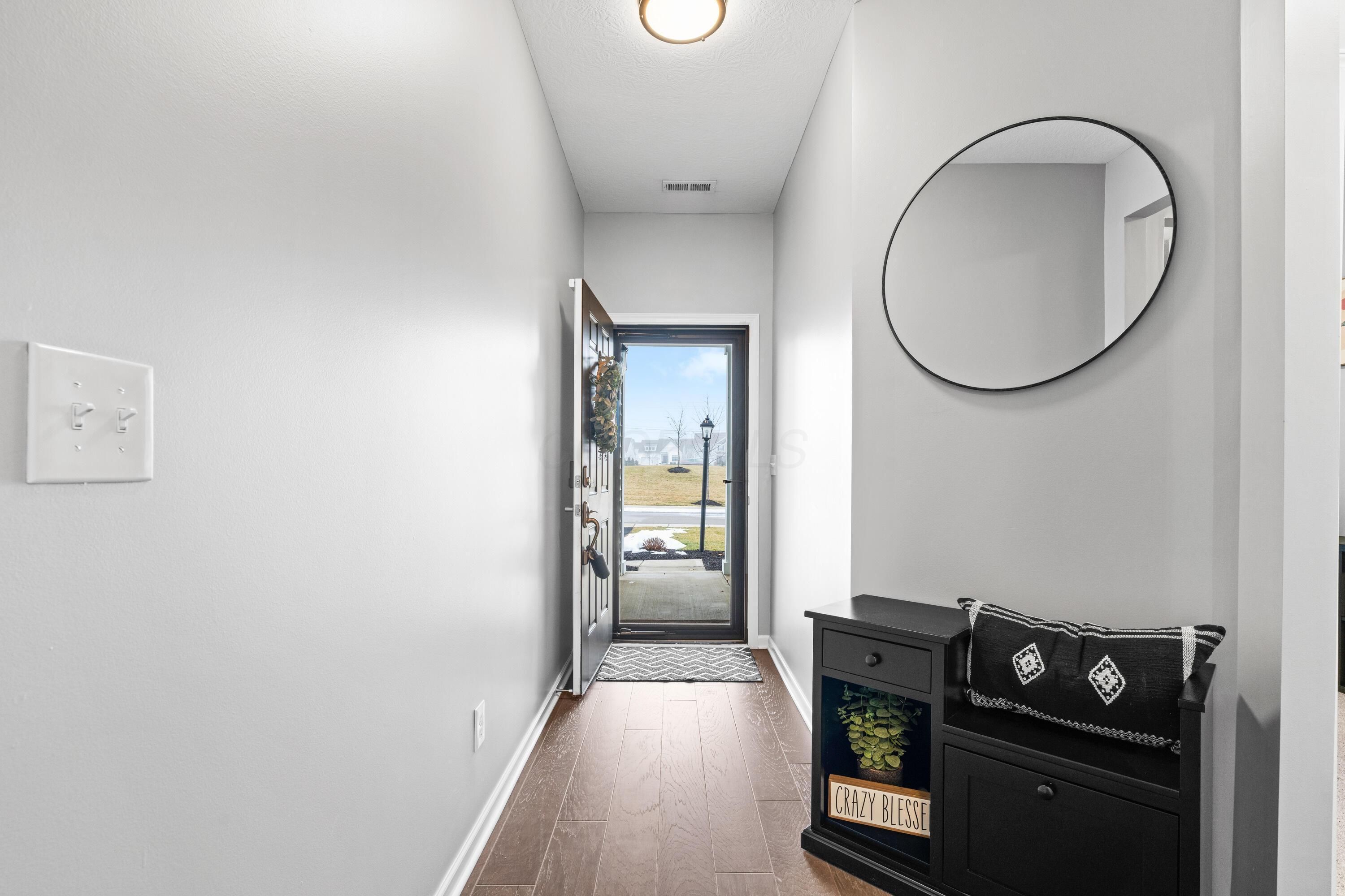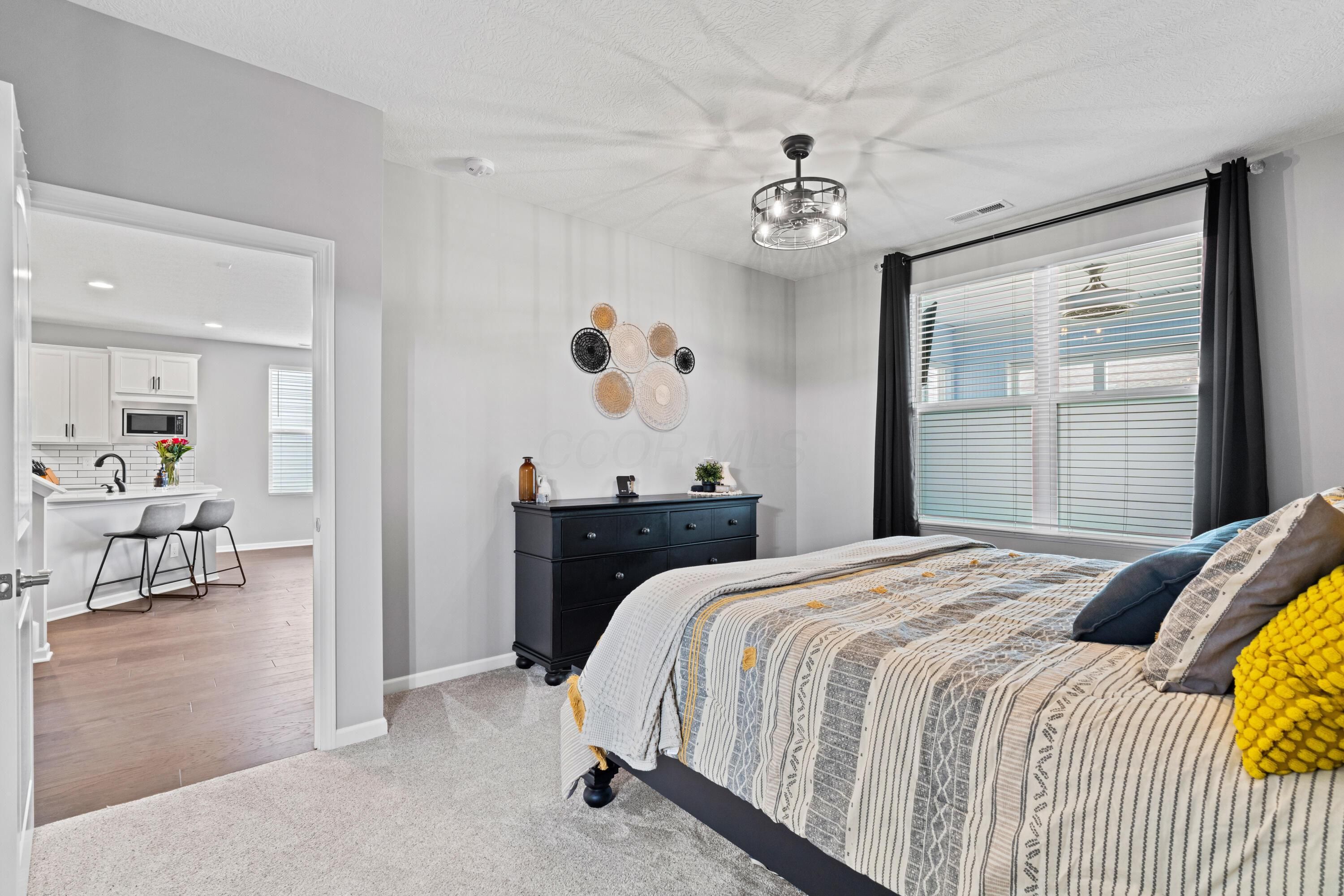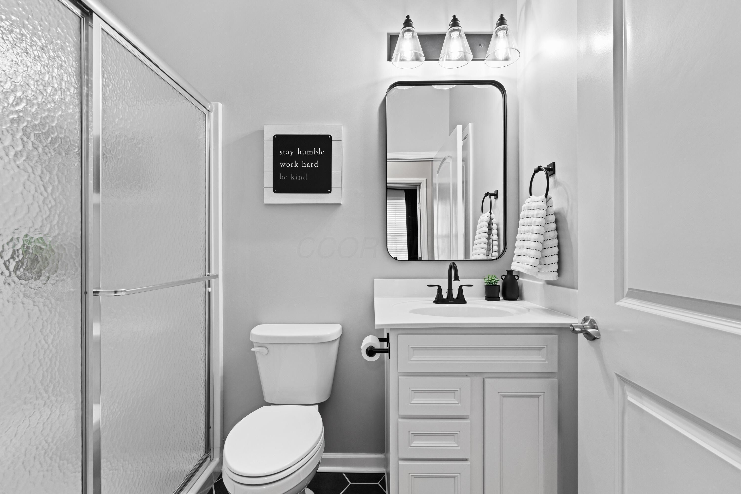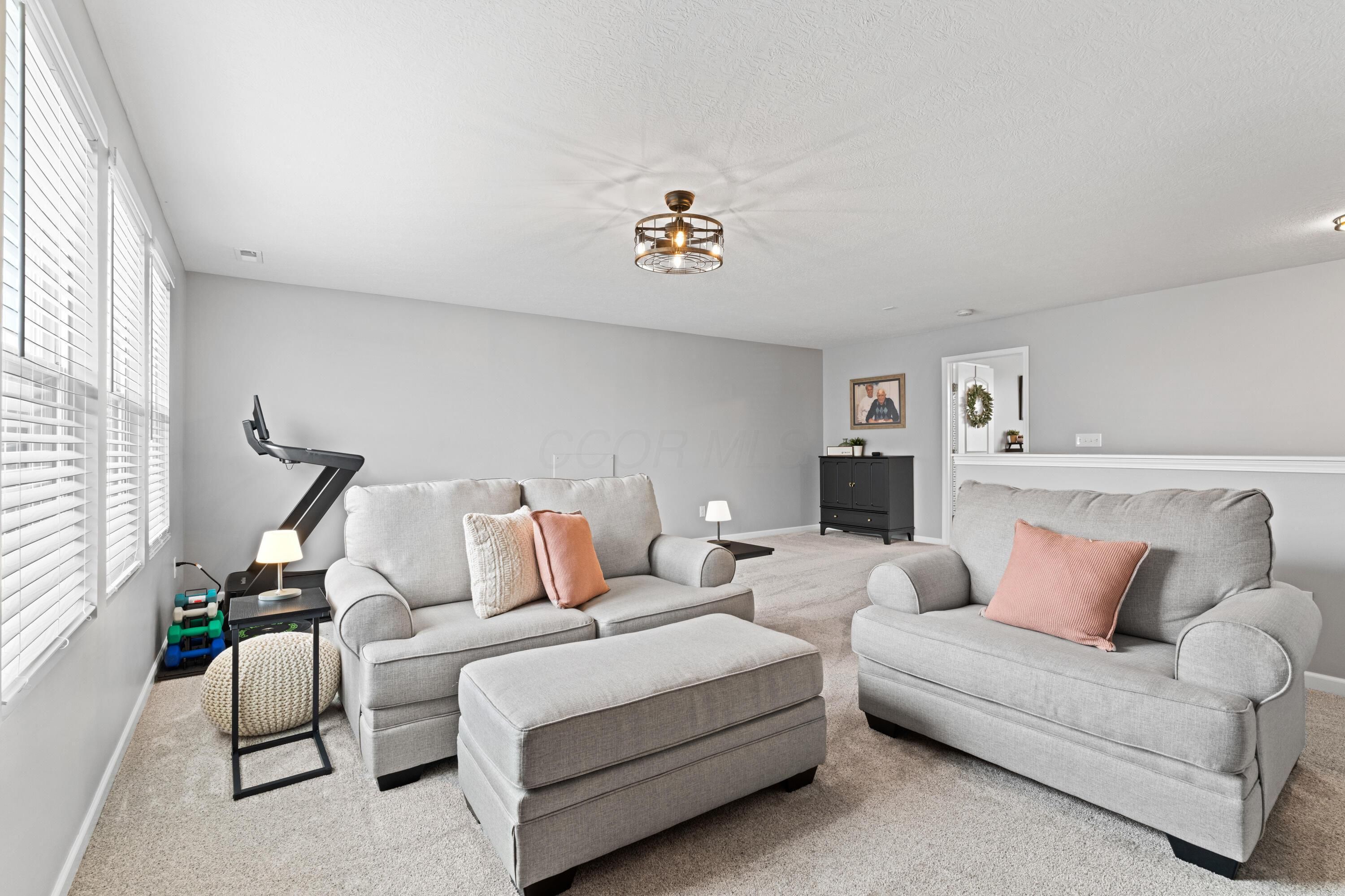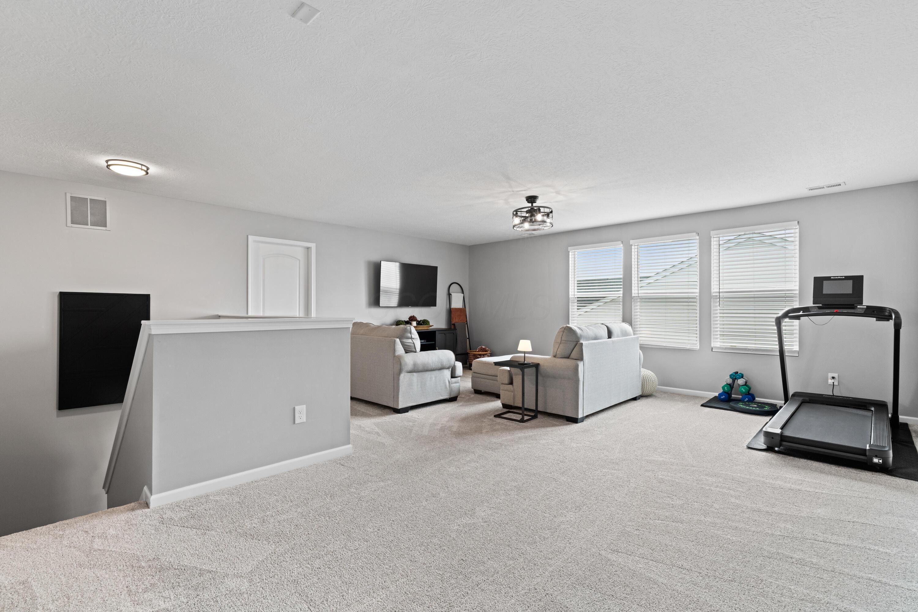 Welcome to this freestanding condo/patio home. Stylish open concept Pulte Blue Rock model in the Preserve at Rocky Fork with extensive upgrades throughout! Engineered hardwood floors and a fireplace in the living area. New tile in all the bathrooms and laundry. The primary suite offers a double-bowl marble vanity, 35' cabinet, and an upgraded tiled shower with semi-frameless glass and built-in seat. The second floor serves as a private suite with a large bedroom, living area, full bath, and walk-in closet. The kitchen features an angled island with bar seating, new tile backsplash, 42' cabinets, quartz countertops, and a Whirlpool stainless appliance package including a gas range. After market improvements include a barn door to the laundry with added storage cabinets, custom closets in bedrooms and pantry, and a Sun Craft 3-season room with windows, tongue-and-groove wood walls, mounted TV, and a 9' custom collapsible sliding door leading to an additional patio. Two-car attached garage. Lawn care and snow removal included. Prime location near parks, and walking paths, with quick freeway access.