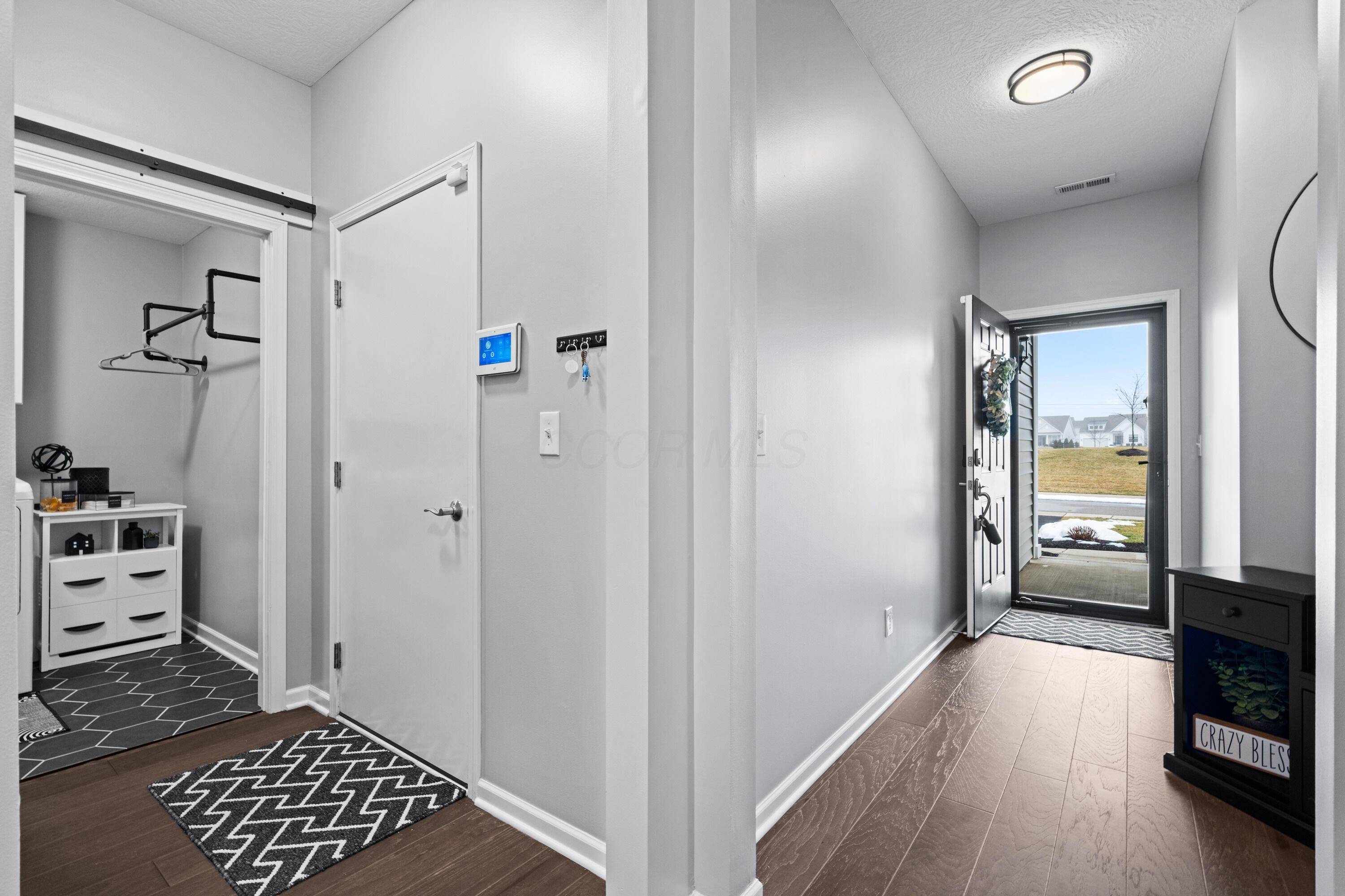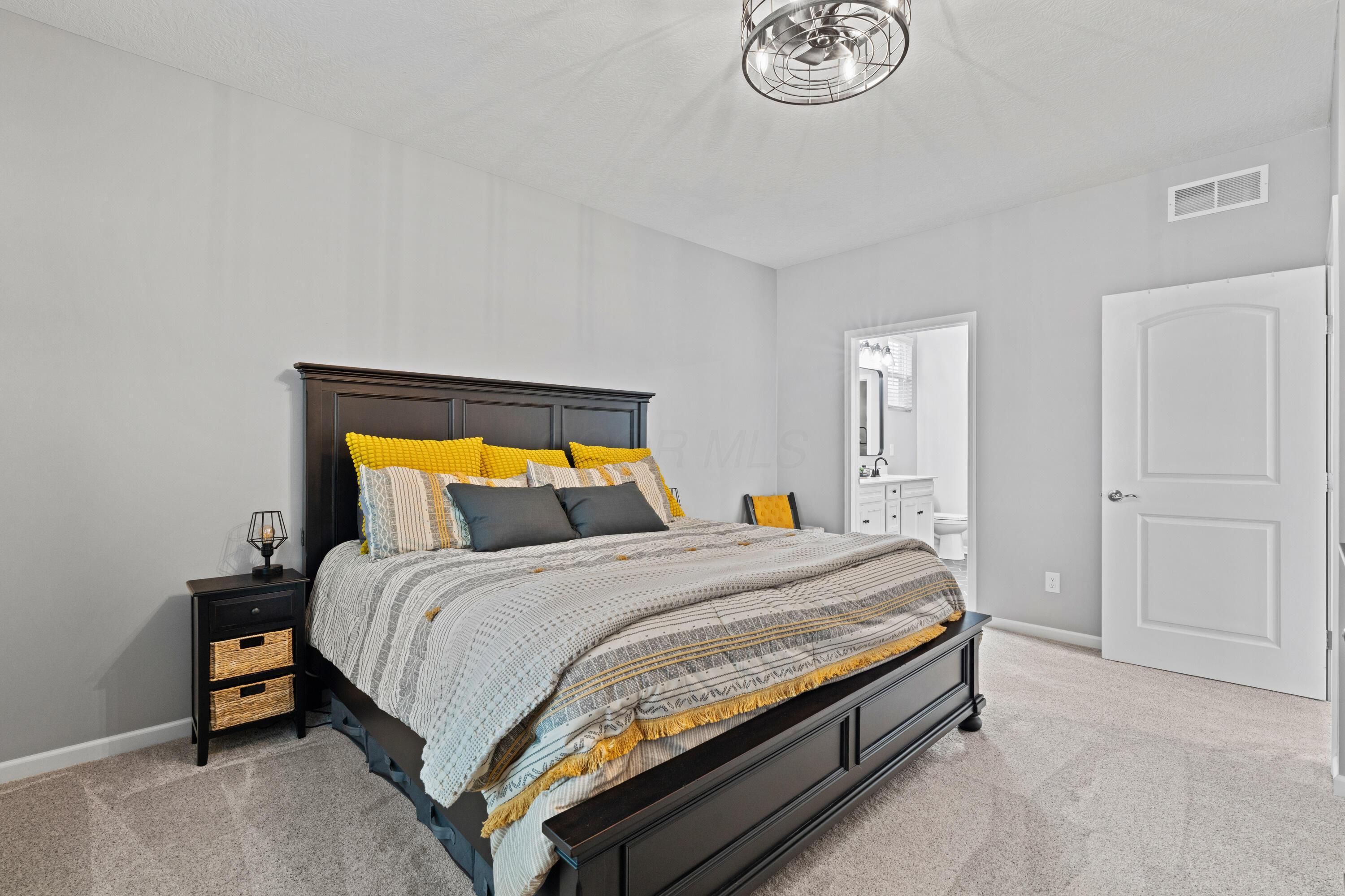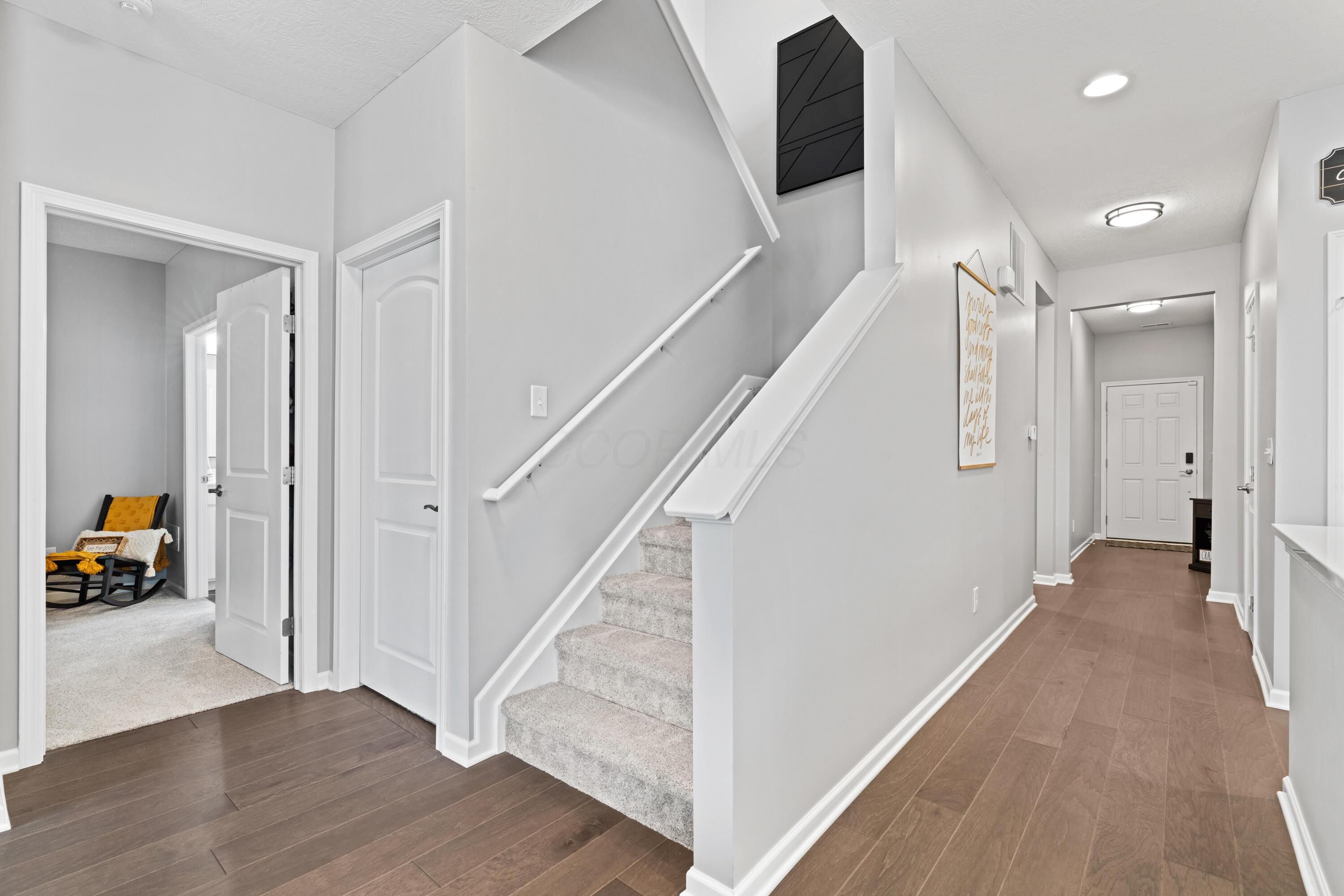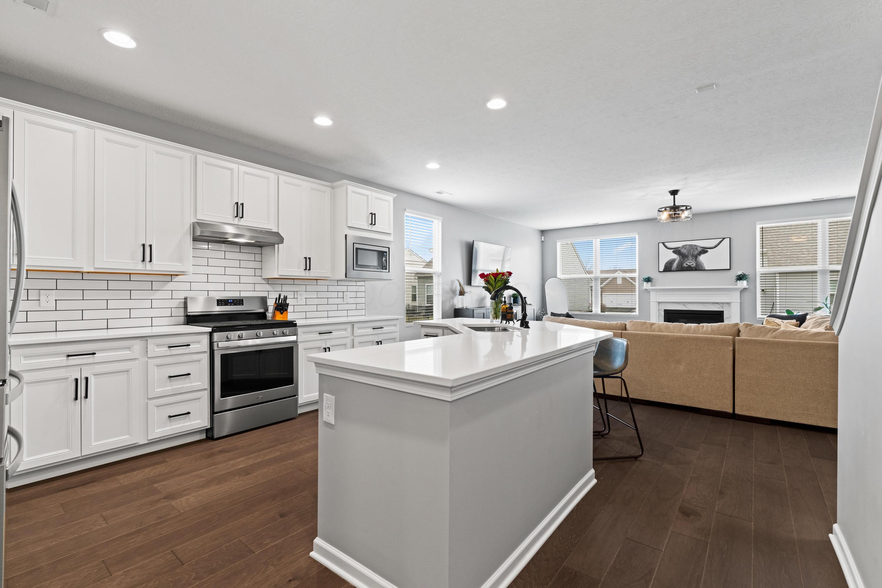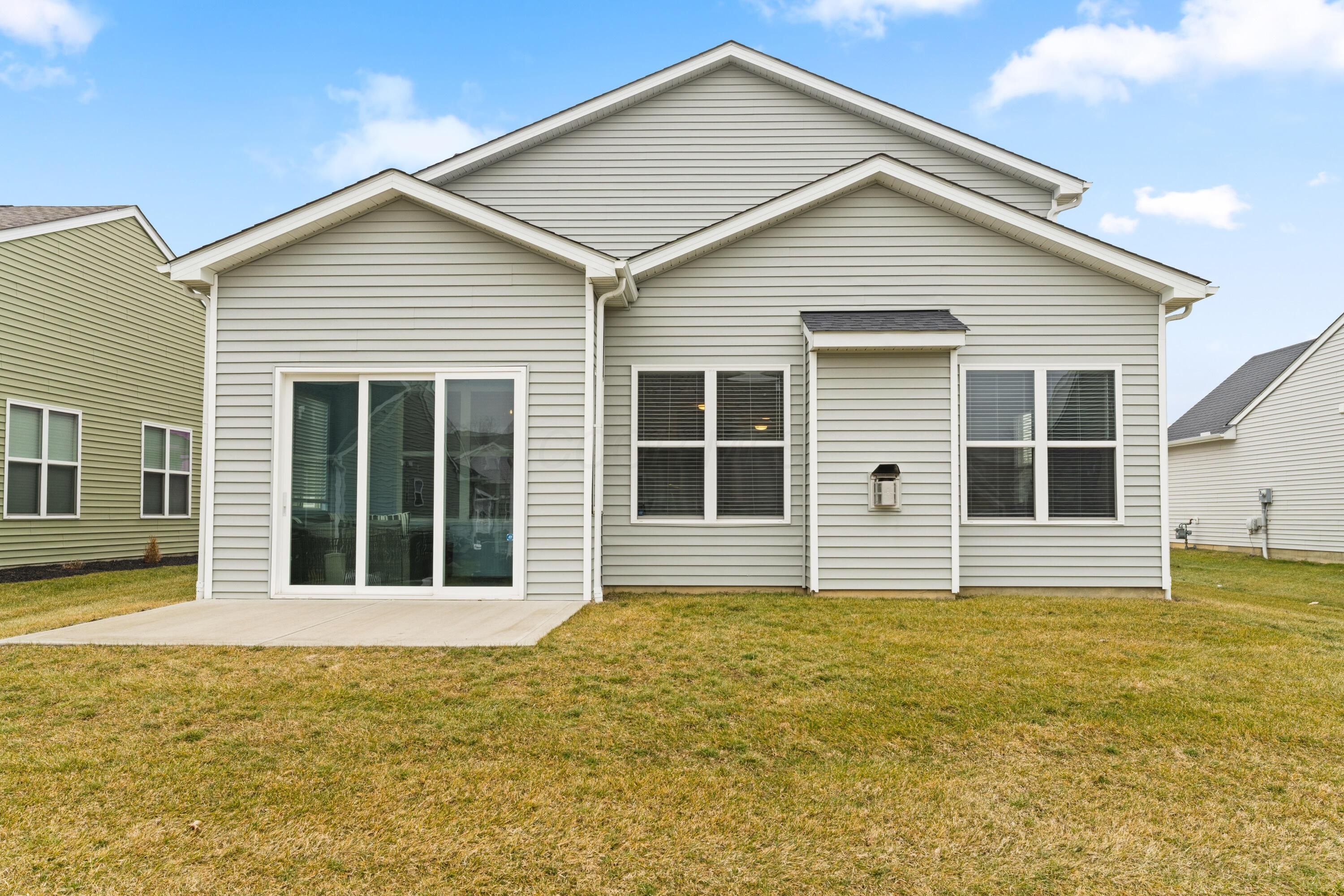 Welcome to this freestanding condo/patio home. Stylish open concept Pulte Blue Rock model in the Preserve at Rocky Fork with extensive upgrades throughout! Engineered hardwood floors and a fireplace in the living area. New tile in all the bathrooms and laundry. The primary suite offers a double-bowl marble vanity, 35' cabinet, and an upgraded tiled shower with semi-frameless glass and built-in seat. The second floor serves as a private suite with a large bedroom, living area, full bath, and walk-in closet. The kitchen features an angled island with bar seating, new tile backsplash, 42' cabinets, quartz countertops, and a Whirlpool stainless appliance package including a gas range. After market improvements include a barn door to the laundry with added storage cabinets, custom closets in bedrooms and pantry, and a Sun Craft 3-season room with windows, tongue-and-groove wood walls, mounted TV, and a 9' custom collapsible sliding door leading to an additional patio. Two-car attached garage. Lawn care and snow removal included. Prime location near parks, and walking paths, with quick freeway access.