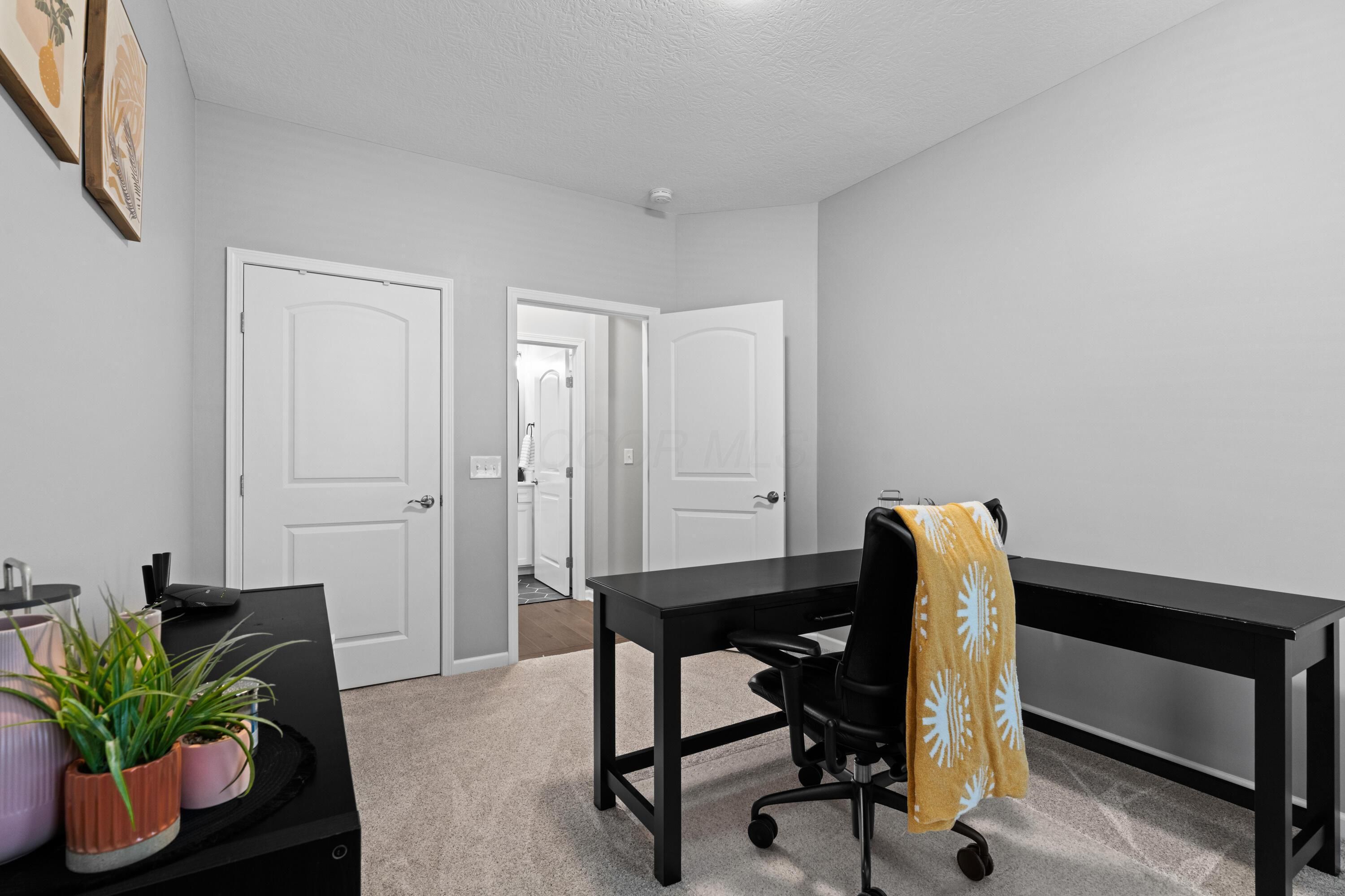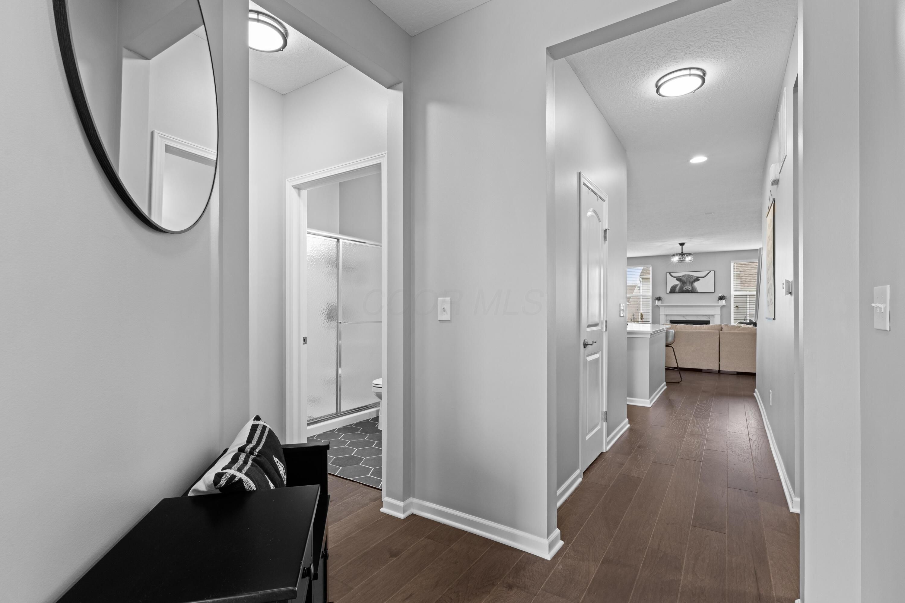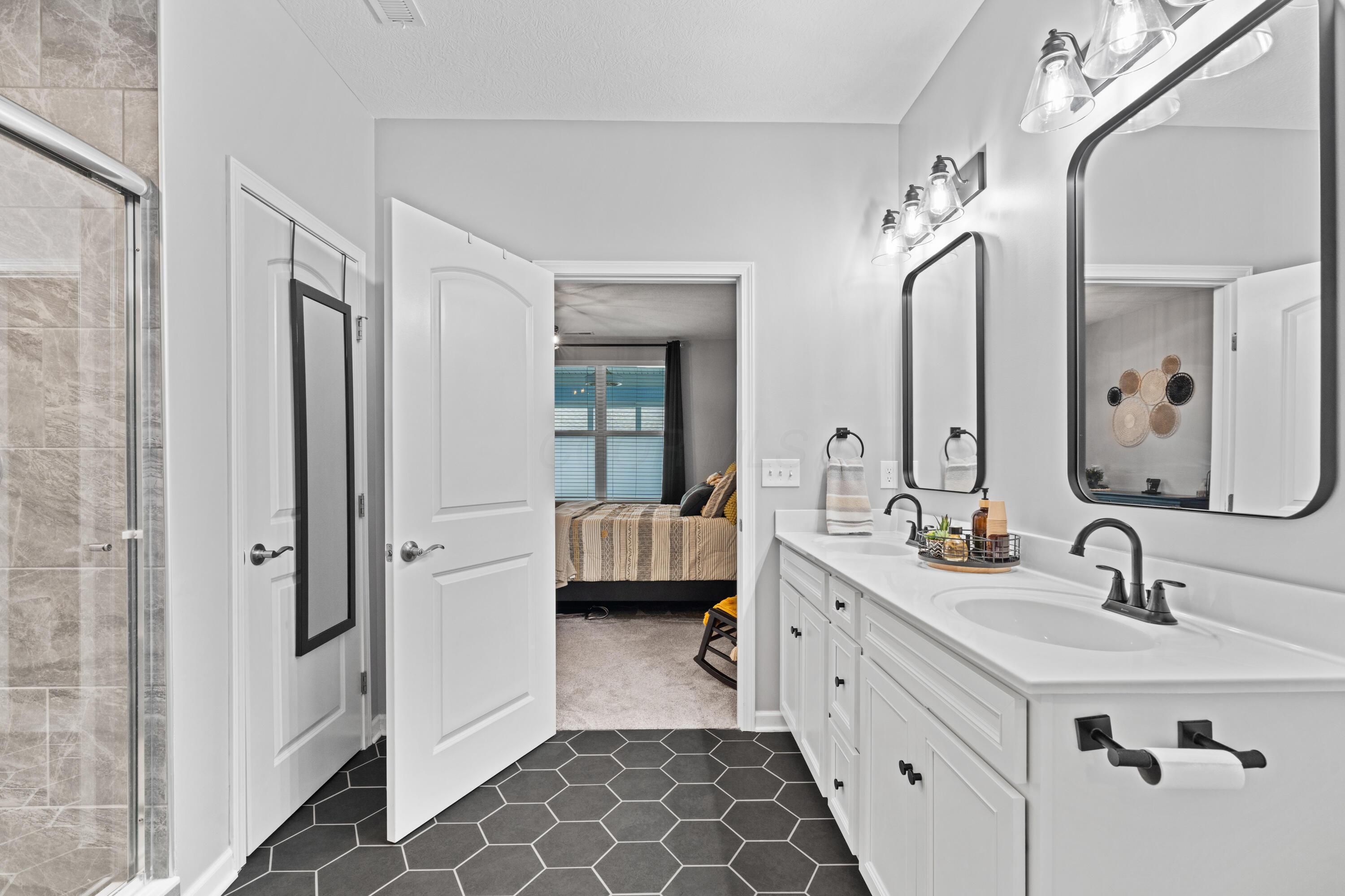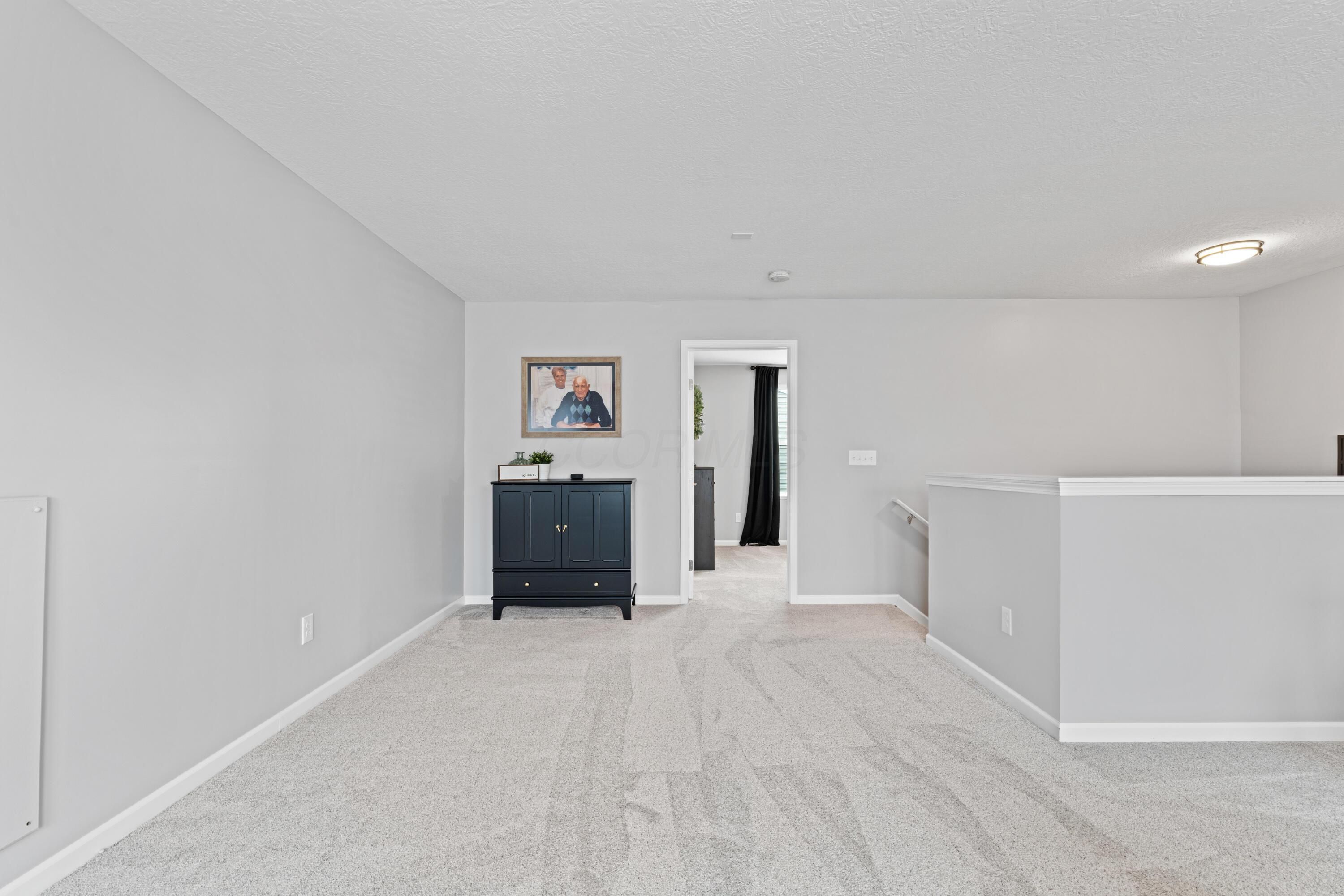 Welcome to this freestanding condo/patio home. Stylish open concept Pulte Blue Rock model in the Preserve at Rocky Fork with extensive upgrades throughout! Engineered hardwood floors and a fireplace in the living area. New tile in all the bathrooms and laundry. The primary suite offers a double-bowl marble vanity, 35' cabinet, and an upgraded tiled shower with semi-frameless glass and built-in seat. The second floor serves as a private suite with a large bedroom, living area, full bath, and walk-in closet. The kitchen features an angled island with bar seating, new tile backsplash, 42' cabinets, quartz countertops, and a Whirlpool stainless appliance package including a gas range. After market improvements include a barn door to the laundry with added storage cabinets, custom closets in bedrooms and pantry, and a Sun Craft 3-season room with windows, tongue-and-groove wood walls, mounted TV, and a 9' custom collapsible sliding door leading to an additional patio. Two-car attached garage. Lawn care and snow removal included. Prime location near parks, and walking paths, with quick freeway access.