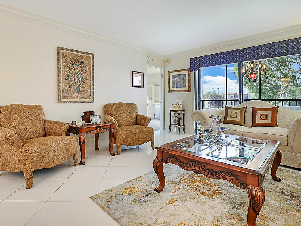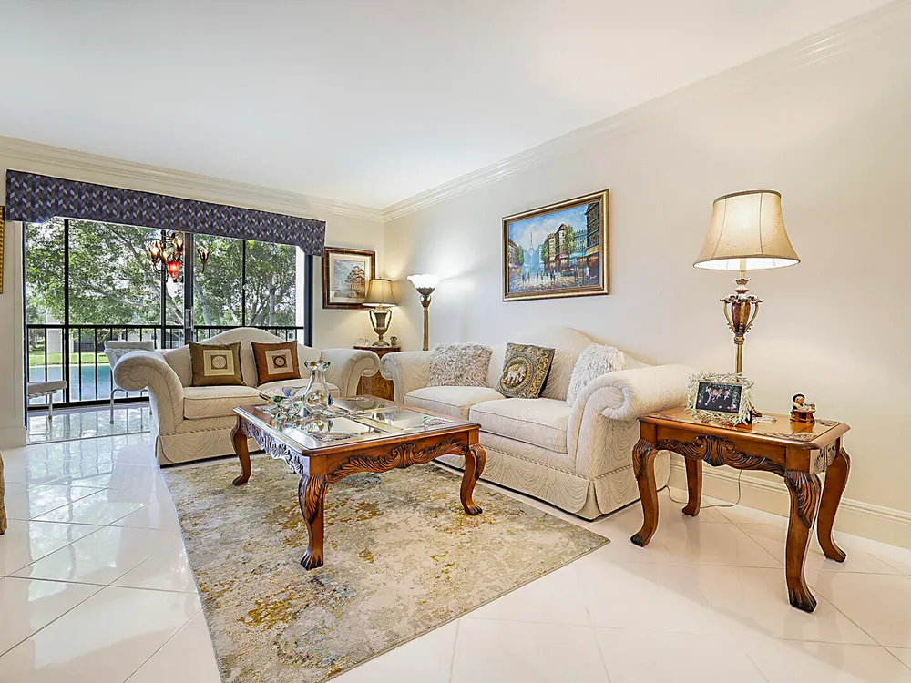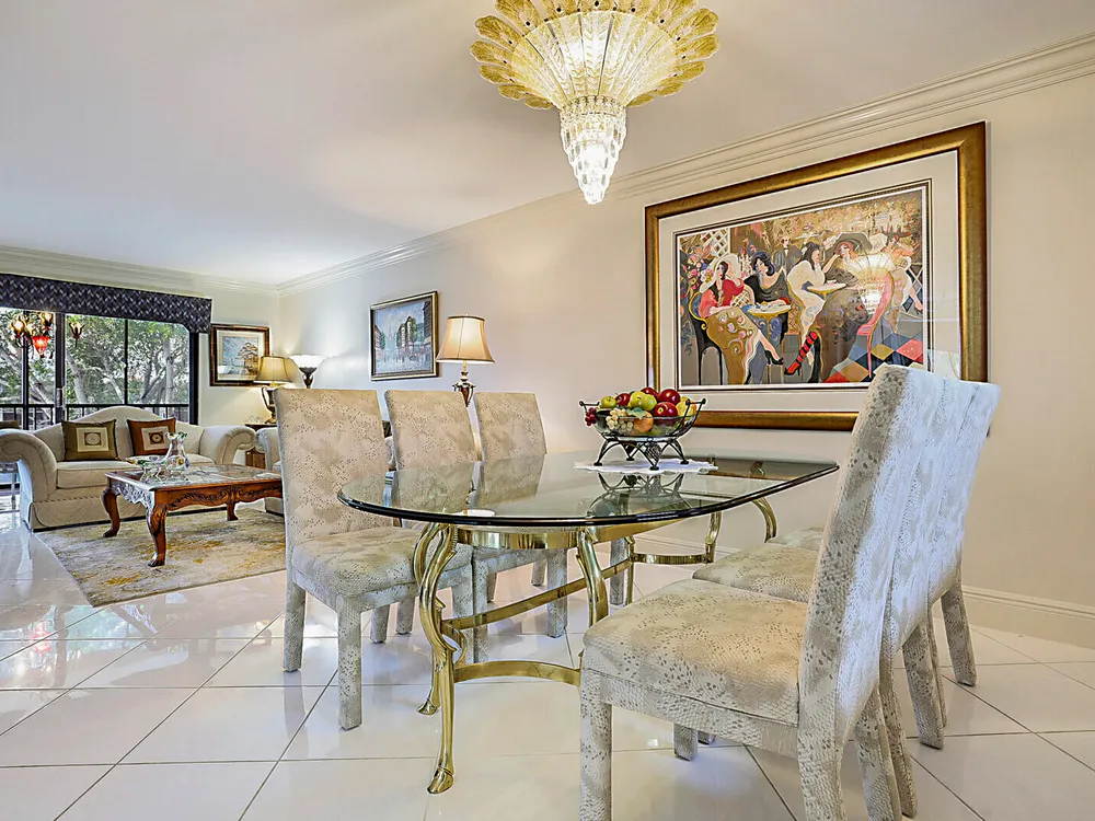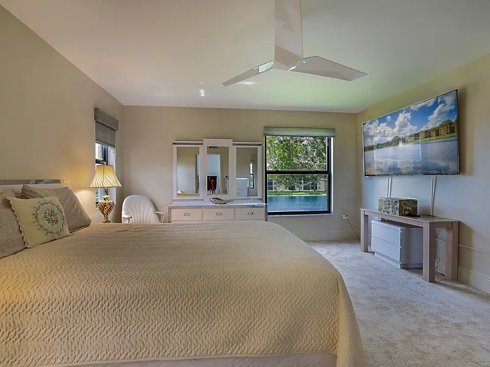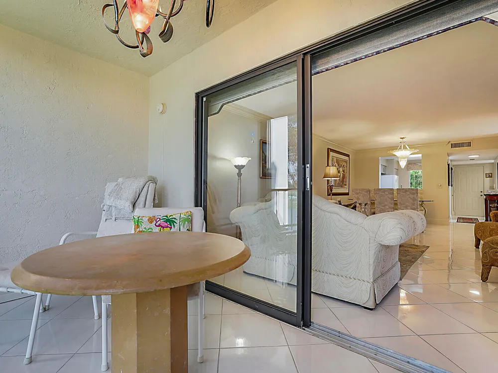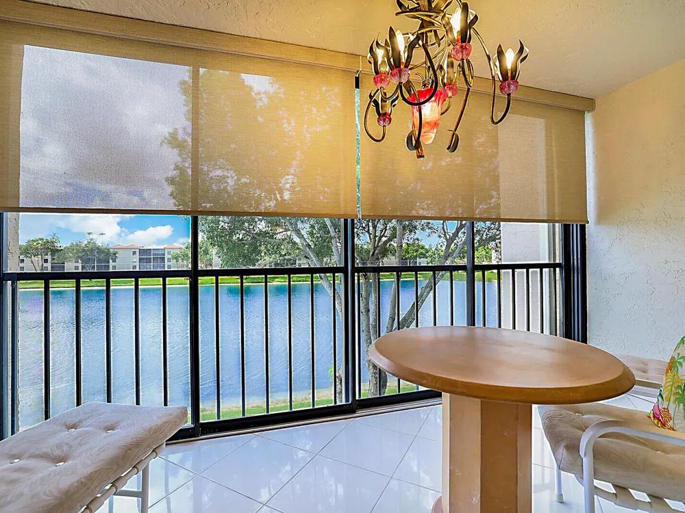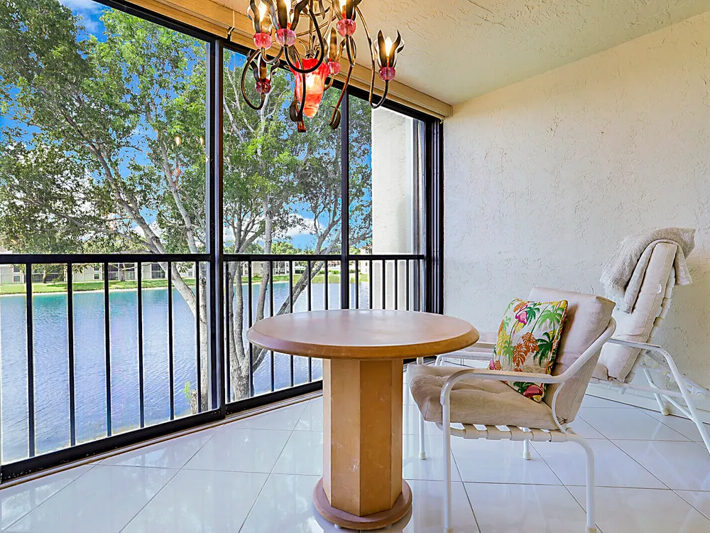 Live every day like you're on vacation in this beautifully designed condo that blends style, comfort, and serene water views. From the moment you step inside, you'll be greeted by a bright, open living space with gleaming tile floors, crown molding, and an airy flow that's perfect for relaxing or entertaining. The elegant dining area sparkles under a crystal chandelier, setting the tone for unforgettable gatherings. The updated kitchen offers plenty of cabinetry, sleek counters, and a pass-through window for easy conversation while cooking. Both bathrooms have been updated to a modern elegant style. Wake up to peaceful water views from the master bedroom, then savor your morning coffee on the screened back patio overlooking the water and lush green space. With its tasteful finishes,