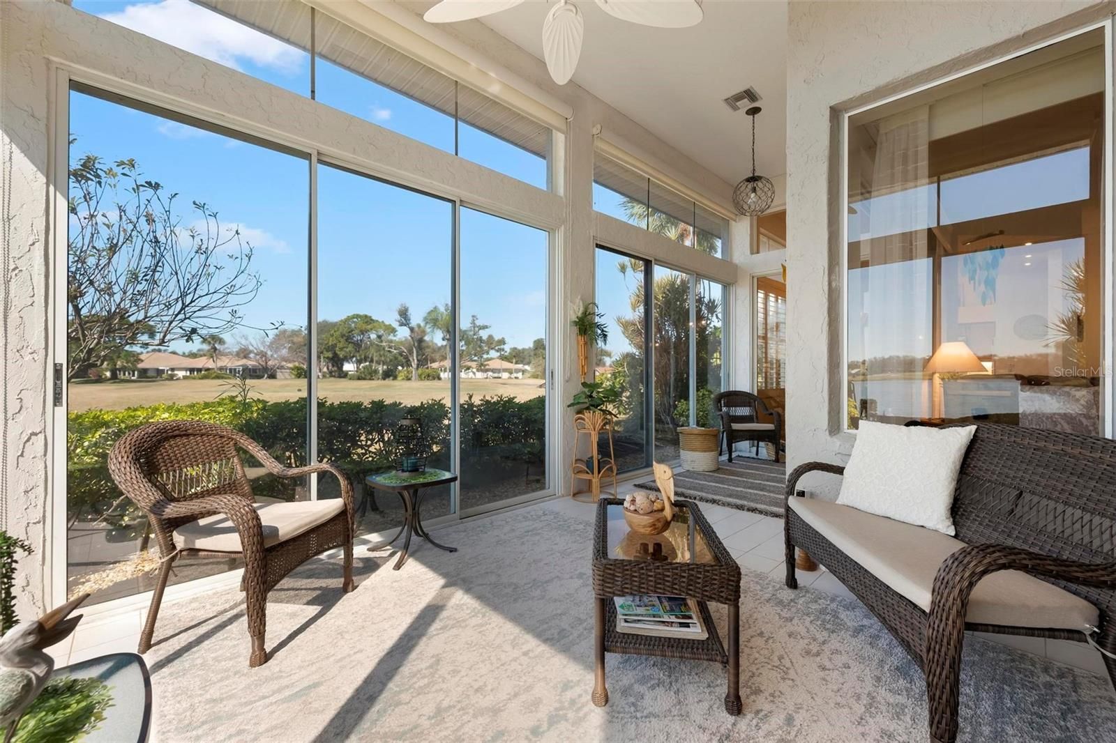 Located on one of the most desirable lots in Plantation Golf & Country Club, this Lynwood Glen, gated residence offers breathtaking views of the 17th tee box and a sweeping full-pond panorama with 47 feet of frontage. This three-bedroom, two-bath home features soaring 12-foot ceilings and new luxury vinyl flooring throughout, creating a bright and elegant living space. The kitchen has wood cabinetry, Corian countertops, new fixtures, and Plantation shutters, blending classic style with modern updates. Recent improvements include a 2020 roof, new gutters, and a new water heater, all HVAC parts updated, providing peace of mind. The expansive lanai is ideal for year-round enjoyment, featuring screens and one-way glass for privacy while preserving the stunning pond views. Additional highlights include a two-car garage with built-in shelving, a covered front porch shaded by a protected Southern Magnolia heritage tree, a rare and beautiful natural feature. This exceptional property combines unmatched views, thoughtful upgrades, and timeless Florida charm in one of the community's premier locations.