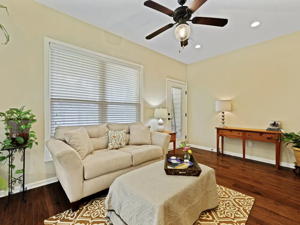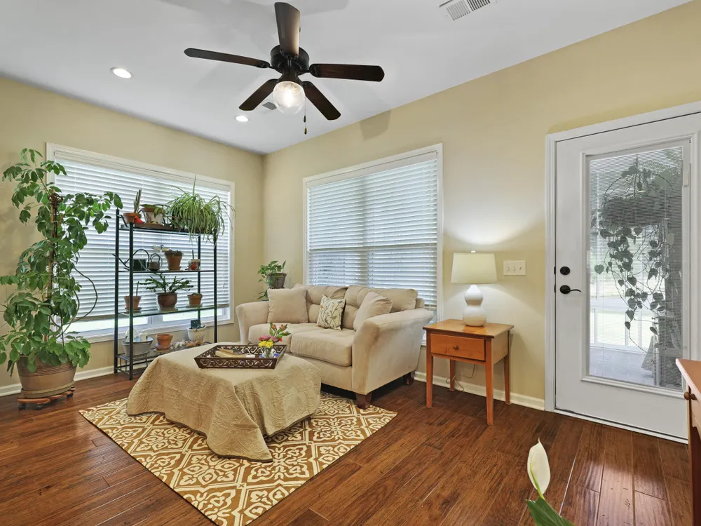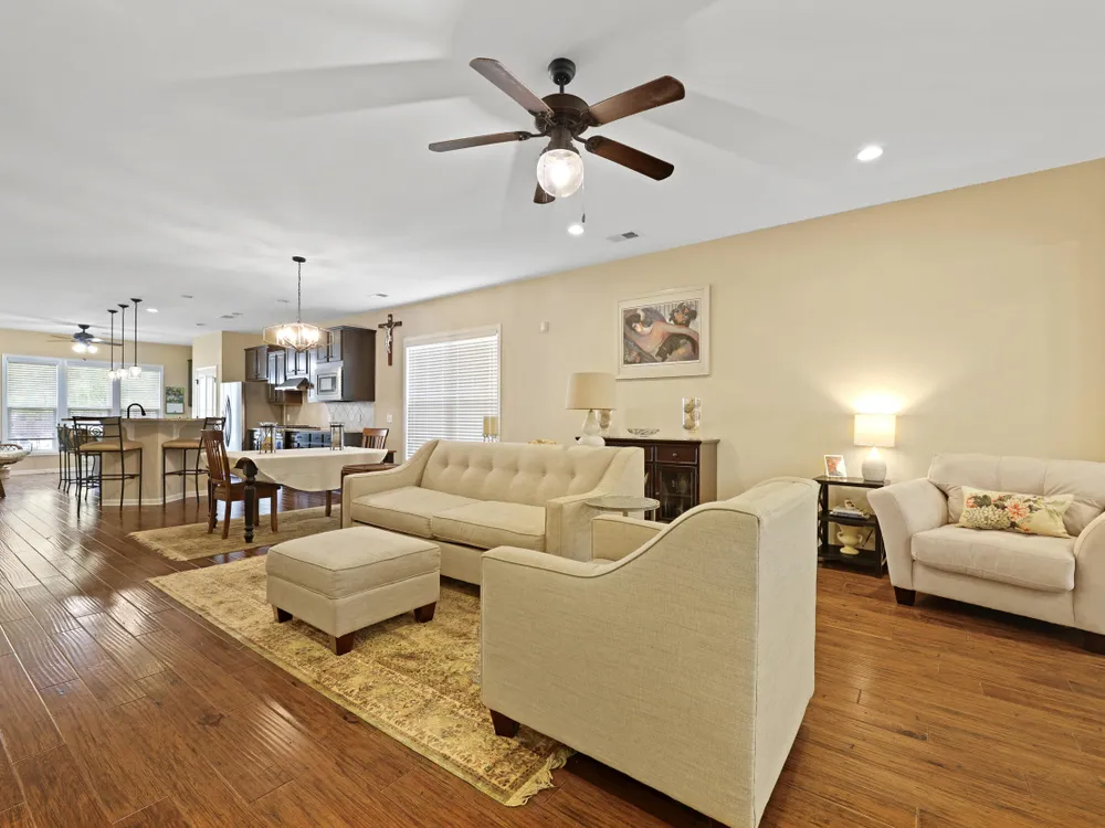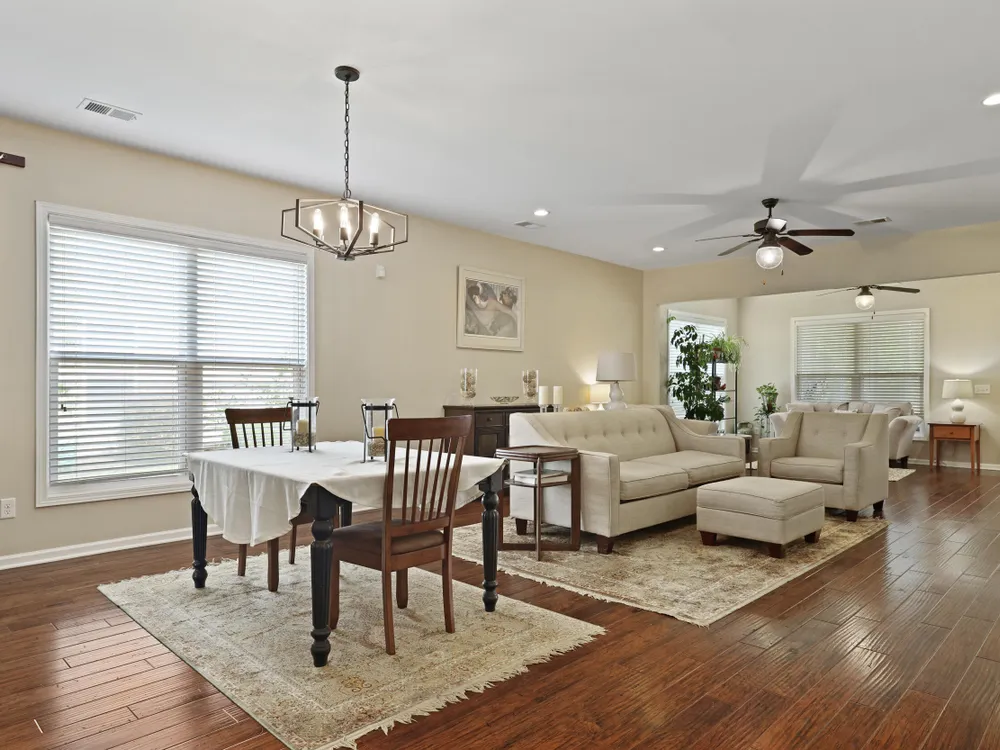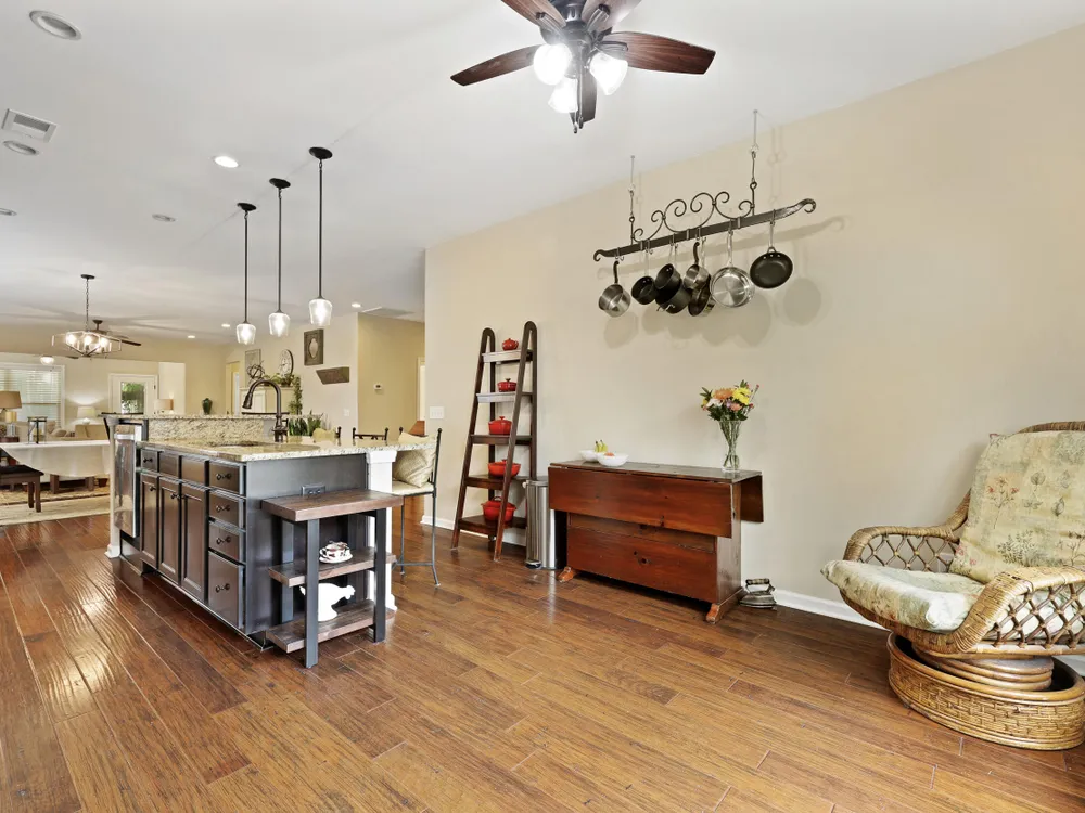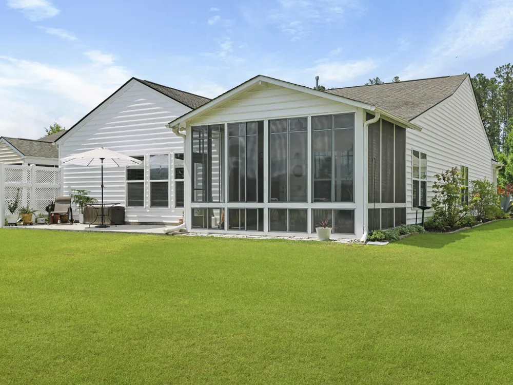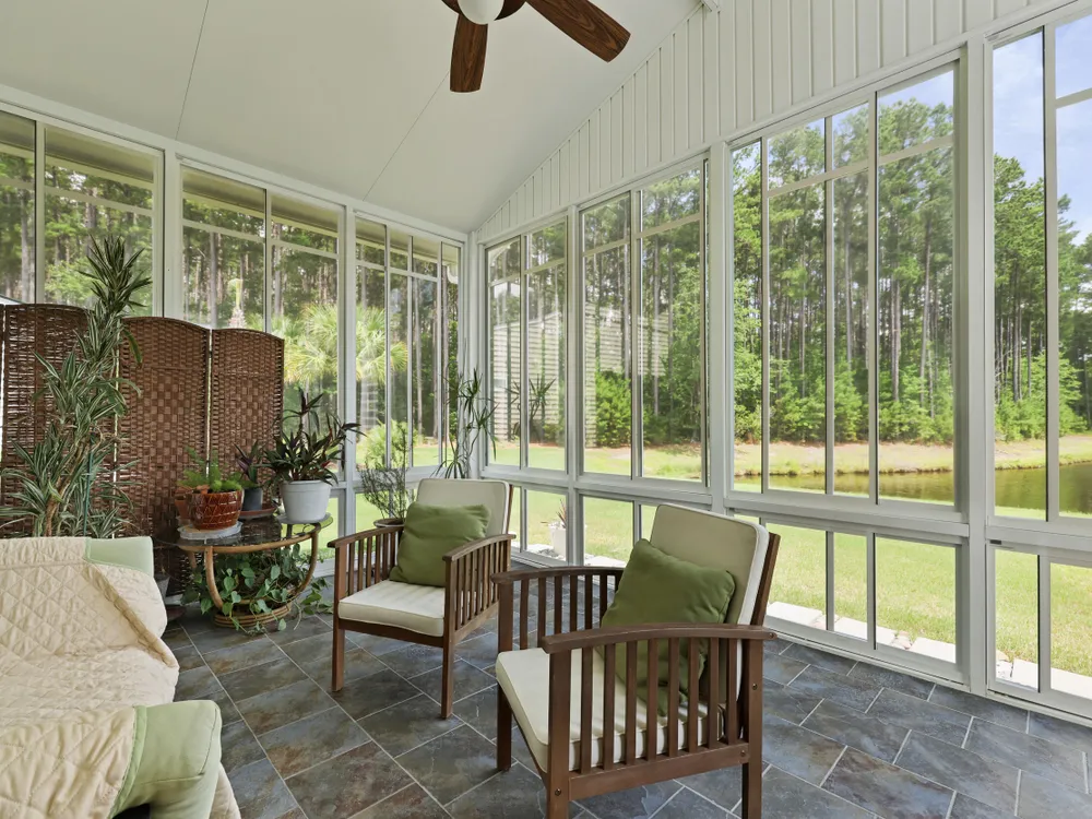 Premium location in Del Webb! Tucked at the end of a quiet cul-de-sac, this Kendall Park model backs to a sparkling pond and buffer of woods, creating a private, nature-filled sanctuary you'll enjoy year-round.Interior Highlights2 beds | 2 full baths | Flex room with closet--ideal for an office, craft studio, or occasional third bedroom.Open concept main living with sightlines from the kitchen to dining, great room, sunroom, and beyond.Hardwood floors throughout--no carpet anywhere.Chef's kitchen: oversized granite island, gas range, subway-tile backsplash, pantry, plus a morning room with built-in granite desk & upper cabinets.Split bedroom layout keeps the guest suite and fully tiled bath privatedown its own hall. Luxurious primary retreat: tray ceiling, lagoon views, dual-sink granite vanity, water closet, tiled walk-in shower, and an oversized walk-in closet. Dedicated laundry room with tile flooring, shelving, and washer/dryer on storage pedestals. Outdoor & Structural Features Bright sunroom flows to an expansive tiled screened porch fitted with year-round Eze-Breeze windowsperfect for morning coffee or sunset happy hours. Two-car garage with screened door, pull-down attic ladder to floored storage, and an interior drop-zone with large closet. Tankless water heater for endless hot water and energy efficiency. Community Perks Living in Del Webb Cane Bay means access to a 20,000-sq-ft clubhouse, indoor & outdoor pools, fitness center, pickleball and tennis courts, bocce, nature trails, and an active calendar of clubs and eventsall just minutes from shopping, dining, and historic downtown Charleston. Move-in ready and meticulously maintained, this home delivers the low-maintenance lifestyle you've been seeking with the privacy and views you deserve.