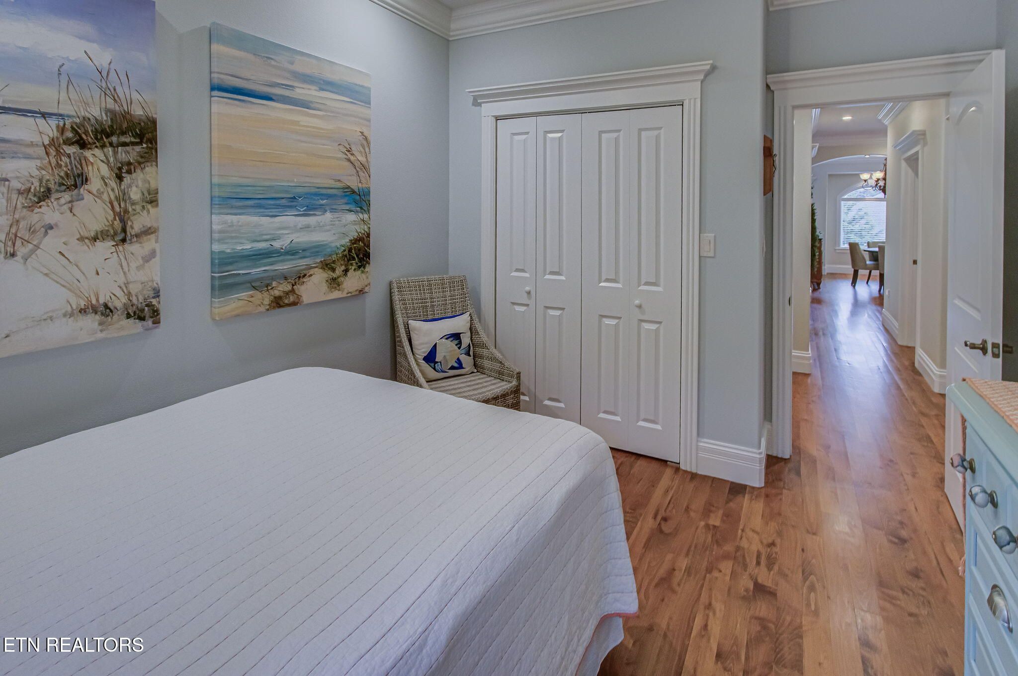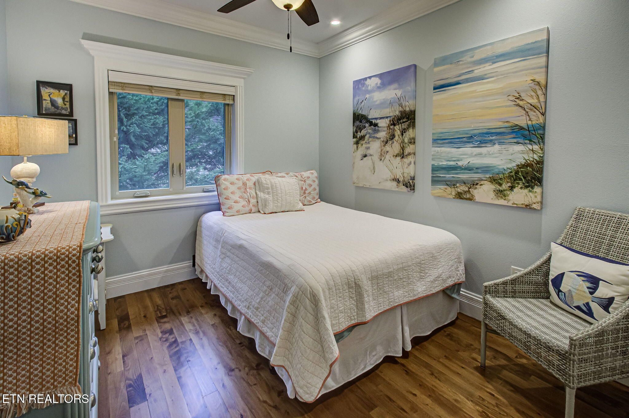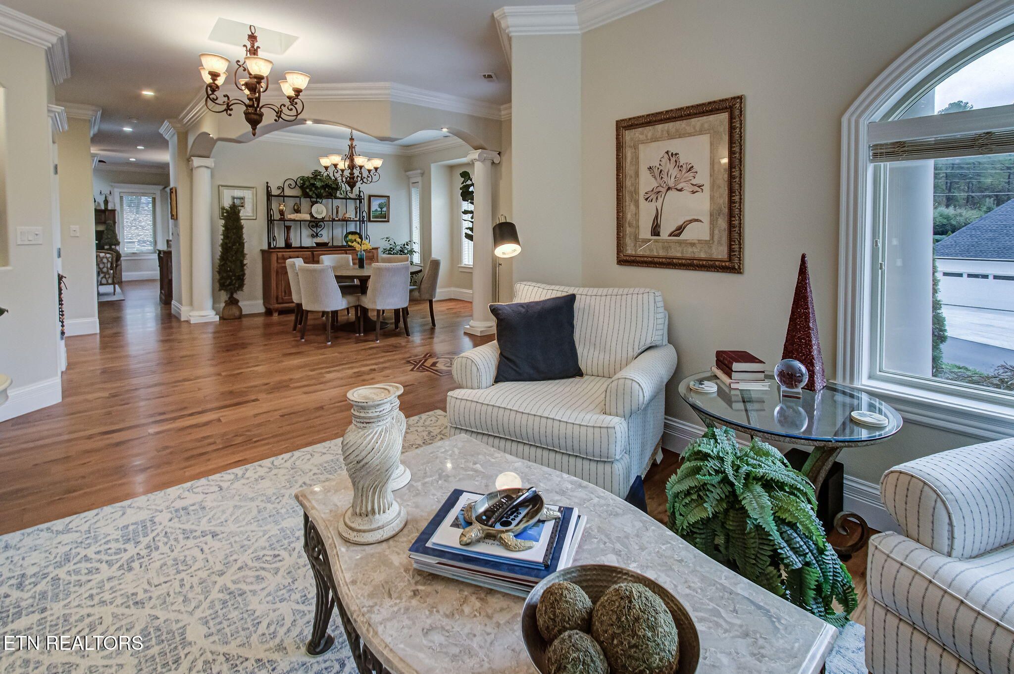 Here is a rare opportunity to own a beautiful, Custom-crafted builder's home in the highly desired and peaceful Tanasi Shores neighborhood on the north end of Tellico Village—with no traffic noise and exceptional privacy. This stunning one-level, all-brick home with stone accents offers outstanding curb appeal and low-to-no-maintenance living with no mowing, making it ideal for relaxed retirement or easy everyday living. Situated on a coveted corner lot with a circular drive, the home is located across from the lake, offering partial seasonal lake views. Additional side and backyard parking adds convenience for guests. Guests are welcomed by a towering stone-covered arched portico with classic marble-tiled, extra-wide steps and a spacious landing. An extraordinary mahogany double door with wrought iron accents sets the tone for the exceptional craftsmanship found throughout the home. Inside, enjoy solid hardwood flooring throughout—no carpet—and the luxury of heated flooring in all three bathrooms. The thoughtfully designed floor plan flows beautifully, offering comfortable everyday living while providing ample space for family gatherings and visitors. Custom woodwork, elegant finishes, Hunter ceiling fans, accent lighting, and dimmers enhance every room. The heart of the home features a spacious eat-in kitchen and cozy keeping room, complete with stainless steel appliances, granite countertops, designer custom cabinetry, pantry, counter-height island seating, fireplace, and direct access to an outdoor dining area. This expansive kitchen offers flexibility to suit a variety of lifestyles and entertaining needs. The primary suite is a true retreat, featuring double-door entry, a bay window overlooking the private courtyard, and a luxurious ensuite with jetted soaking tub, walk-in shower, dual vanities, and a generous walk-in closet. Additional spaces include two guest bedrooms, a multipurpose office, a full guest bath, and a dedicated laundry room. The oversized double-height two-car garage includes mounted adjustable overhead storage racks. Step outside to a truly serene outdoor living retreat, featuring a spacious private courtyard, covered and tiled patio with gate, elegant walkways, and lavish, professionally designed landscaping offering year-round color and delightful blooming surprises throughout the seasons—creating a peaceful Zen-like atmosphere. This home was constructed with purposeful energy efficiency, including 2x6 framing and insulation, custom windows and blinds, double-insulated easy-roll UV-tinted windows, and quality materials throughout. Located in the award-winning Tellico Village golf and lake community, nestled in the foothills of the Great Smoky Mountains, this home is truly unique, thoughtfully designed, and exceptionally special.