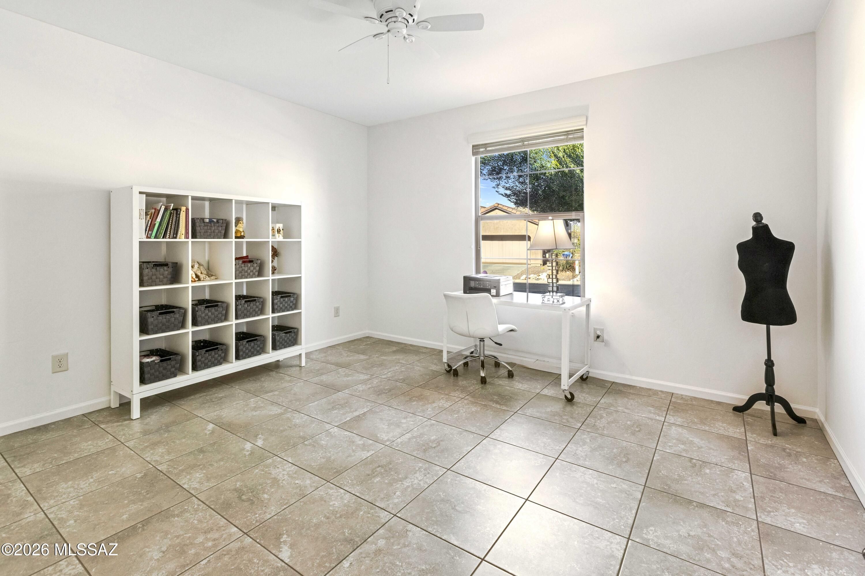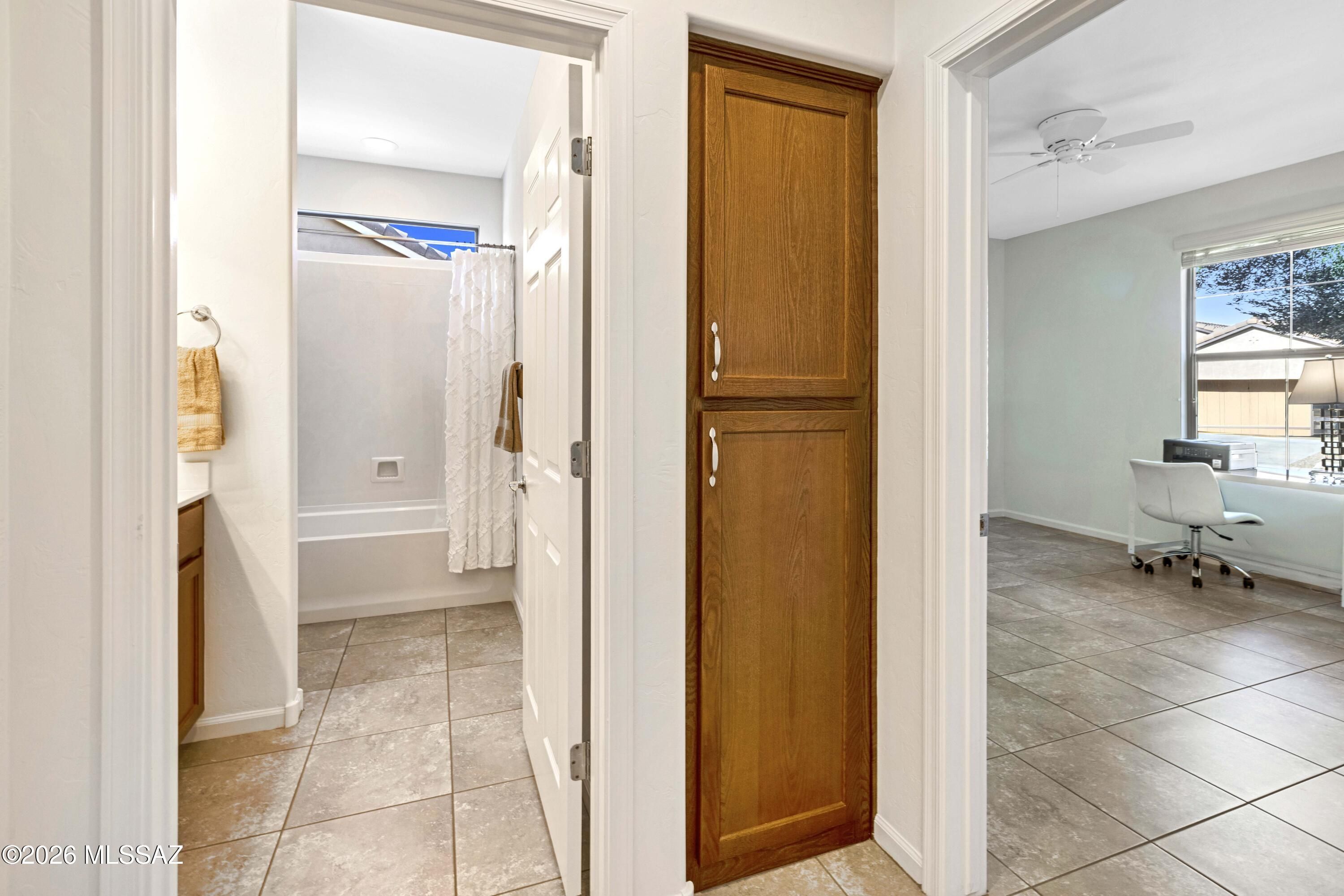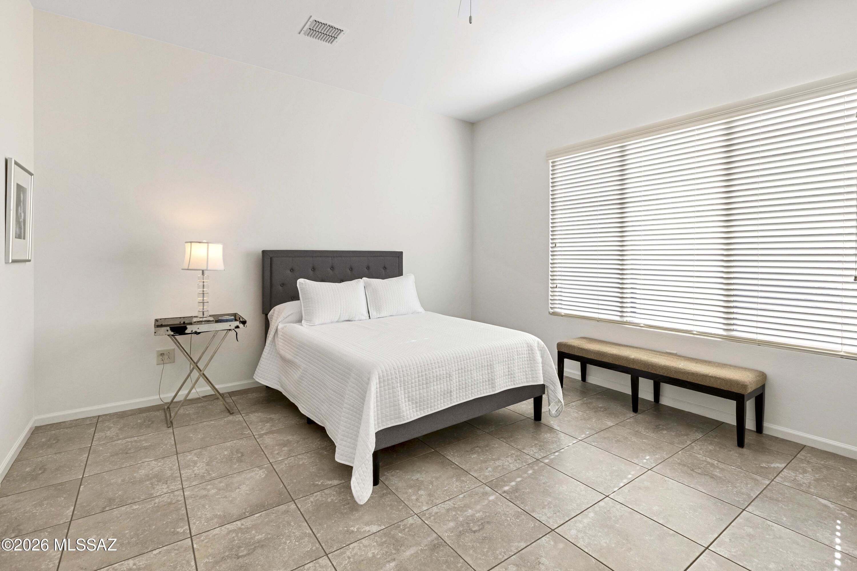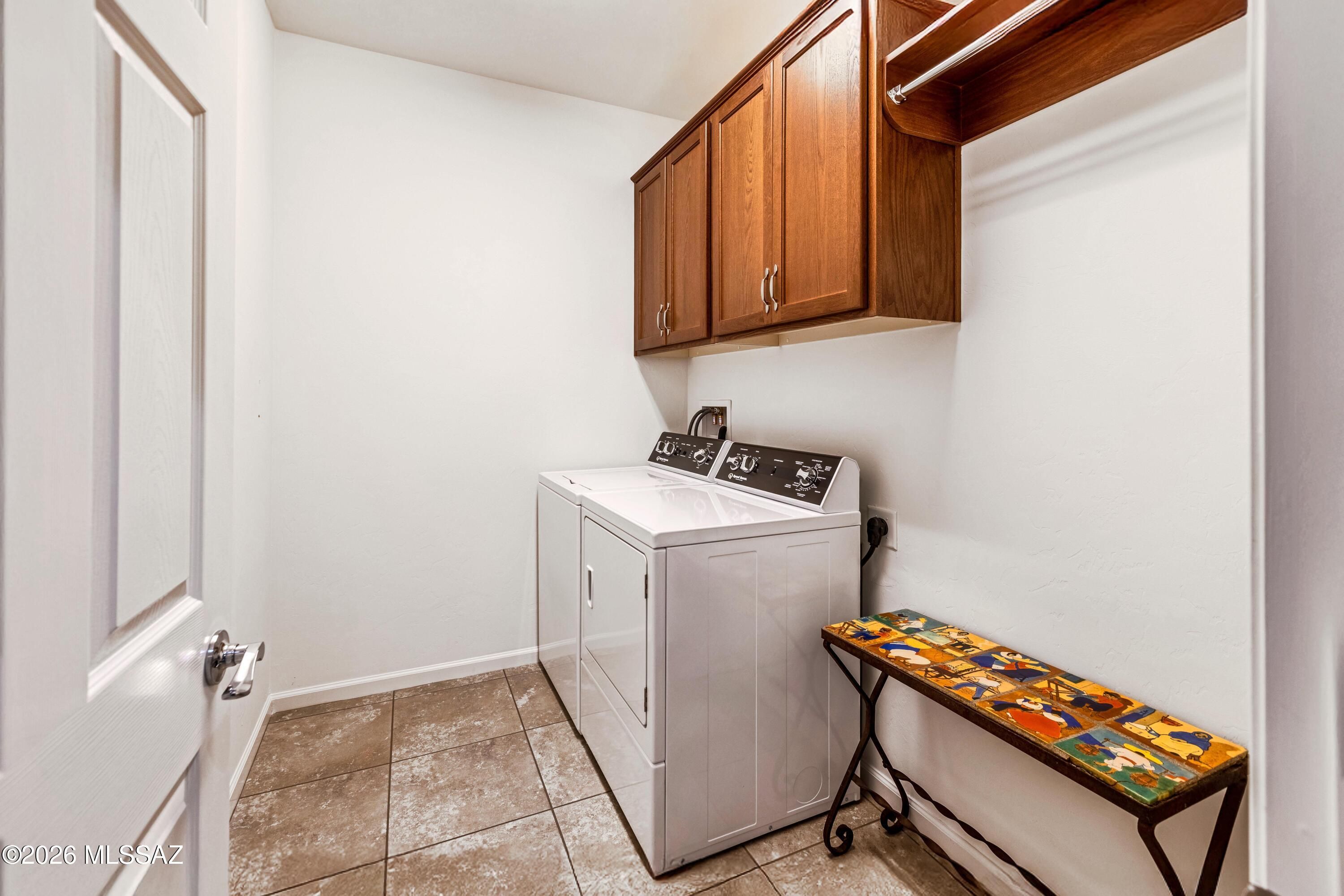 This small but mighty, pristine Hermosa home comes with some desirable features that you won't find in other petite Saddlebrooke Ranch homes! It has a 2-car garage plus a golf cart bay. The Kinetico dual-tank efficient water softener with filter, plus a reverse osmosis system under the kitchen sink, ensure clean water. The home also features ceramic tile floors throughout, a split-bedroom floorplan and plenty of space in the bright main living area for entertaining. The kitchen has a large island, granite tops, and updated lighting. Storage abounds with upper and lower cabinets in the entry valet and additional storage in the laundry room. The primary suite is complete with dual vanities, a step-in shower, walk-in closet, separate toilet room, and pantry cabinet. The second bedroom is