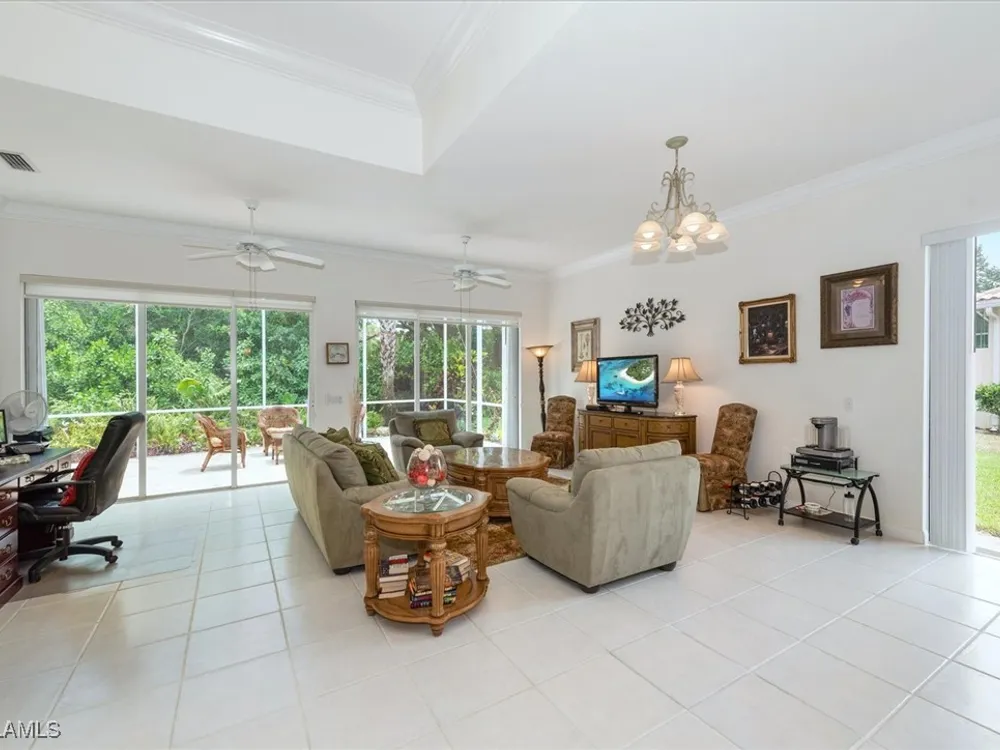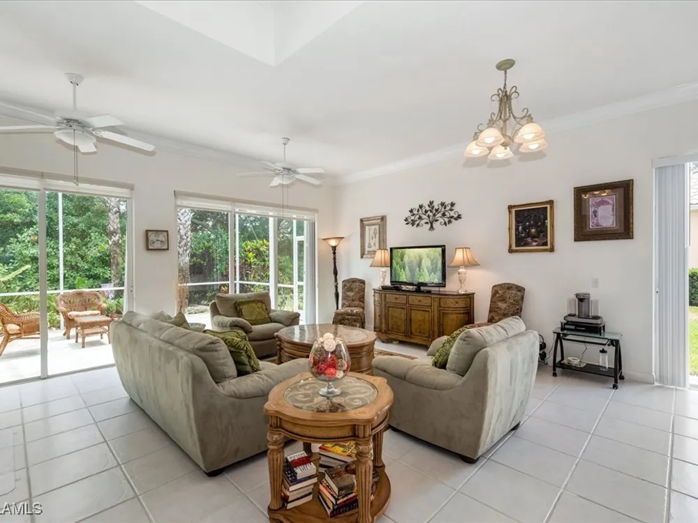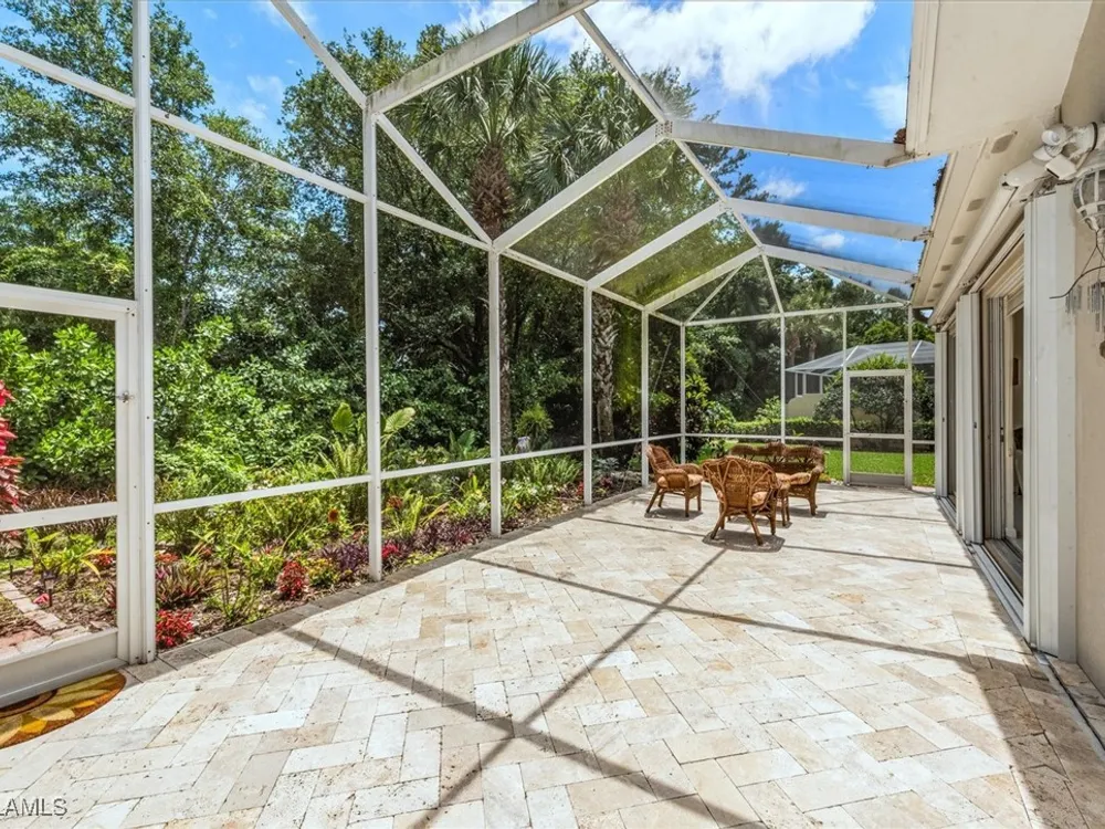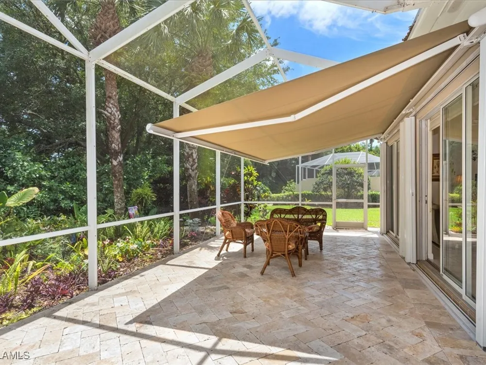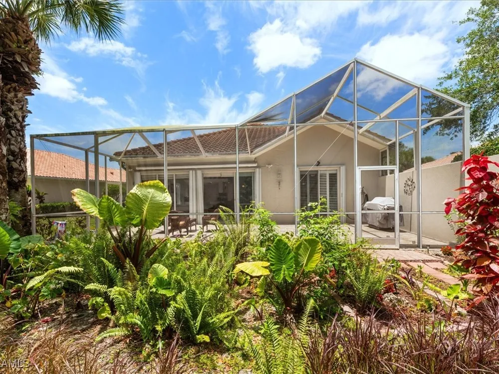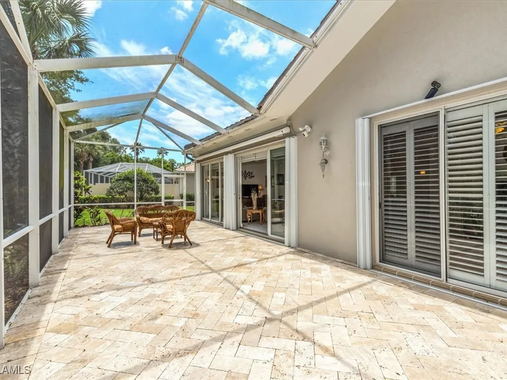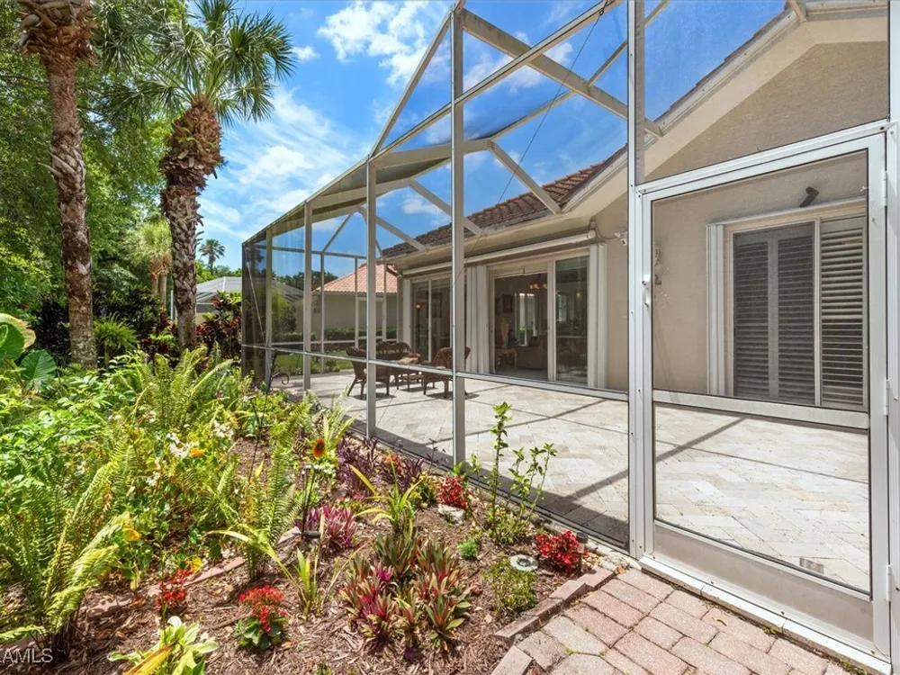 Welcome to this former DiVosta model home. The Oakmont features an open floor plan with an extended living room and includes 3 bedrooms plus a den, which has converted into a 4th bedroom. It is ideally suited for family living and is highly comfortable. The master bedroom offers his and her bathrooms with a jacuzzi soaking tub. The kitchen, equipped with new stainless steel appliances (2022), is perfect for entertaining and opens up to the great room featuring 12-foot volume ceilings. The laundry room, with a new washer and dryer (2021), provides ample cabinet storage and a sink for added convenience. The property offers several upgrades, these include luxury vinyl plank flooring in all bedrooms and tile flooring throughout the main areas of the house. The windows feature plantation shutters, and the sliders have custom window treatments. Crown molding is present throughout the entire home, which has been recently painted on the interior. Additional features include wood trim, chair rails, a custom built wall unit, screened front-entry enclosure, and freshly painted exterior. The roof and gutters were replaced in 2020, offering years of protection and peace of mind. The home also includes a central vacuum system, hurricane shutters, whole-house power surge protector, and a spacious screened lanai area with new Travertine tiles. A retractable electric awning provides a wonderful outdoor entertaining space. The private backyard is beautifully maintained with flower gardens and offers significant privacy as it backs up to a landscaped area. Island Walk offers a resort lifestyle with affordable HOA fees that include cable and internet services. This prestigious community features numerous exceptional amenities such as seven Har-Tru tennis courts, four pickleball courts, croquet and bocce courts, a resort-style pool and lap pool, drive-through car wash, gas station, nail salon, hair salon, post office, and an excellent restaurant. The main town center building encompasses a library and a state-of-the-art fitness center. Conveniently located in North Naples, this community is close to schools, shopping centers, beaches, and various other attractions