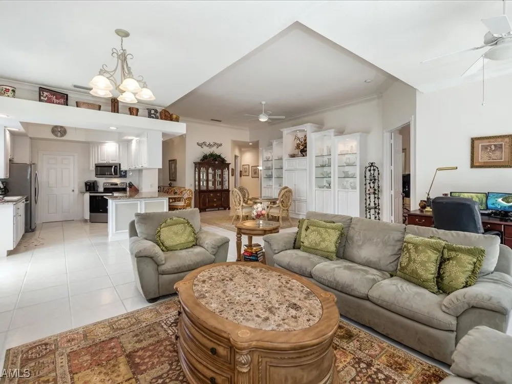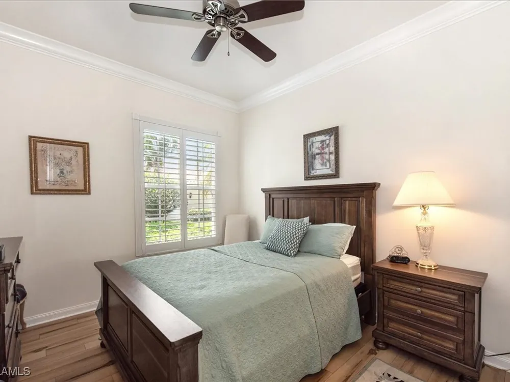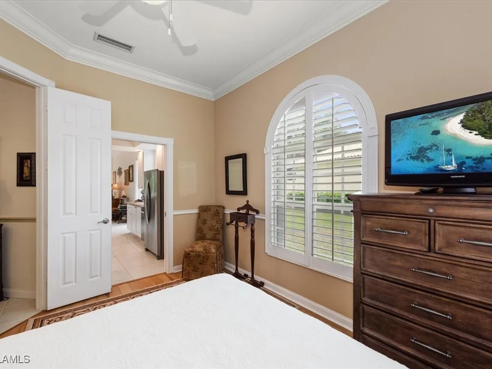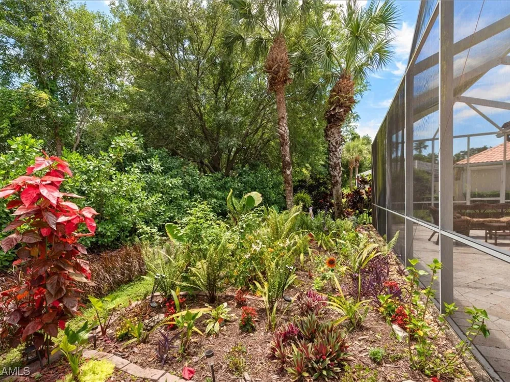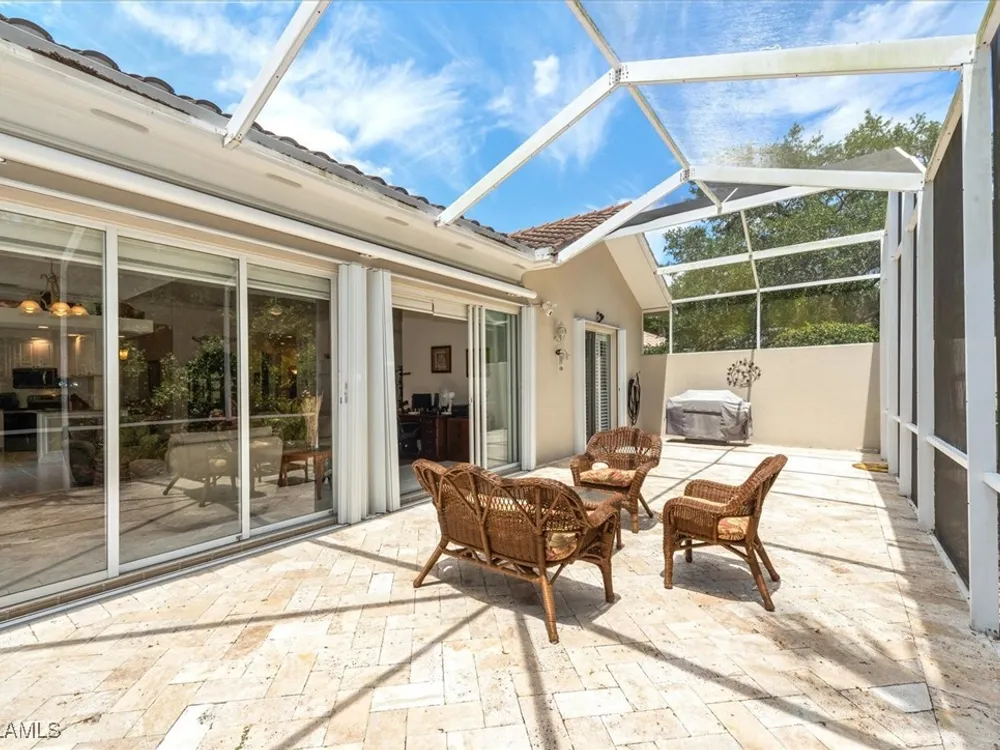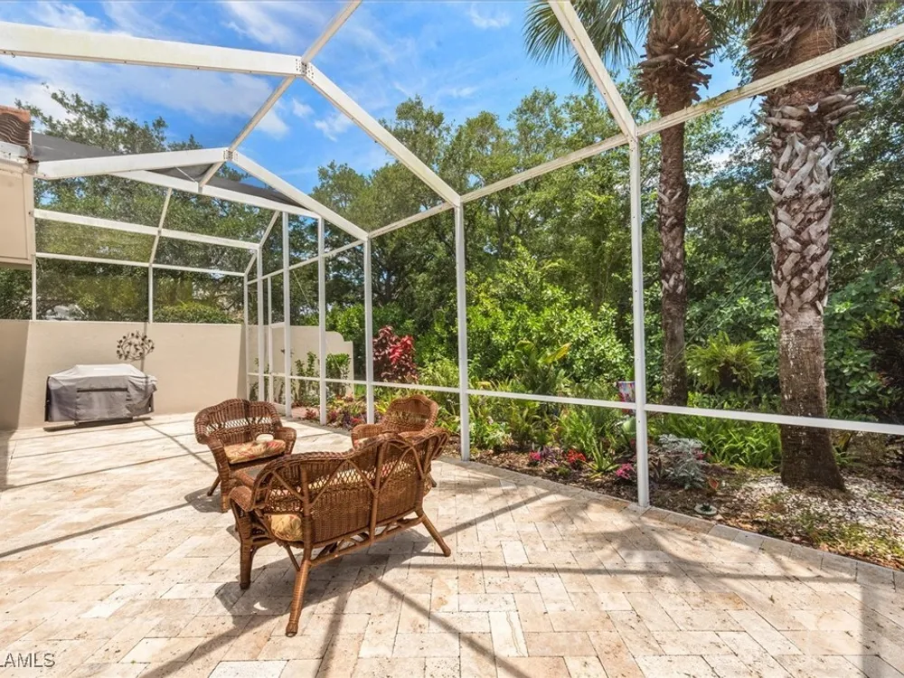 Welcome to this former DiVosta model home. The Oakmont features an open floor plan with an extended living room and includes 3 bedrooms plus a den, which has converted into a 4th bedroom. It is ideally suited for family living and is highly comfortable. The master bedroom offers his and her bathrooms with a jacuzzi soaking tub. The kitchen, equipped with new stainless steel appliances (2022), is perfect for entertaining and opens up to the great room featuring 12-foot volume ceilings. The laundry room, with a new washer and dryer (2021), provides ample cabinet storage and a sink for added convenience. The property offers several upgrades, these include luxury vinyl plank flooring in all bedrooms and tile flooring throughout the main areas of the house. The windows feature plantation shutters, and the sliders have custom window treatments. Crown molding is present throughout the entire home, which has been recently painted on the interior. Additional features include wood trim, chair rails, a custom built wall unit, screened front-entry enclosure, and freshly painted exterior. The roof and gutters were replaced in 2020, offering years of protection and peace of mind. The home also includes a central vacuum system, hurricane shutters, whole-house power surge protector, and a spacious screened lanai area with new Travertine tiles. A retractable electric awning provides a wonderful outdoor entertaining space. The private backyard is beautifully maintained with flower gardens and offers significant privacy as it backs up to a landscaped area. Island Walk offers a resort lifestyle with affordable HOA fees that include cable and internet services. This prestigious community features numerous exceptional amenities such as seven Har-Tru tennis courts, four pickleball courts, croquet and bocce courts, a resort-style pool and lap pool, drive-through car wash, gas station, nail salon, hair salon, post office, and an excellent restaurant. The main town center building encompasses a library and a state-of-the-art fitness center. Conveniently located in North Naples, this community is close to schools, shopping centers, beaches, and various other attractions