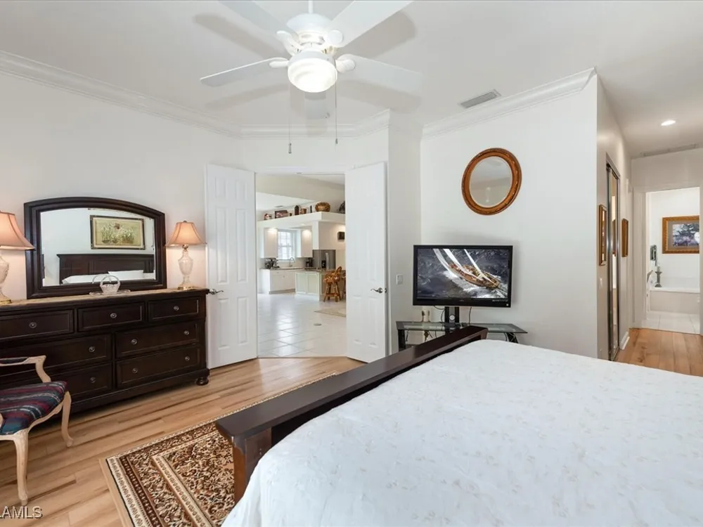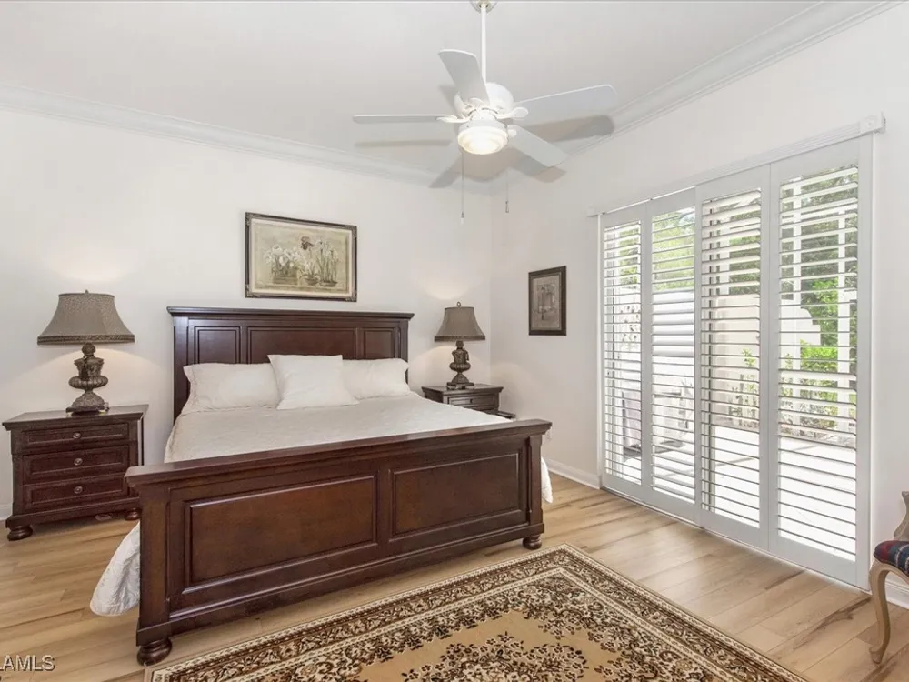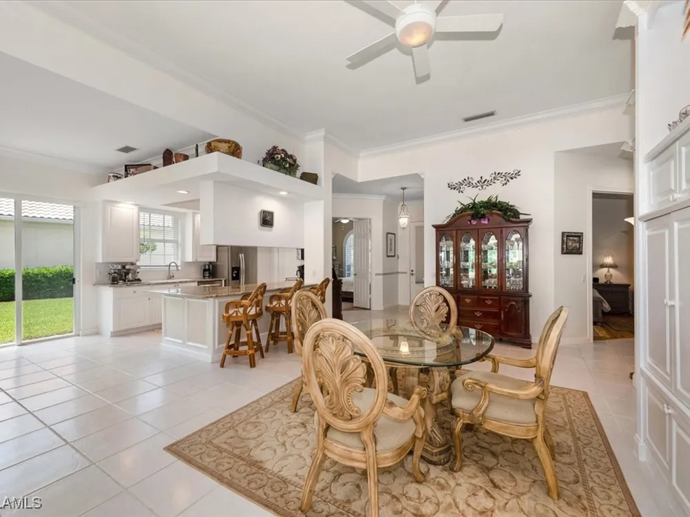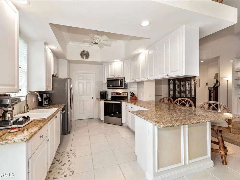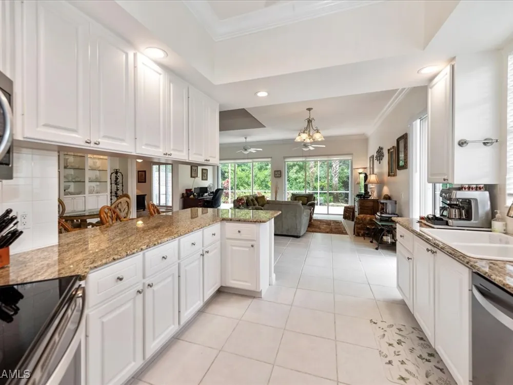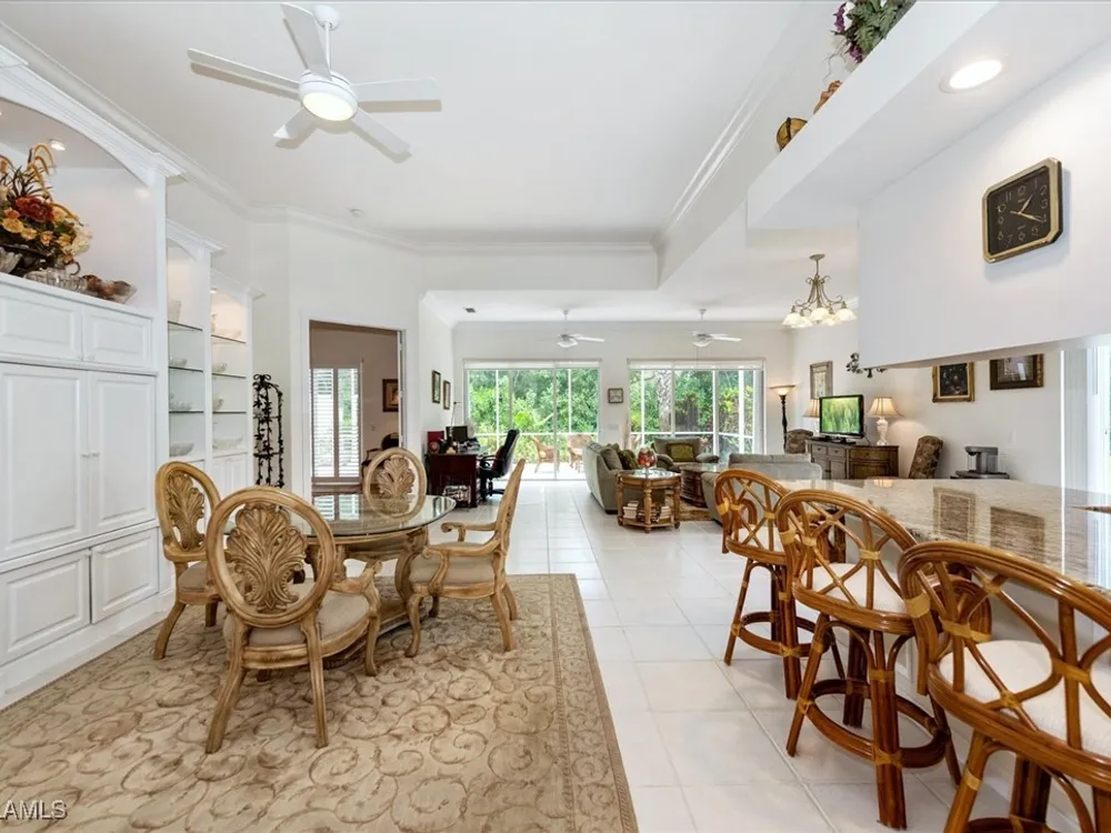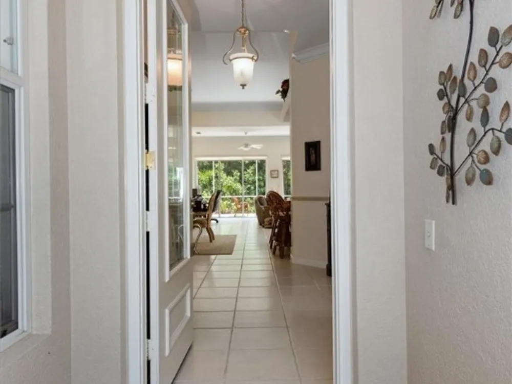 Welcome to this former DiVosta model home. The Oakmont features an open floor plan with an extended living room and includes 3 bedrooms plus a den, which has converted into a 4th bedroom. It is ideally suited for family living and is highly comfortable. The master bedroom offers his and her bathrooms with a jacuzzi soaking tub. The kitchen, equipped with new stainless steel appliances (2022), is perfect for entertaining and opens up to the great room featuring 12-foot volume ceilings. The laundry room, with a new washer and dryer (2021), provides ample cabinet storage and a sink for added convenience. The property offers several upgrades, these include luxury vinyl plank flooring in all bedrooms and tile flooring throughout the main areas of the house. The windows feature plantation shutters, and the sliders have custom window treatments. Crown molding is present throughout the entire home, which has been recently painted on the interior. Additional features include wood trim, chair rails, a custom built wall unit, screened front-entry enclosure, and freshly painted exterior. The roof and gutters were replaced in 2020, offering years of protection and peace of mind. The home also includes a central vacuum system, hurricane shutters, whole-house power surge protector, and a spacious screened lanai area with new Travertine tiles. A retractable electric awning provides a wonderful outdoor entertaining space. The private backyard is beautifully maintained with flower gardens and offers significant privacy as it backs up to a landscaped area. Island Walk offers a resort lifestyle with affordable HOA fees that include cable and internet services. This prestigious community features numerous exceptional amenities such as seven Har-Tru tennis courts, four pickleball courts, croquet and bocce courts, a resort-style pool and lap pool, drive-through car wash, gas station, nail salon, hair salon, post office, and an excellent restaurant. The main town center building encompasses a library and a state-of-the-art fitness center. Conveniently located in North Naples, this community is close to schools, shopping centers, beaches, and various other attractions