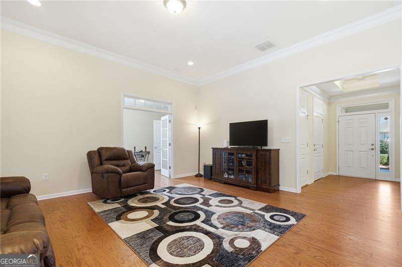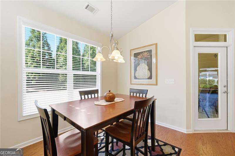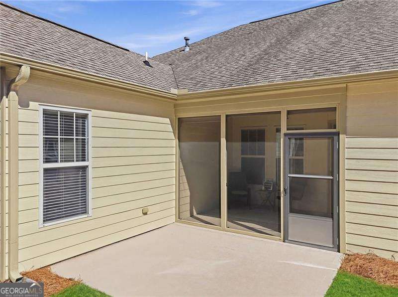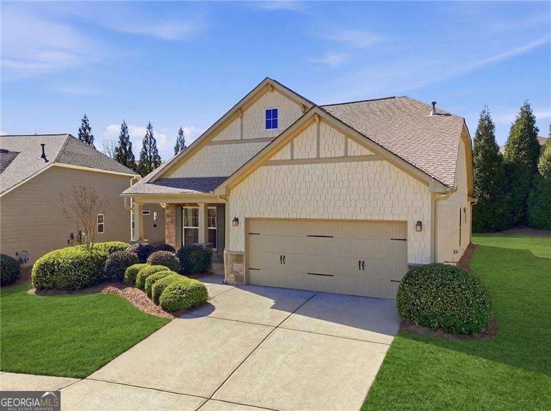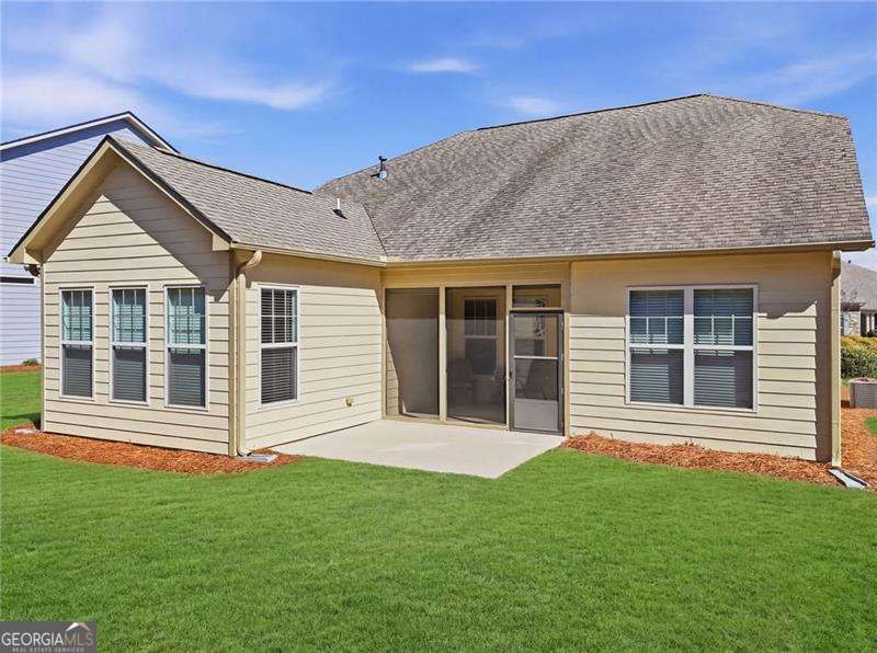 This Ambrose floorplan home sits on a spacious, private flat lot and includes a screened porch and extended patio. The open layout with 11-foot ceilings in main areas and trey ceilings in select rooms creates a spacious feel. Features include immaculate wood floors, updated carpeting, a large kitchen island, brand new appliances, and extensive storage, including a walk-up attic and extra-large garage. The home has been well maintained, with recent servicing of the HVAC, roof, sprinkler system, plumbing inspection, and replacement of outside faucets, making it move-in ready. The home is in Soleil, Georgia's top active adult community spanning over 500 acres near Canton. Soleil offers indoor and outdoor pools, tennis and pickleball courts, a tennis center, gardens, a greenhouse, walking trails, and a 30,000-square-foot clubhouse with various amenities. Residents enjoy two full-time activity directors and over 50 clubs. There is always something to do in Soleil.