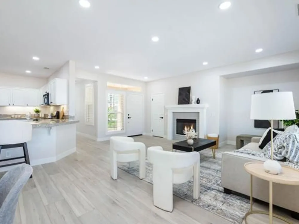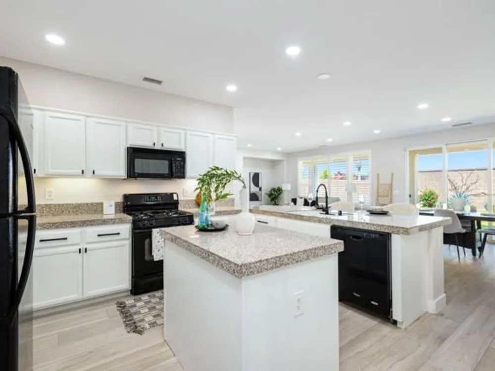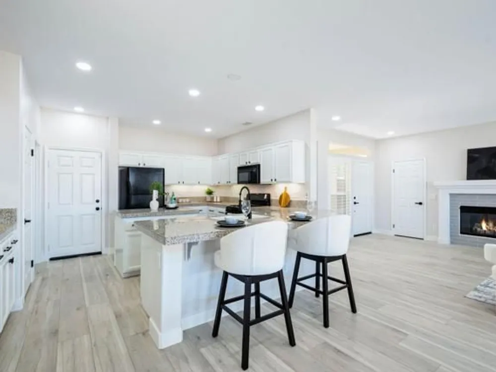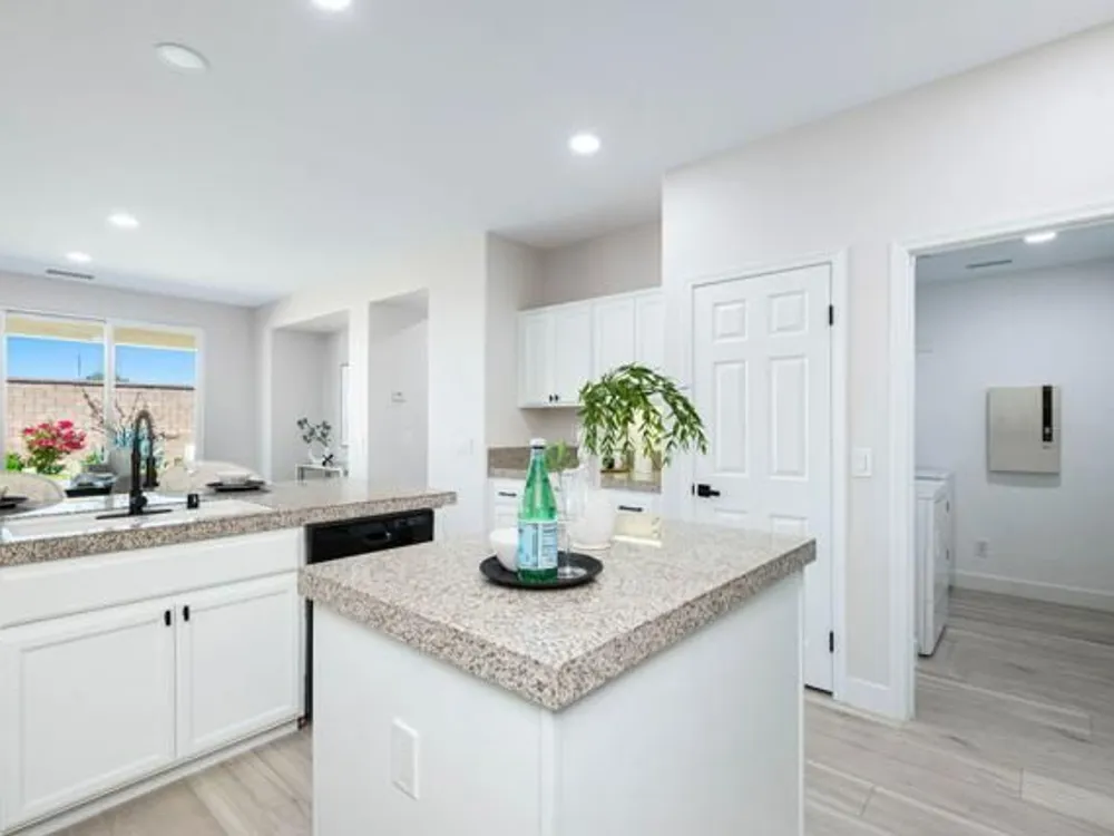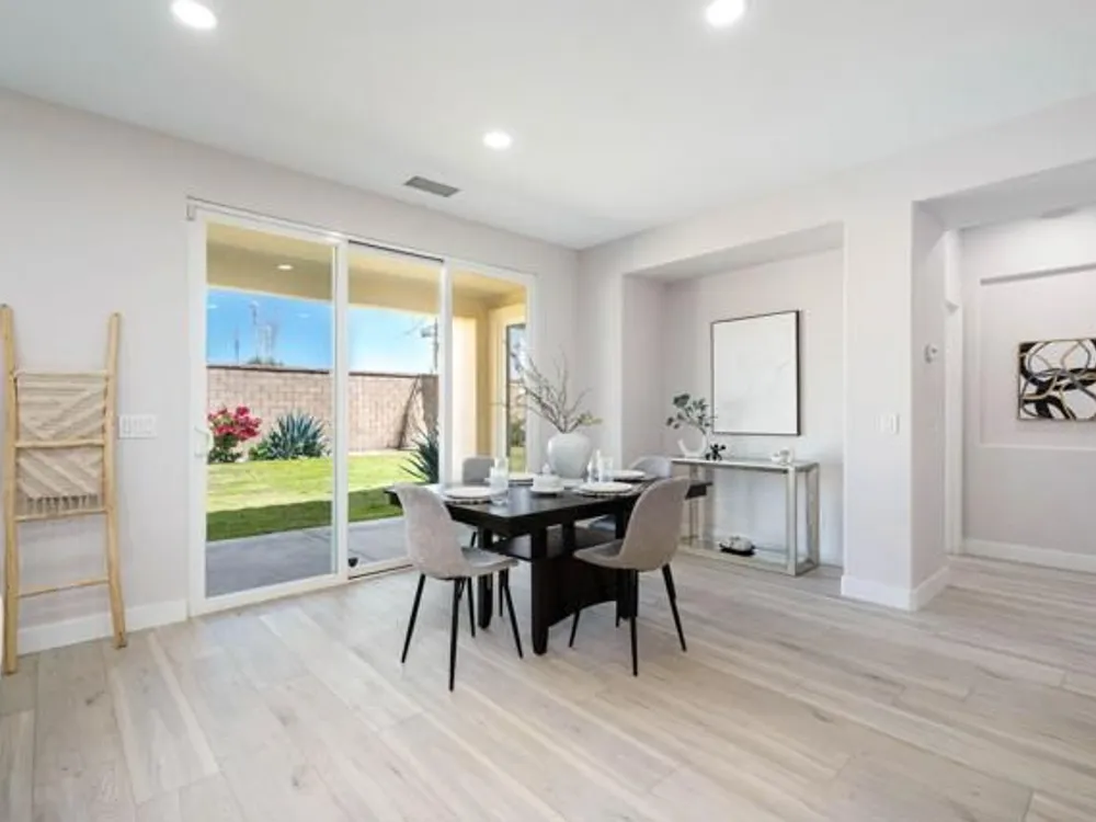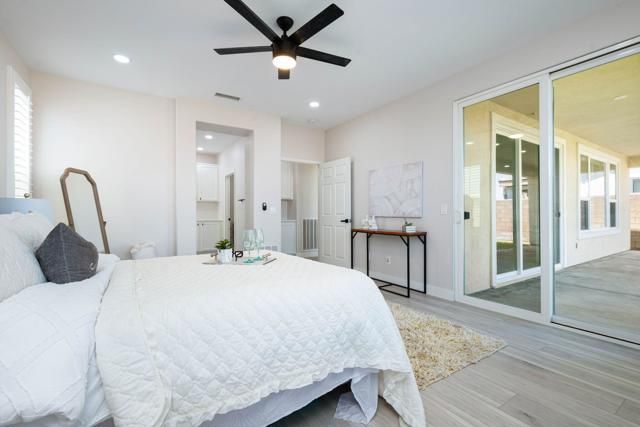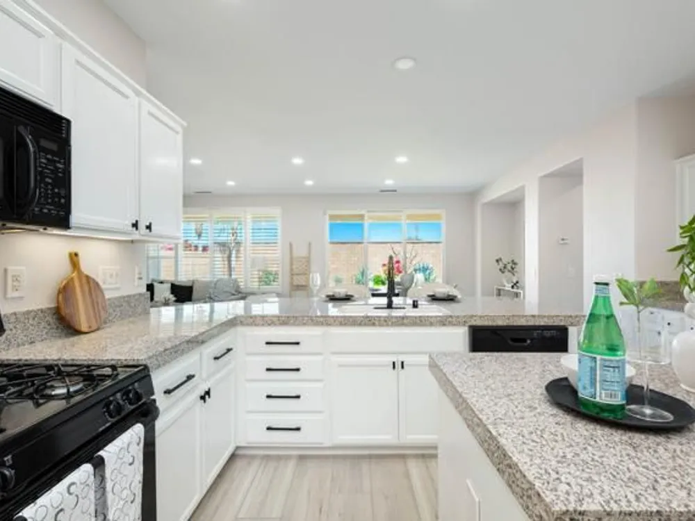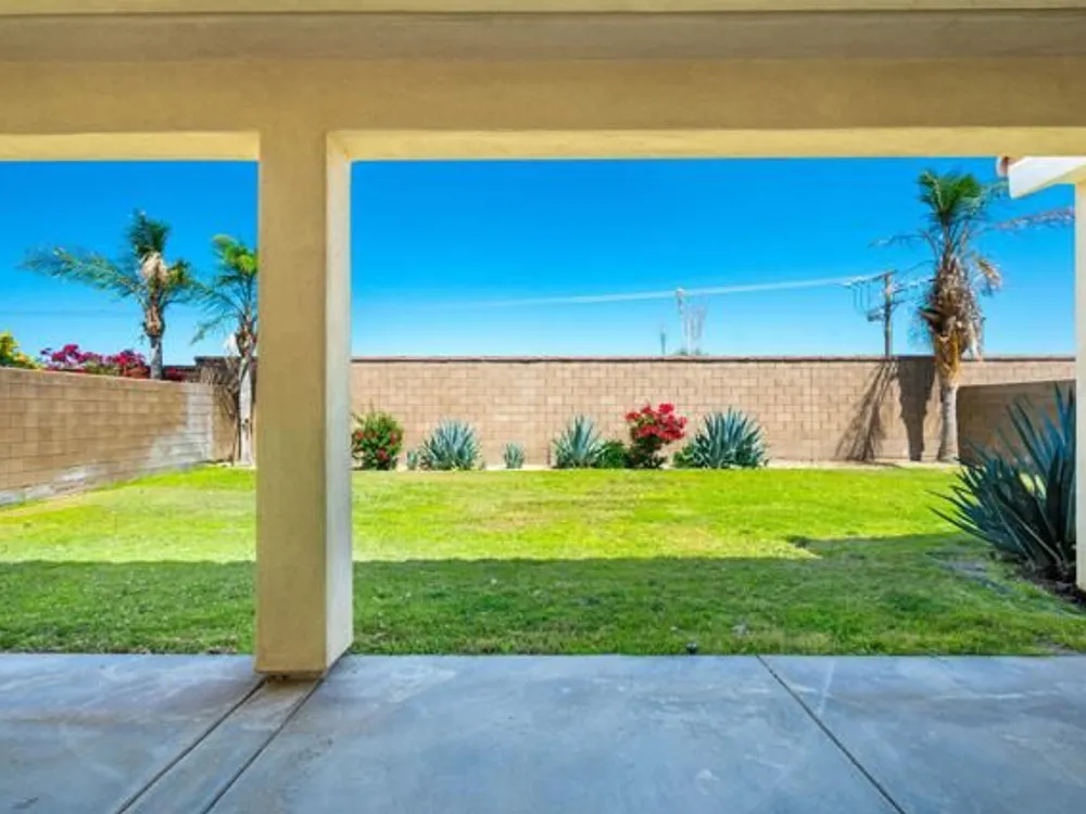 Welcome to Trilogy La Quinta, an exclusive 55+ resort community, where you'll find the epitome of luxury living in this stunning Oasis plan spanning 1580 square feet. This meticulously designed residence features 2 bedrooms and 2 baths, highlighted by a spacious great room adorned with plank flooring and a charming tile-surround gas log fireplace. Plantation shutters and a TV/Media niche add to the ambiance. The dining area is complemented by a hutch cavity and a soothing interior color scheme. The adjacent Chef's kitchen is a culinary haven, boasting granite counters, a peninsula with bar seating, black appliances, a prep island, pantry, and a gas range. Guests will enjoy their accommodations with a nearby full bath featuring a quartz counter, back-lit mirror, and shower-over-tub configuration. The primary retreat offers a slider to the back patio and an en suite bath complete with a dual vanity, large shower enclosure, and spacious walk-in closet. For added convenience, a separate laundry room with cabinetry is included. Outside, the rear yard presents a blank canvas with an extended covered patio and expansive views. Enjoy quick access to the Santa Rosa Clubhouse and its plethora of amenities and activities, just a short 5-minute golf cart ride away.