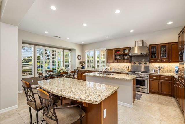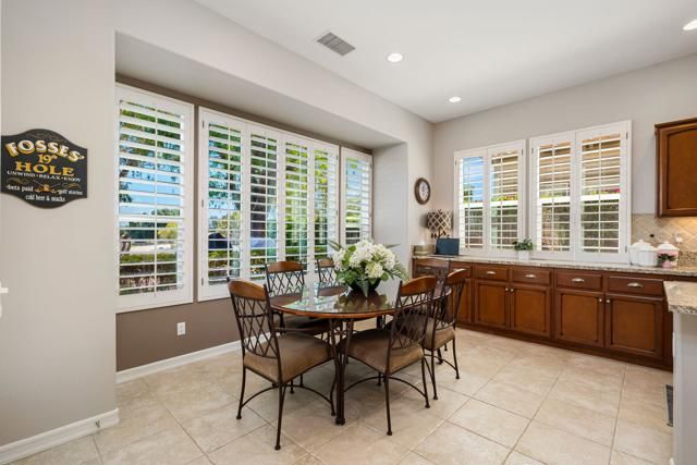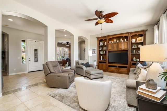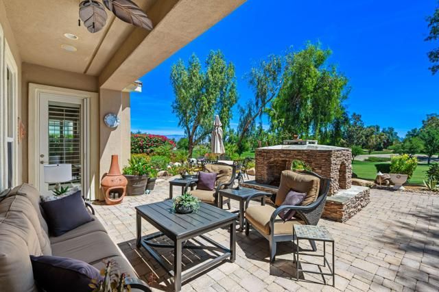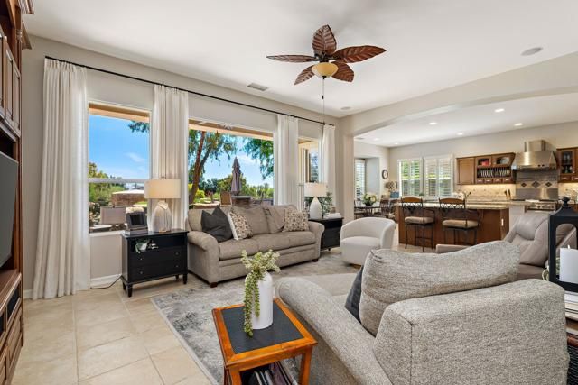 Welcome to this beautifully upgraded Oreas floorplan ideally positioned on the 1st fairway in Trilogy at La Quinta, located just a few doors from the Santa Rosa Clubhouse and offering an exceptional combination of location, privacy, and stunning golf course and mountain views. This thoughtfully designed residence features 2 bedrooms, 2.5 baths plus a den/office and a formal dining room that can easily be converted into a third bedroom, providing flexible living options to suit your needs. A private courtyard entry leads into a light-filled interior with tile flooring, plantation shutters throughout, and an open-concept layout ideal for both everyday living and entertaining. The great room showcases custom built-in cabinetry and large windows that seamlessly connect indoor and outdoor living, while the chef's kitchen is beautifully appointed with granite countertops, rich cabinetry, stainless steel appliances, double ovens, a large center island, and a separate prep island with wine refrigeration--perfect for hosting. The adjacent dining area is surrounded by windows, bringing in abundant natural light and views of the lush backyard. The spacious primary suite offers a comfortable retreat with a sitting area, direct access to the patio, and an ensuite bath featuring dual vanities, a walk-in shower, and an oversized walk-in closet with custom built-ins. Guest accommodations are privately situated, and the den/office provides an ideal space for remote work or hobbies. Additional highlights include a well-equipped laundry room with ample cabinetry and an oversized garage with built-in storage and workspace. Step outside to a truly exceptional outdoor living space featuring an expansive paver patio, covered seating area, built-in fireplace, BBQ station, and multiple entertaining areas, all surrounded by professionally landscaped grounds with vibrant color and mature greenery, perfectly positioned to capture sweeping views of the 1st fairway, driving range, and surrounding mountains. Located close to golf, fitness, tennis, pickleball, dining, and the vibrant lifestyle that defines Trilogy at La Quinta, this home represents a rare opportunity to own one of the community's premier golf course properties.