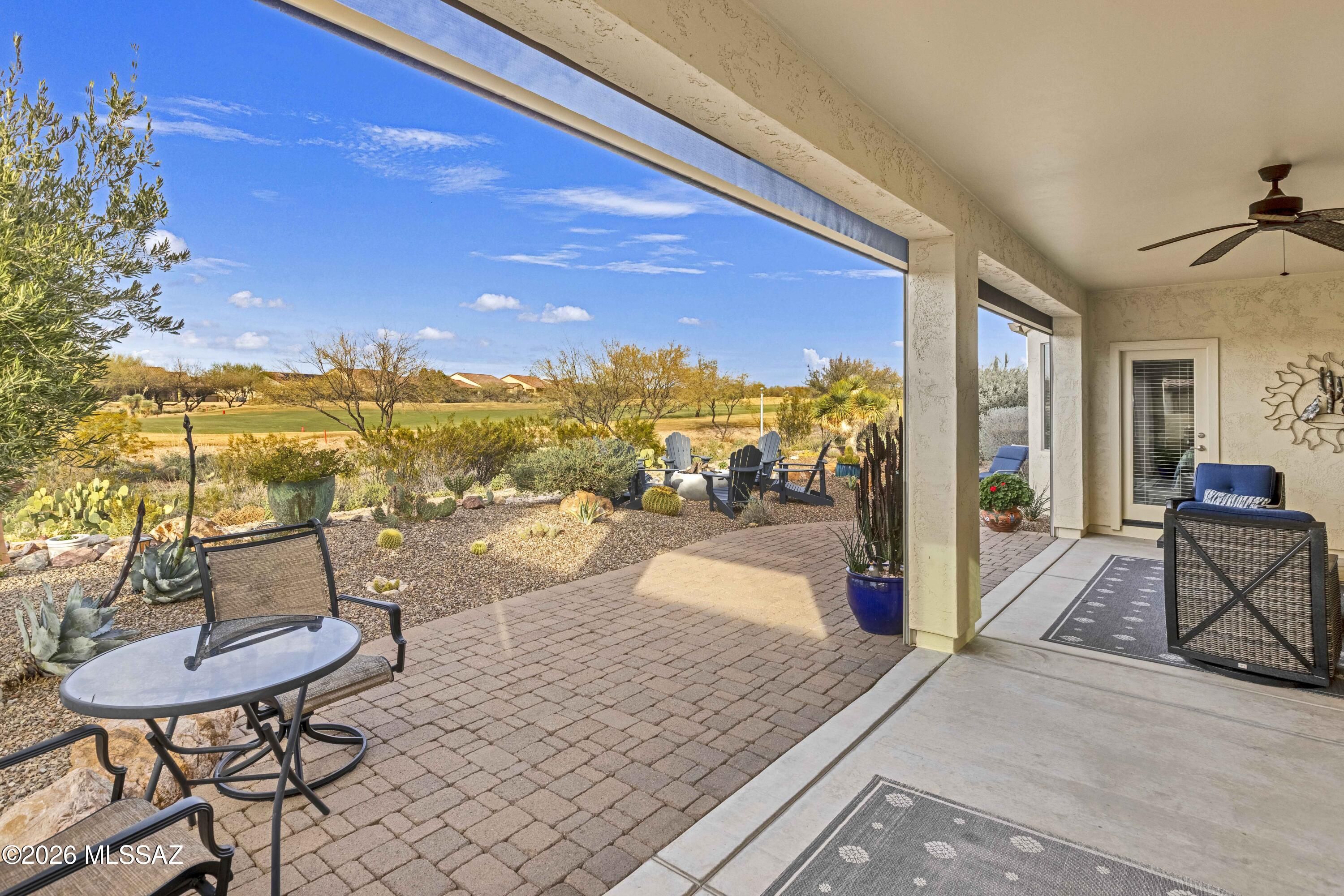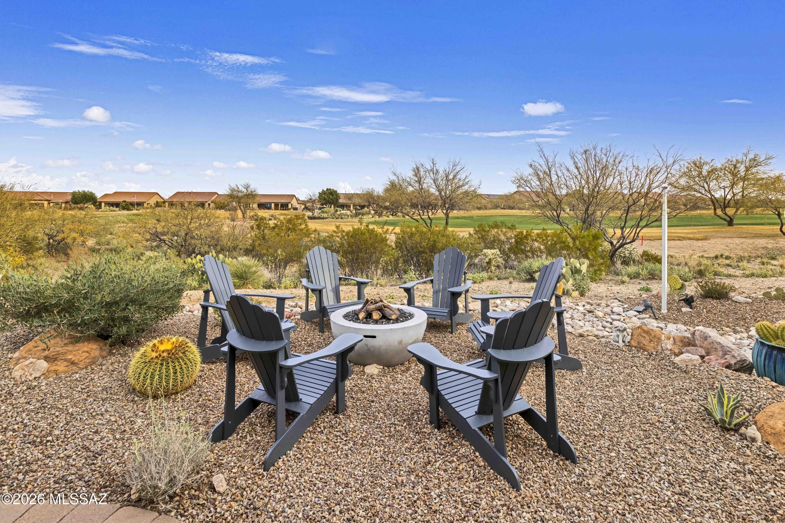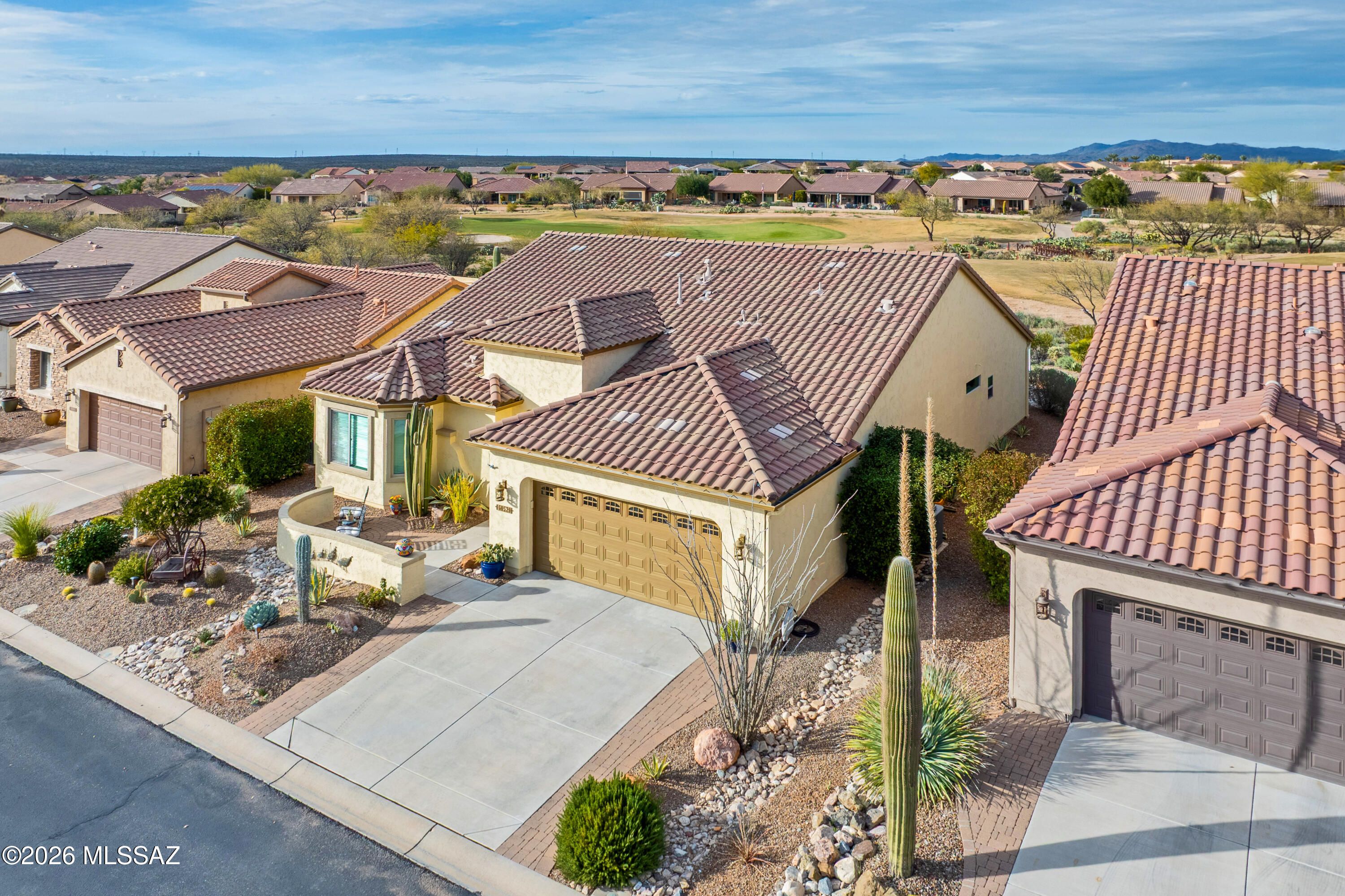 A beautiful Artesa Model that backs up to the 11th Fairway of the SaddleBrooke Ranch Golf Course. The home consists of a Extended Master Bedroom with Walk-In Closet, door to covered patio, dual vanities, and a large Walk-In Shower; Extended 2nd Bedroom, Great Room w/Media Alcove; Dining Area with Glass Slider to access the back yard; 2-full Bathrooms; Den or Office; Extended 2-car Garage with Golf Cart Space; Laundry Room with Sink and Storage; and Owner's Valet. The kitchen features granite counters and new LG appliances, including the refrigerator, range, and dishwasher. The front yard is fully landscaped w/mature plantings with lights and drip irrigation, a front courtyard and a custom-made security screen door. The backyard has a large Covered Patio with Tucson Rolling Shades,