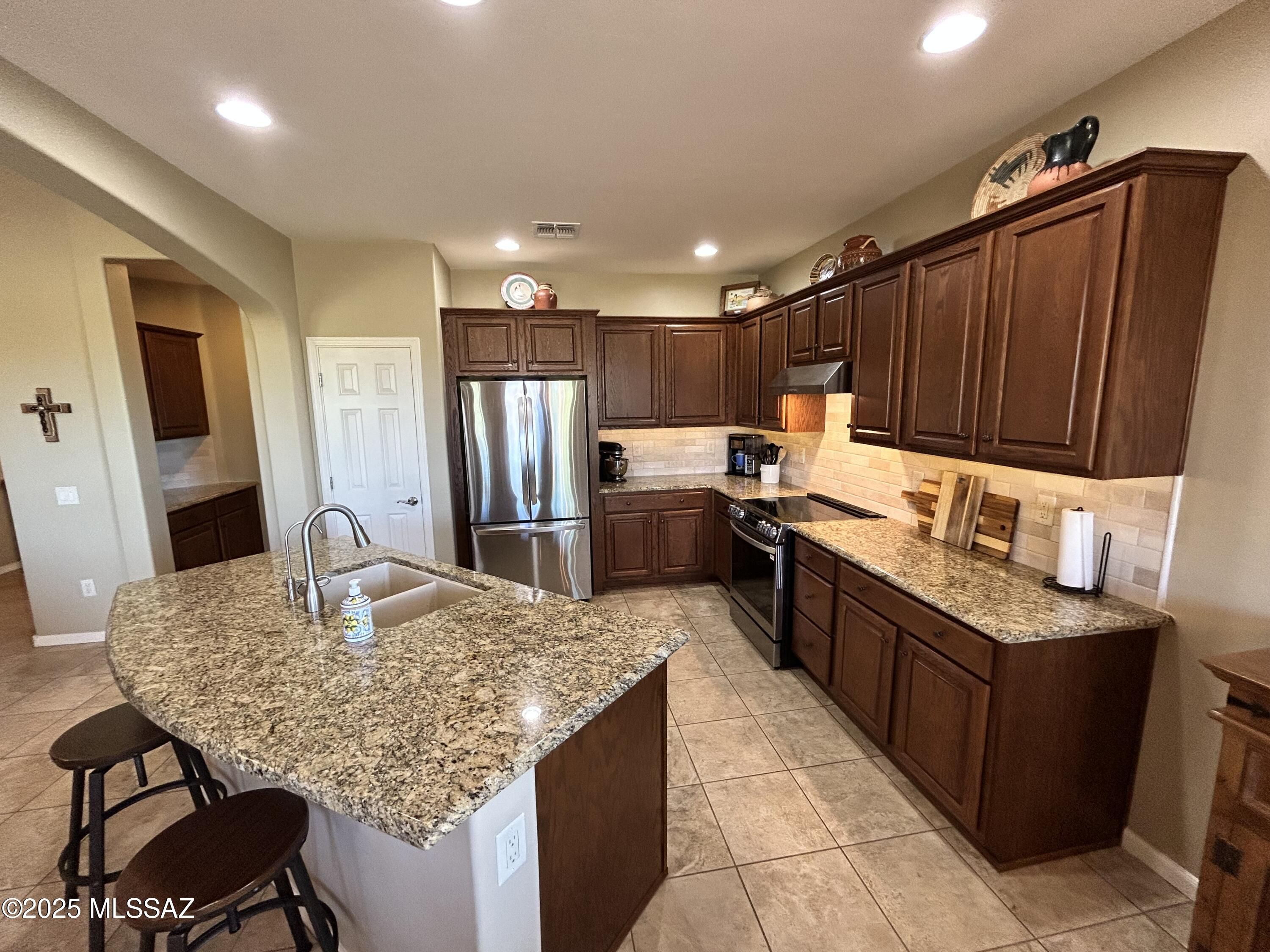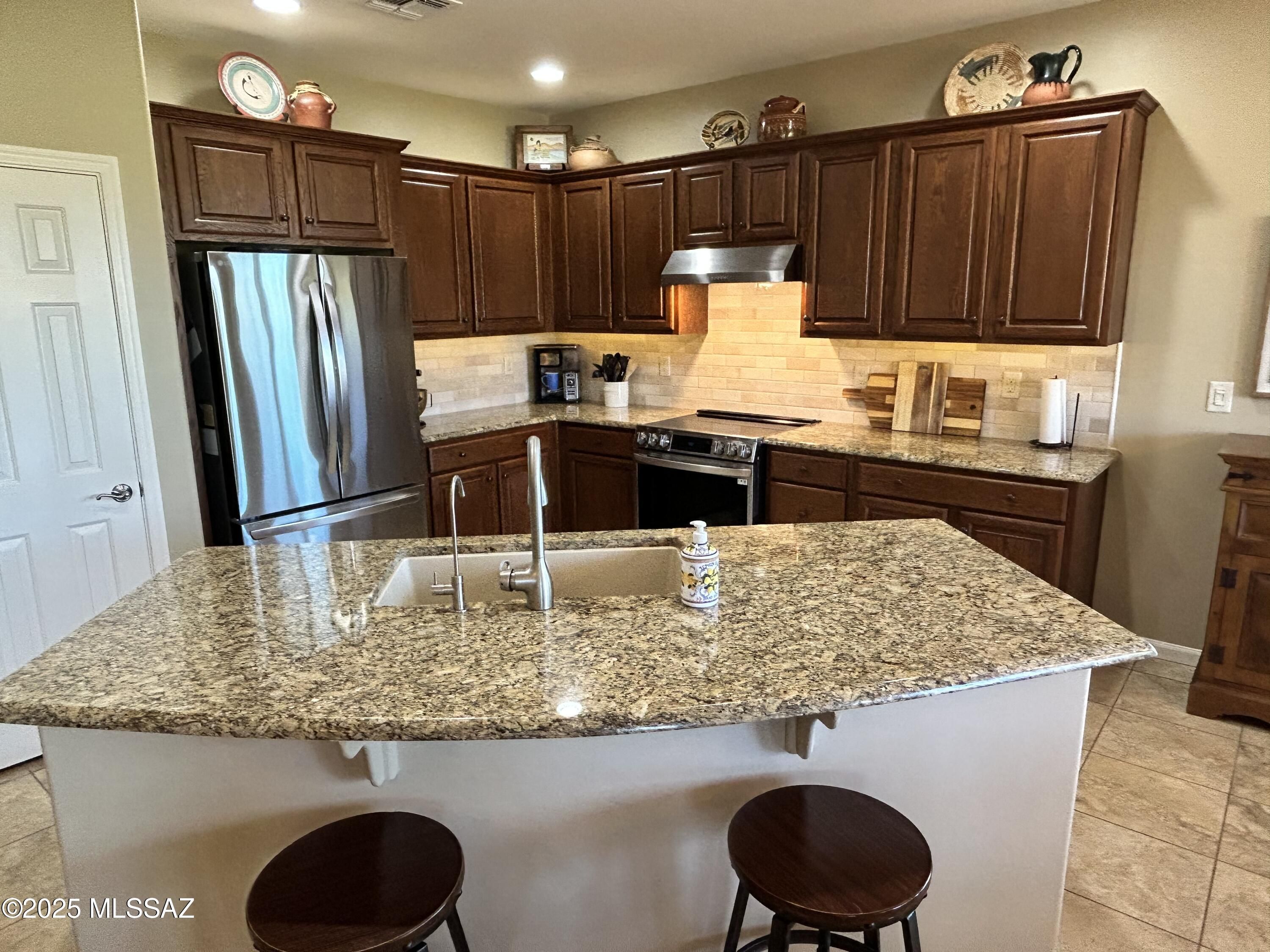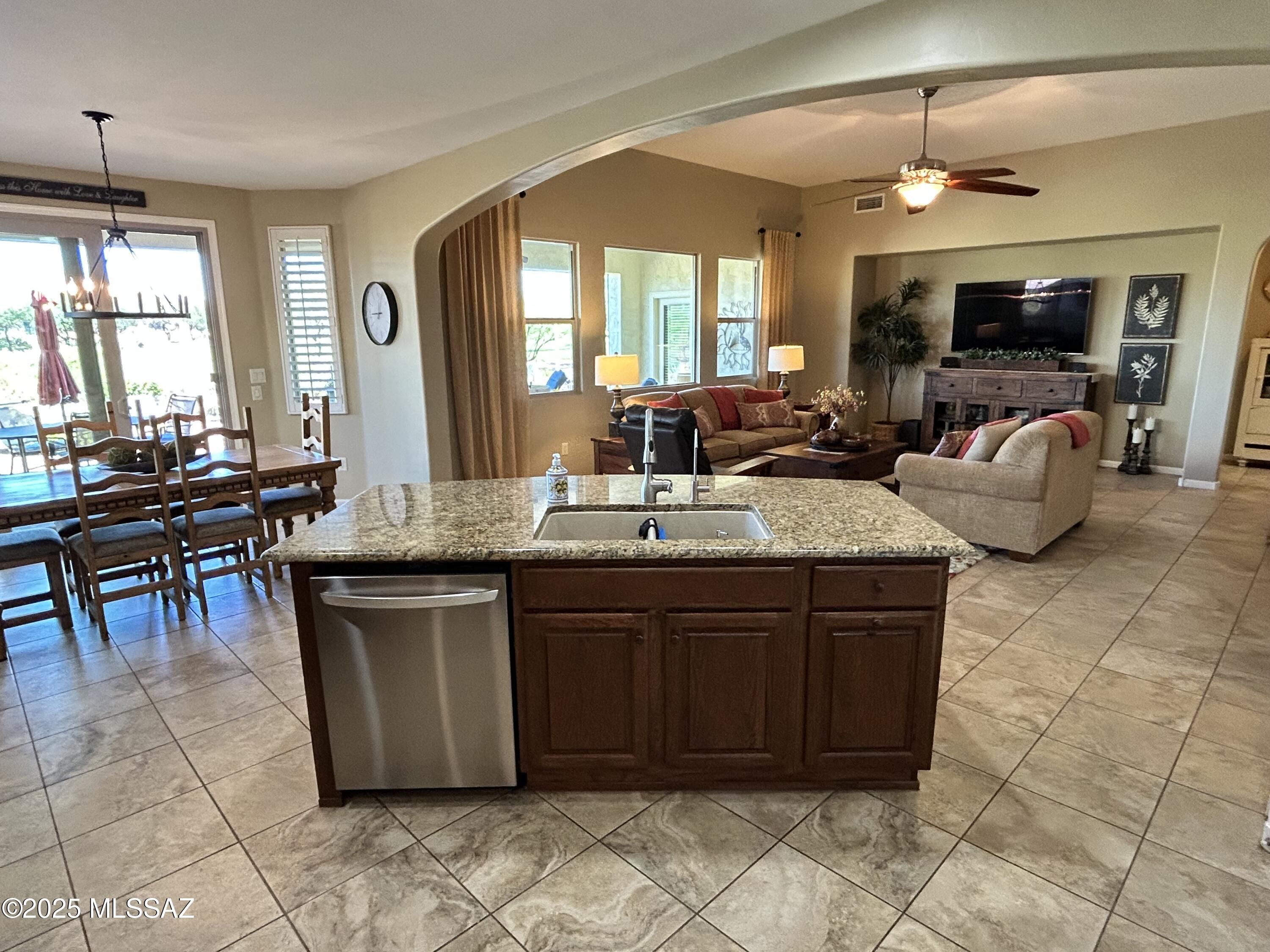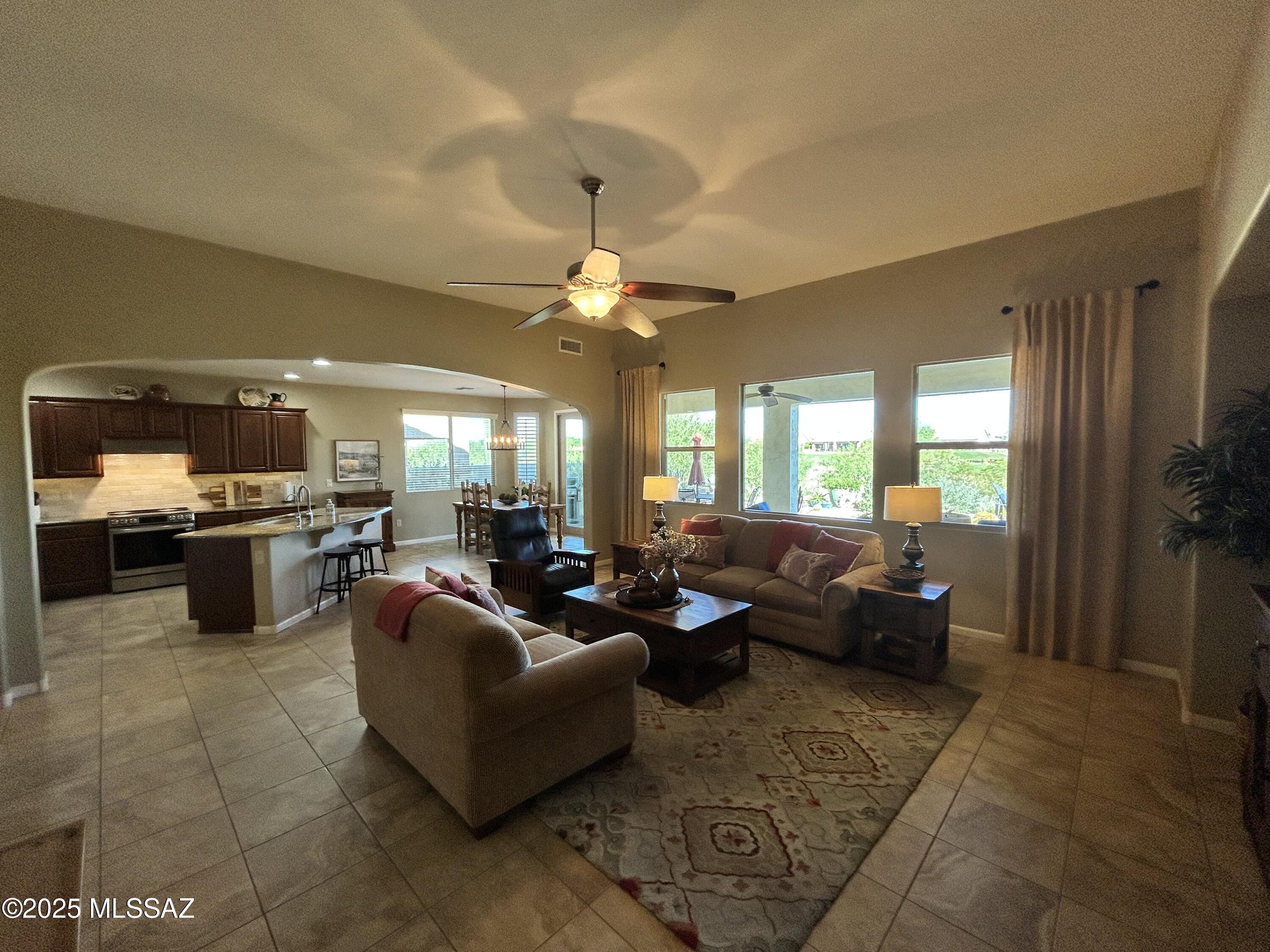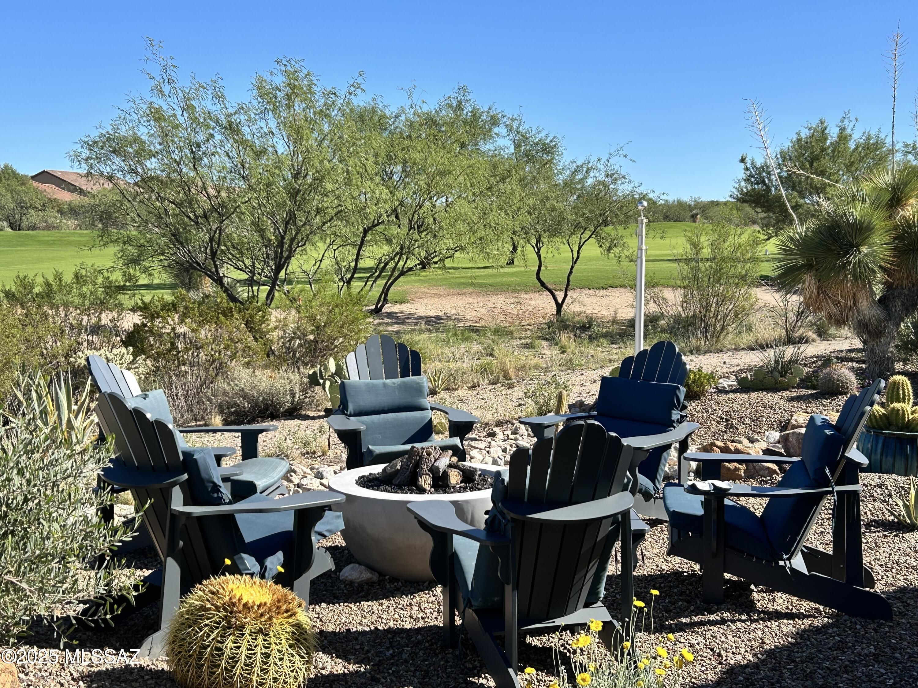 Beautiful home on a premium golf course lot in Saddlebrooke Ranch. Enjoy this home with a gourmet kitchen, expansive breakfast bar, opening to the dining area and great room. Great for entertaining! The kitchen features granite counters and new LG appliances, including the refrigerator, range, and dishwasher. From the great room enter the large covered patio with expansive views of the golf course fairway. Patio includes retractable shades for privacy and energy efficiency. Sit around the firepit and enjoy nature at it's finest. The master suite features dual vanities, a large walk in shower and a spacious walk in closet. This is a popular split floorplan with a guest bedroom and den. There's plenty of room for everything in the extended garage. Hurry! this home will not last!