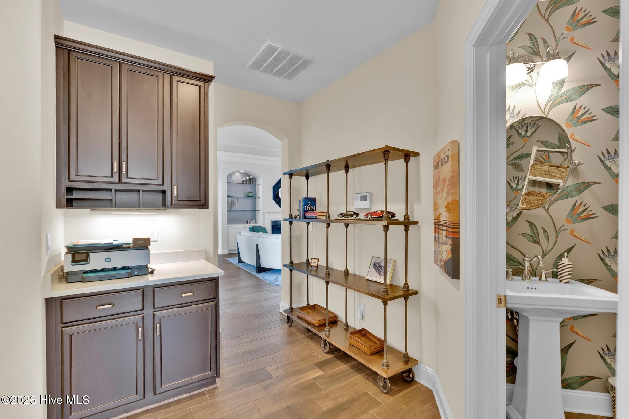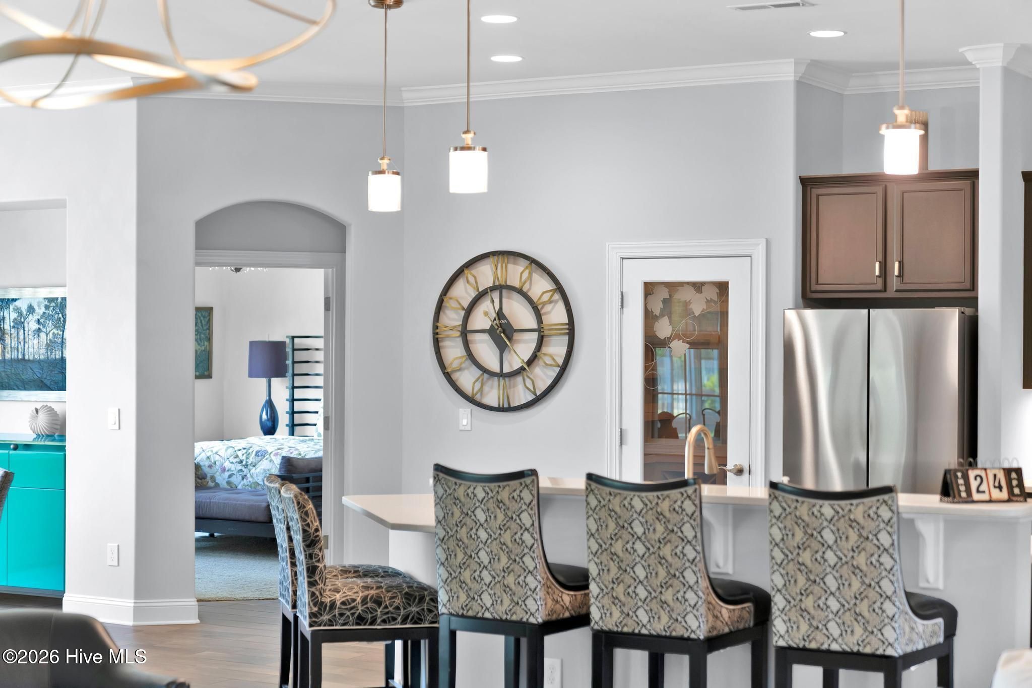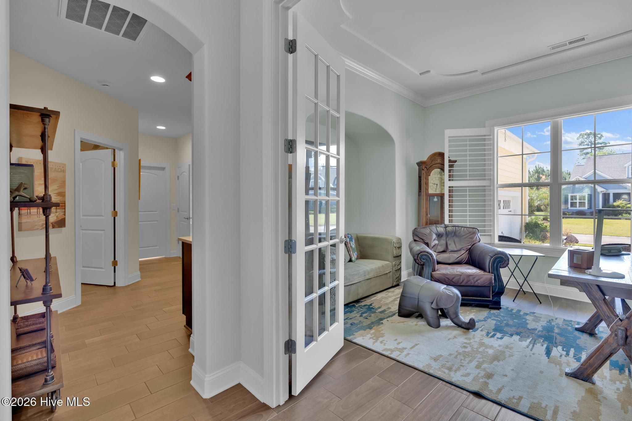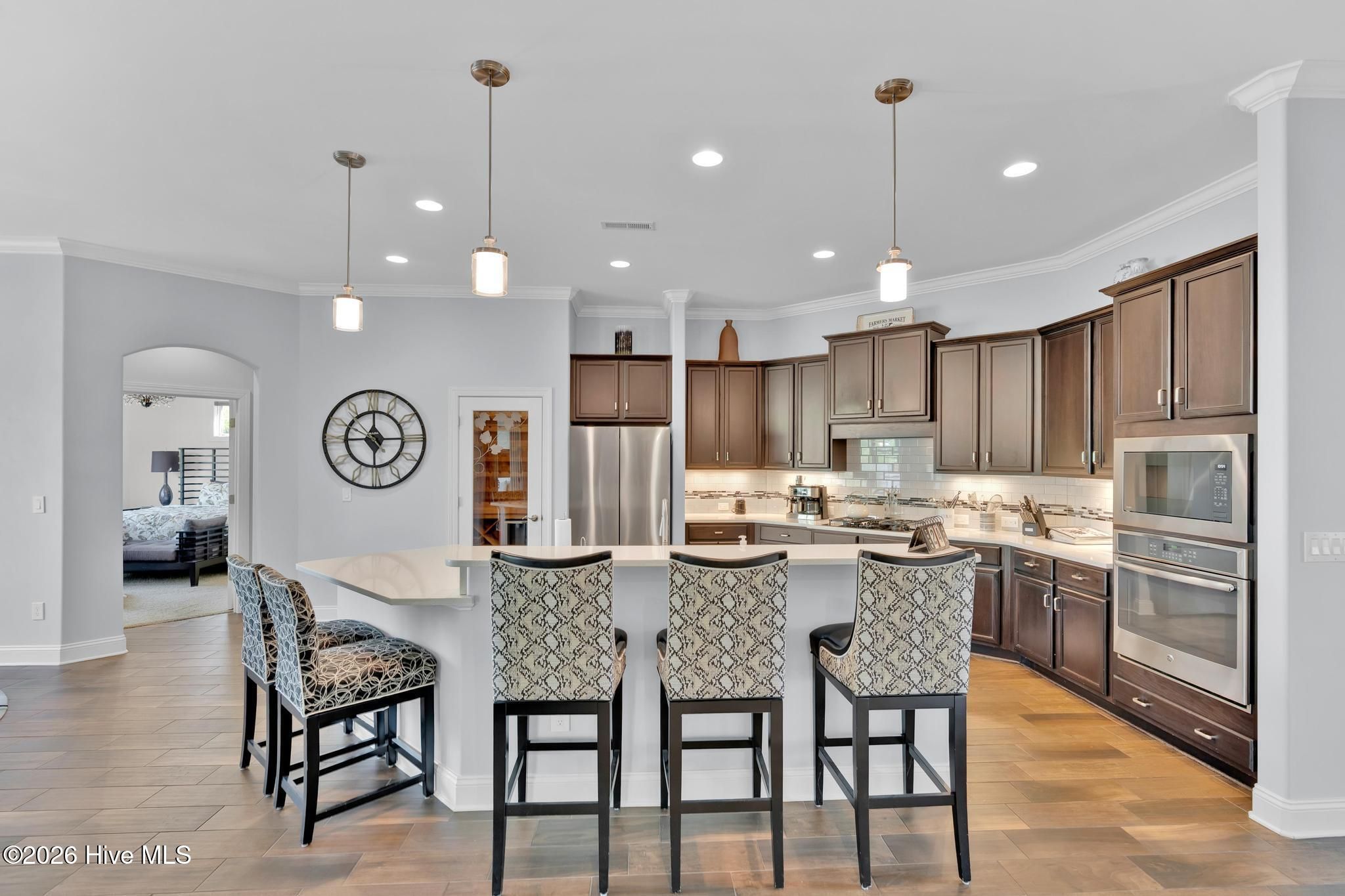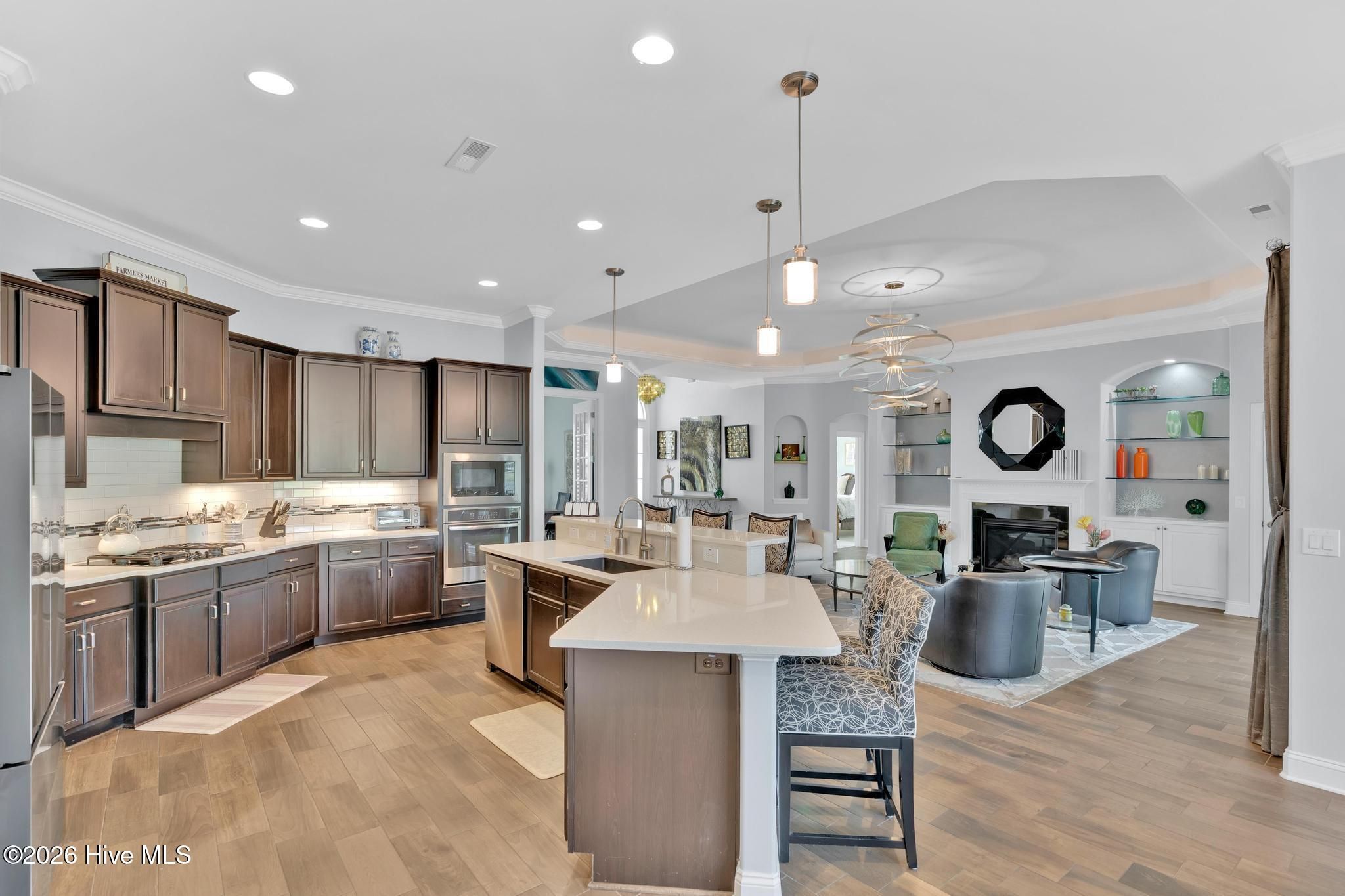 Welcome to 6053 Shore Park Drive, a truly distinctive luxury home in Brunswick Forest in Shelmore, offering over 3,211 square feet of thoughtfully designed living space with serene pond views. Built in 2014, this residence stands apart with elevated finishes, custom details, and a level of character that makes it anything but ordinary. From the moment you step inside, the home reveals its unique style--highlighted by striking, one-of-a-kind lighting fixtures that add warmth, depth, and a designer touch throughout. The open-concept layout is filled with natural light and flows effortlessly, creating an inviting space for both everyday living and entertaining. The kitchen is a true focal point, featuring a dedicated wine closet complete with a mini refrigerator--perfect for showcasing and storing your collection--while a separate butler's pantry offers additional prep space and storage, ideal for hosting with ease. The home features 3 spacious bedrooms, 3.5 bathrooms, and a designated office, along with a versatile bonus room that can easily serve as a fourth bedroom, media room, or private guest retreat. A walk-in attic provides exceptional storage, giving you space to stay organized without compromise. Step outside to the expansive lanai overlooking the pond, where peaceful water views create the perfect backdrop for morning coffee or evening gatherings. With its distinctive character, luxury features, and thoughtful design, this home offers a rare opportunity--and it's priced to sell.