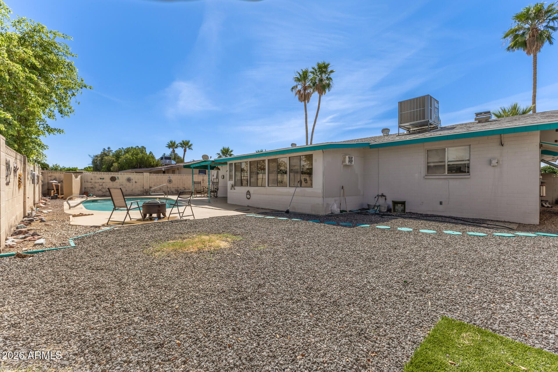 Brand new HVAC (2025)! This charming 3-bedroom, 2-bath residence features an inviting living room with a soothing palette, blinds, and durable tile and new LVP flooring (2025) in 2 bedrooms for easy maintenance. The well-appointed kitchen comes with flat-panel cabinetry, essential built-in appliances, and a peninsula with a breakfast bar for casual dining. Enjoy peaceful afternoons in the bright sunroom, perfect for enjoying the warm Arizona weather year-round. The main bedroom includes double built-in closets and a private bathroom with new walk-in shower (2025) for added comfort. Imagine enchanting evenings in the lovely backyard, complete with a covered patio and a refreshing pool for cooling down on hot summer days. New blown insulation (2025). Don't miss out on this opportunity!