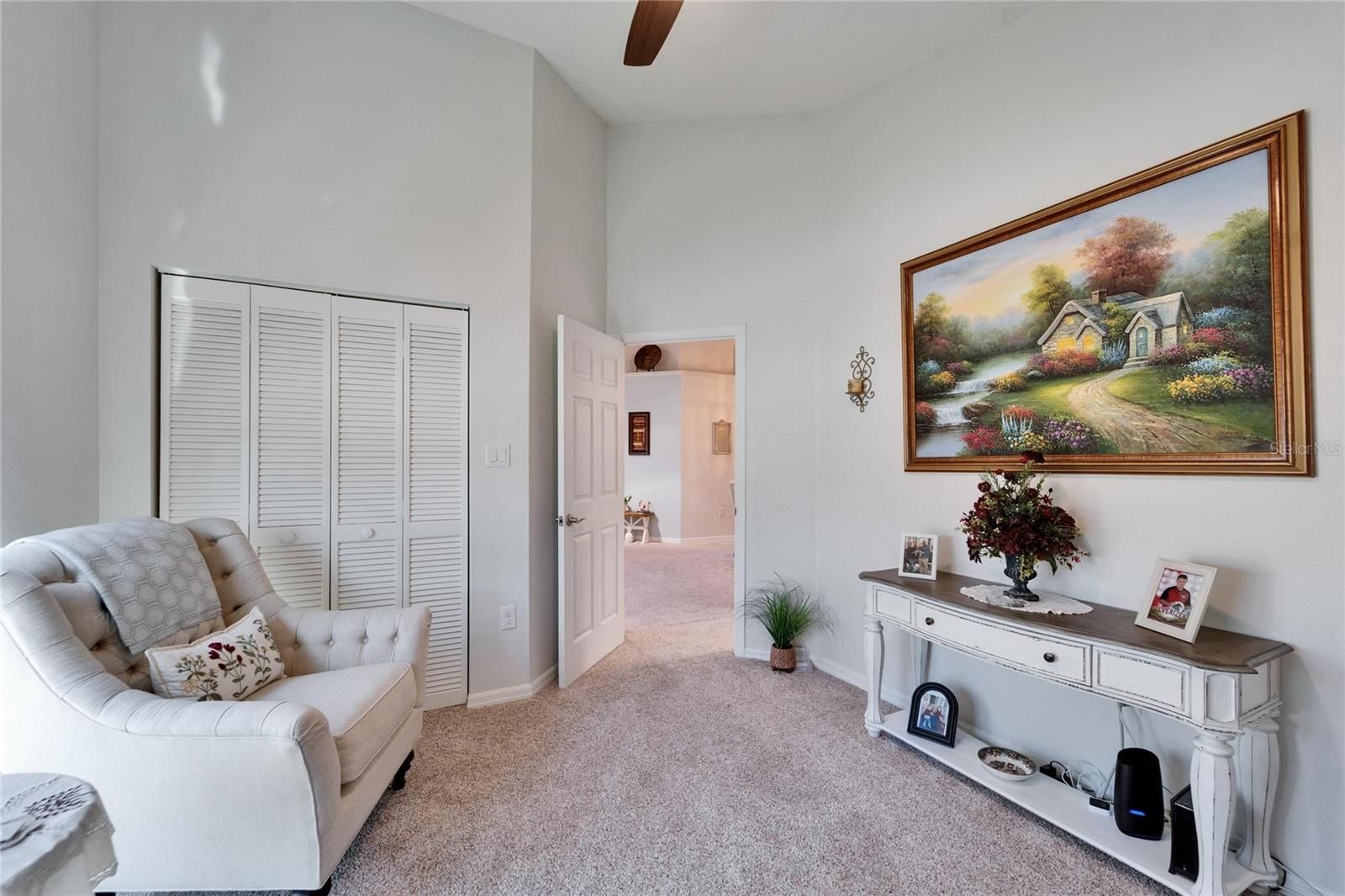 - Attic Ventilator, Built-in Features, Ceiling Fan(s), Central Vacuum, Eat-in Kitchen, High Ceilings, Living/Dining Room, Open Floorplan, In-Wall Pest Control, Main Level Primary, Smart Home, Solid Surface Counters, Solid-Wood Cabinets, Split Bedrooms, Thermostat, Vaulted Ceiling(s), Walk-In Closet(s), Window Treatments