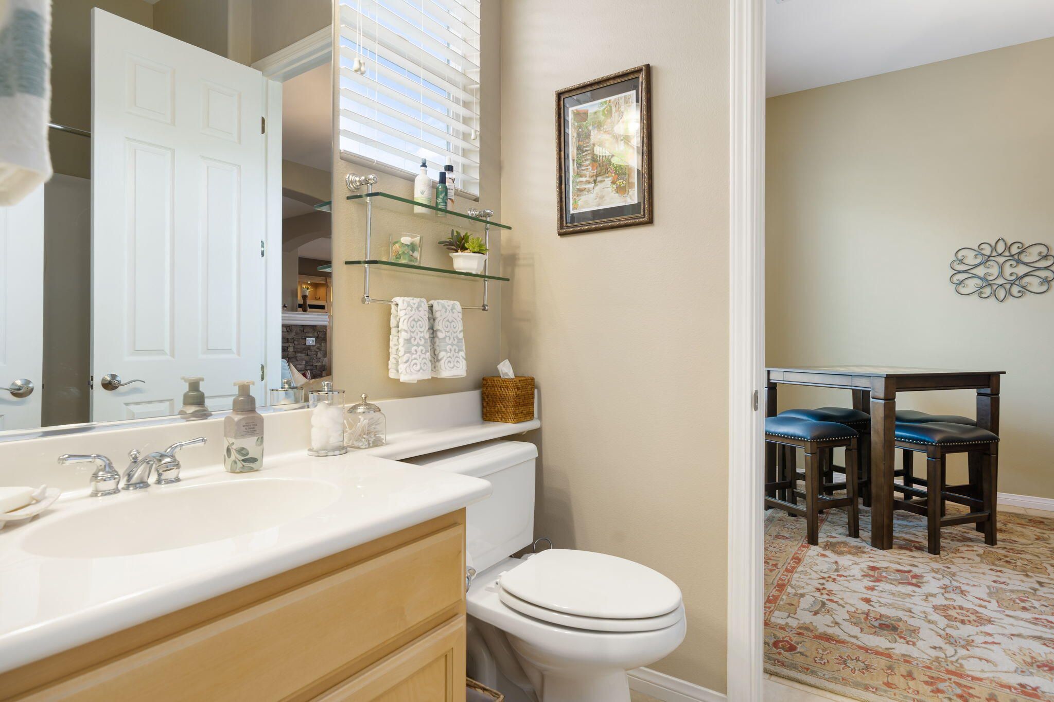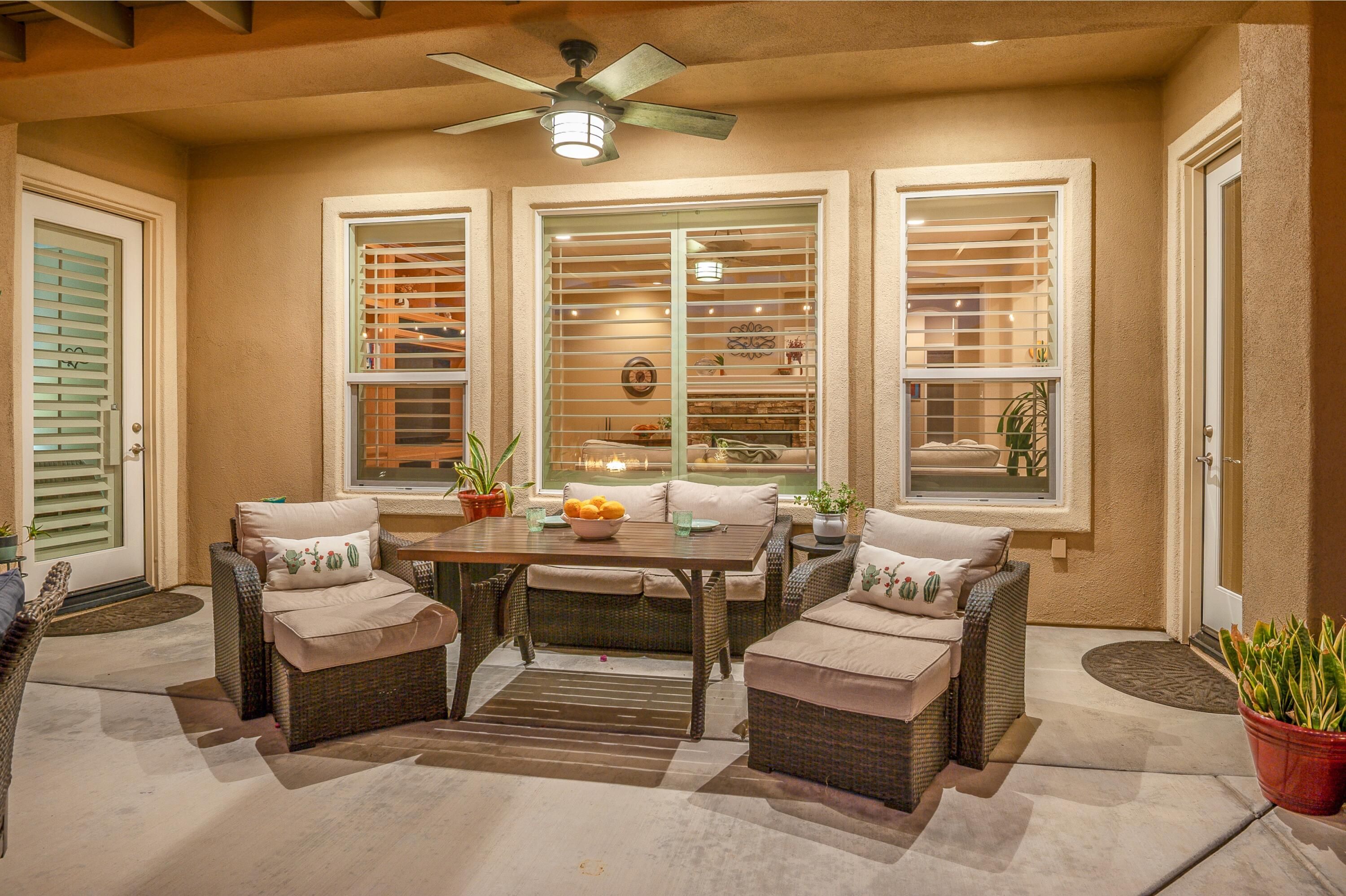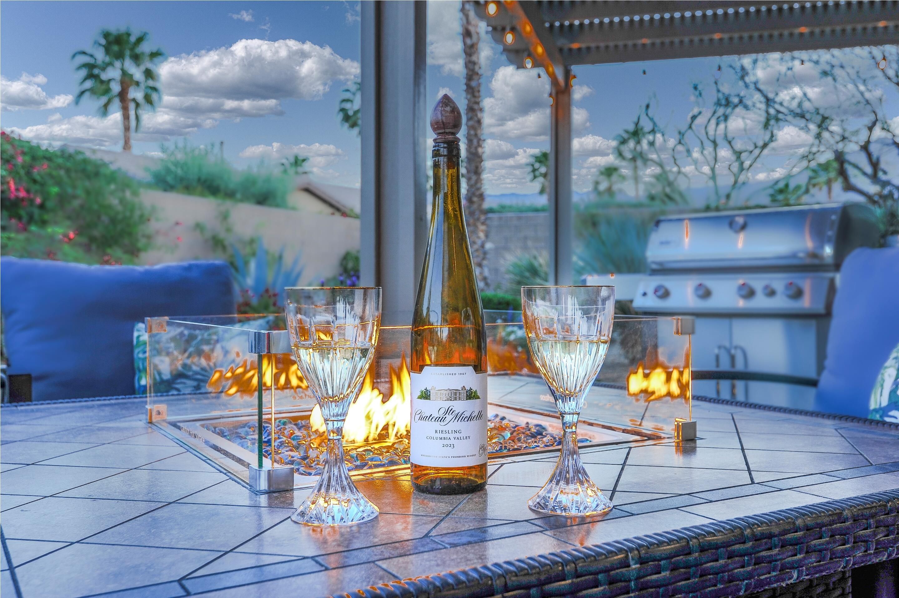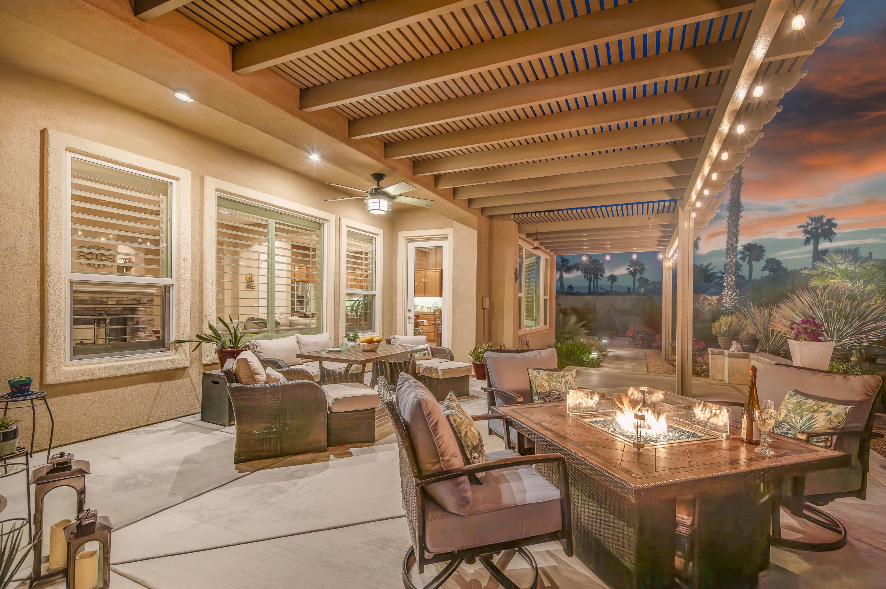 Live Life Brilliantly! Luxurious touches amplify the joy of desert living in this meticulous Trilogy at La Quinta resort property. A popular Oreas model, the home is open and bright with ten-foot ceilings and a smart and flexible 2,331 SQ FT floor plan that accommodates your changing lifestyle needs. The home is currently used as a three-bedroom, 3-baths with a great room with fireplace, a grand gourmet kitchen, and a separate large recreation room with direct access to a full bath. Resting on a grand 10,454 SQ FT lot with partial mountain views, there's plenty of space for a pool, spa, putting green and more. Set back off the end of a cul-de-sac, a gated front patio with big SW mountain views and tall wooden door mark the entry to the main home. A main entry, tile floors, and a striking double-sided stone fireplace hints at the quality and invigorating lifestyle that lay beyond. The great room is spacious with big picture windows and white plantation shutters. Stunning custom lit built-ins make way for a big screen TV and in-ceiling surround that elevates your in-home media experience. Cool winter nights and Holidays are warmed by the fire as new memories are made with family and friends. A true gourmet sized kitchen, it features a new premium stainless GE Profile cooktop, microwave, and dishwasher. Volumes of warm wood cabinets extend into the informal dining area and the pantry will keep all your kitchen ware neatly tucked away. A prep island and a separate entertainment island with seating are crowned in creamy textured granite. An outstanding bedroom retreat features a sumptuous walk-in shower with multiple rainshower and hand-held shower heads. Dual vanity custom wood cabinets, cool white quartz countertops and luminous LED lit mirrors, spacious closets, and a hidden bonus room with mounted TV, rounds out this perfect retreat. Step out each sun drenched morning onto the covered patio with a cup of Joe to plan a day of fun. As the evening wanes, relax on the courtyard and watch the sun as it slips behind the Santa Rosa Mountains. The garage has a new epoxy floor, tall storage cabinets, and space for all your toys. This home is meant to be treasured and enjoyed!