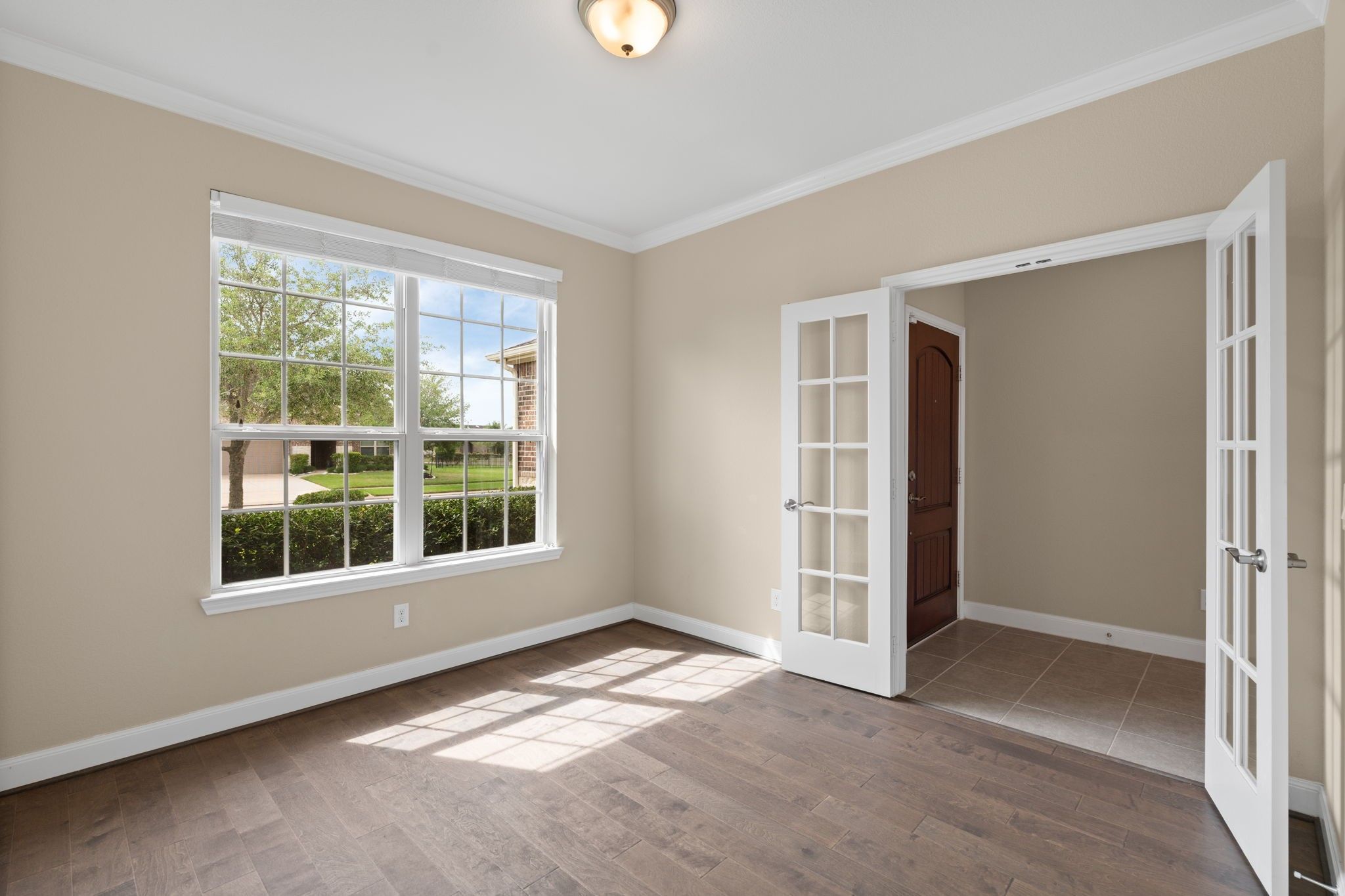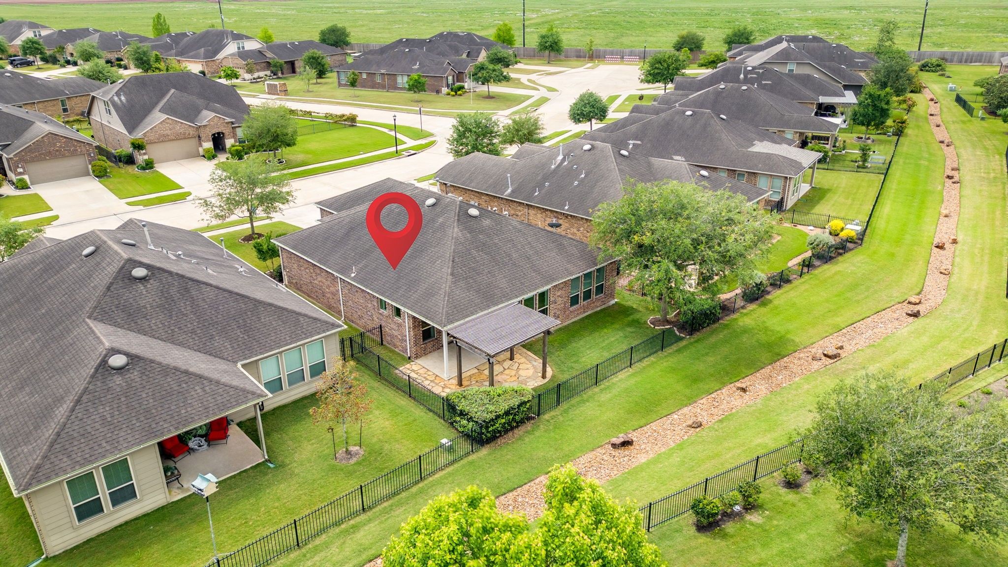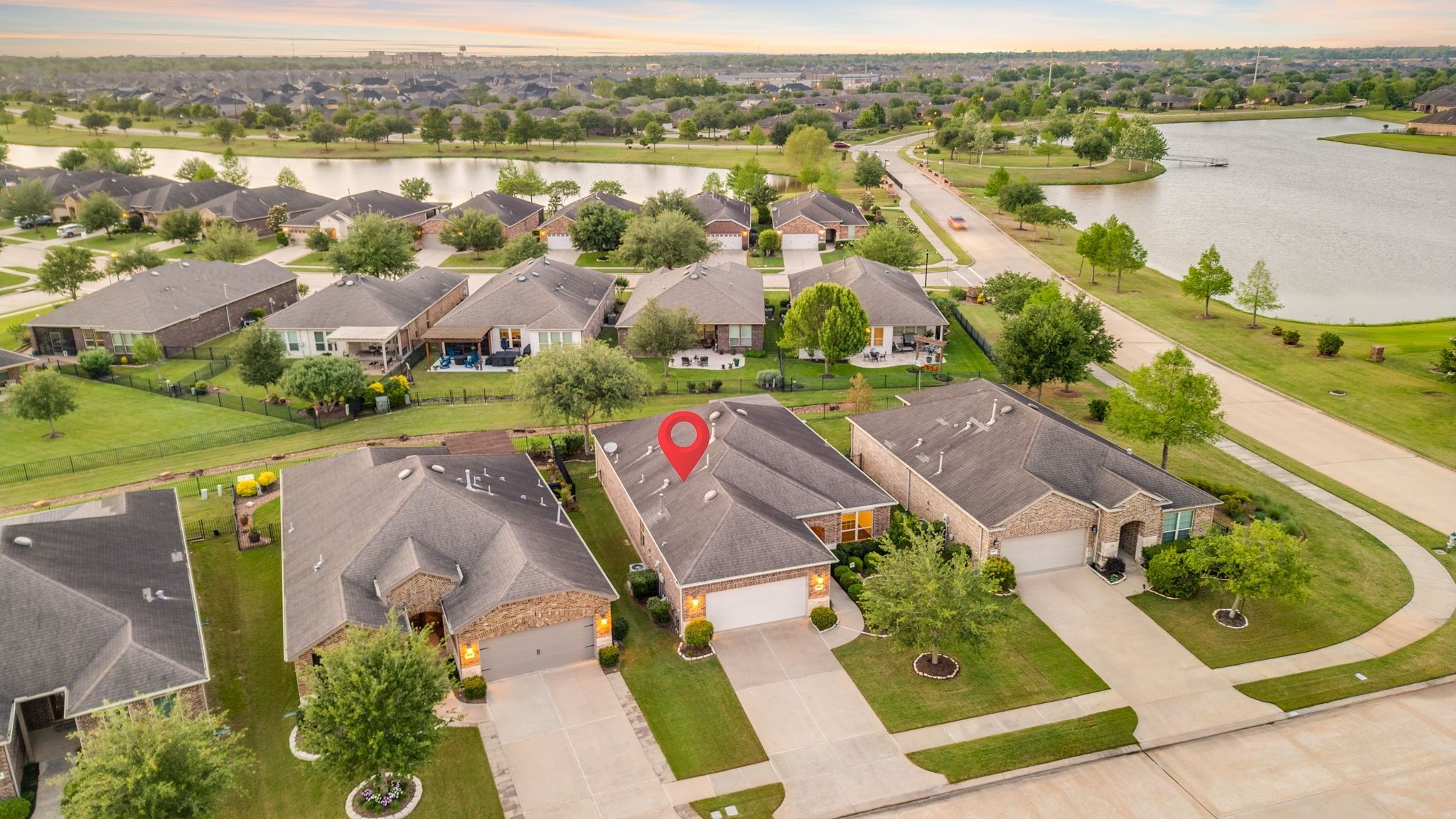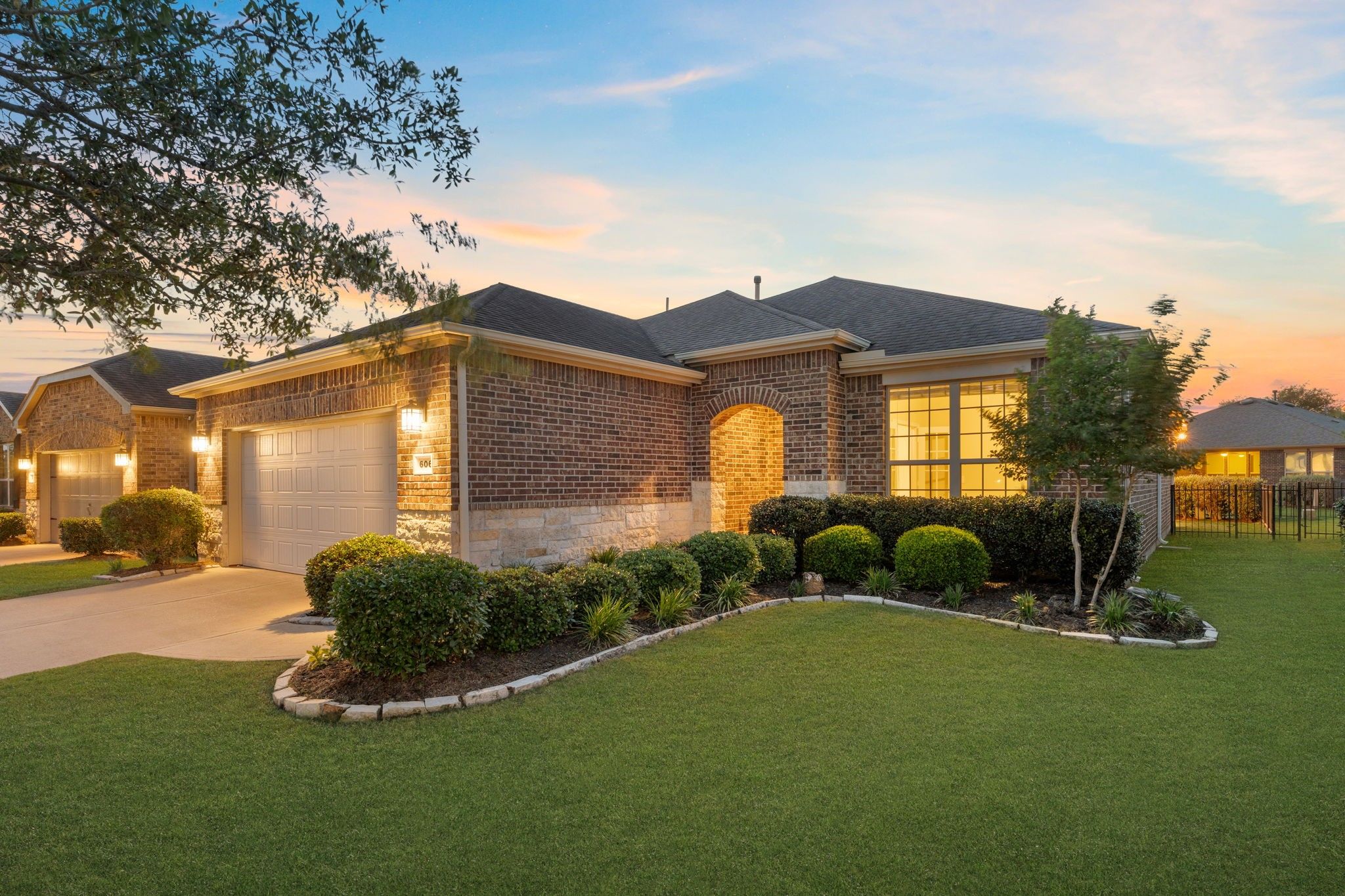 Former Model w/Upgraded elevation Texas Pecan brick & Austin Chop stone 2BR/2BA + Study. Castle Rock patio-ready for Texas sunsets w/pergola lighting, extended pavers & serene water view w/rock-lined swale creating peaceful backdrop; foyer opens to study w/French doors & sun-filled windows; Great Room w/tray ceiling & crown flows to island kitchen featuring gleaming granite, SS built-ins, gas cooktop, under cab lighting & warm tumbled stone backsplash; transom windows allow sideboard space while keeping light bright; owner’s suite w/tray ceiling; bath offers walk-in shower w/rain head, dual vanities + lowered Silestone vanity; split plan provides guest privacy; new plush carpet in bedrooms adds comfort; MUD bench at garage entry w/storage, framed mirrors, 5 1/4" baseboards; deep closet w/under-stair storage + cubby & UNIQUE 364 sq. ft. unfinished attic w/stairs—rare bonus storage off hallway; 4-sides brick; fenced yard, unwind under glowing pergola as evening skies reflect on water.