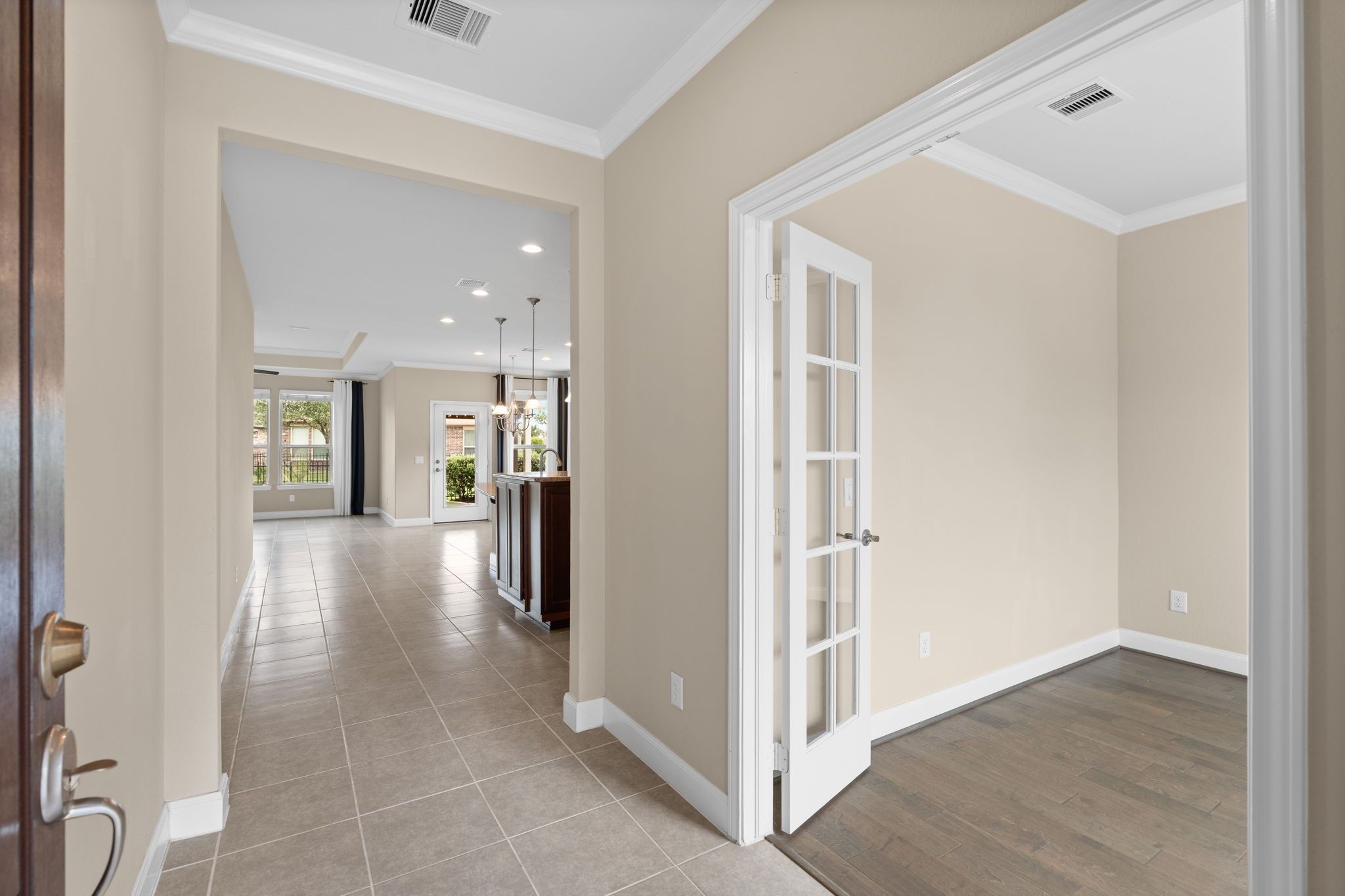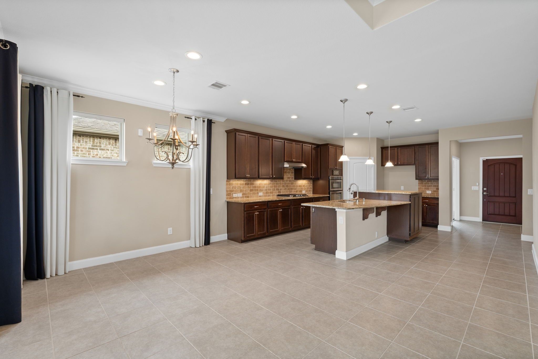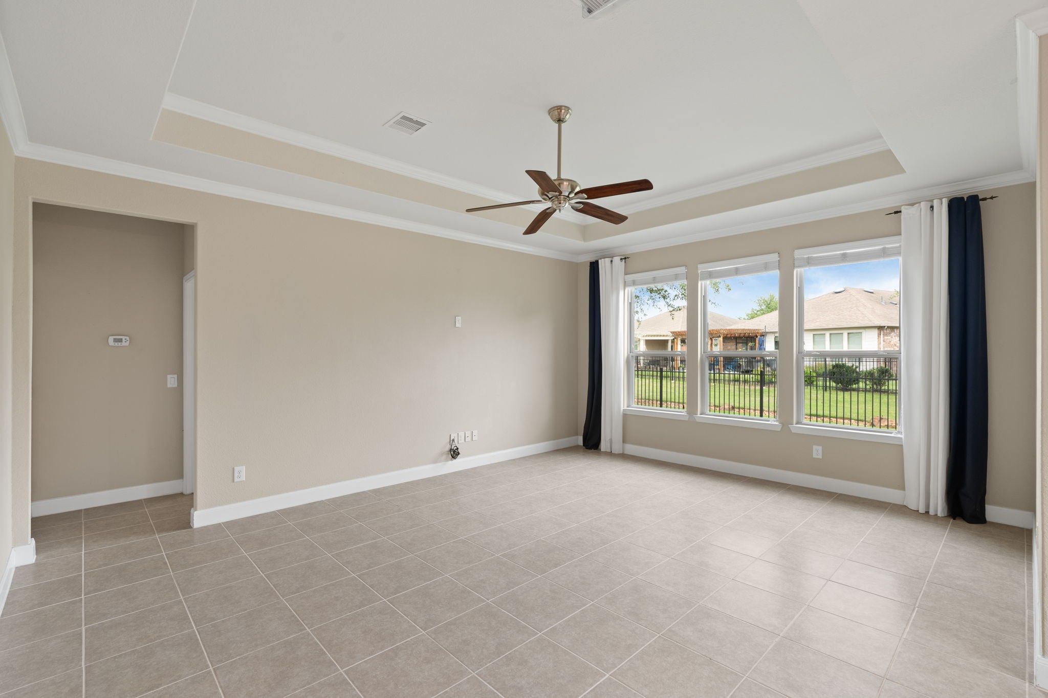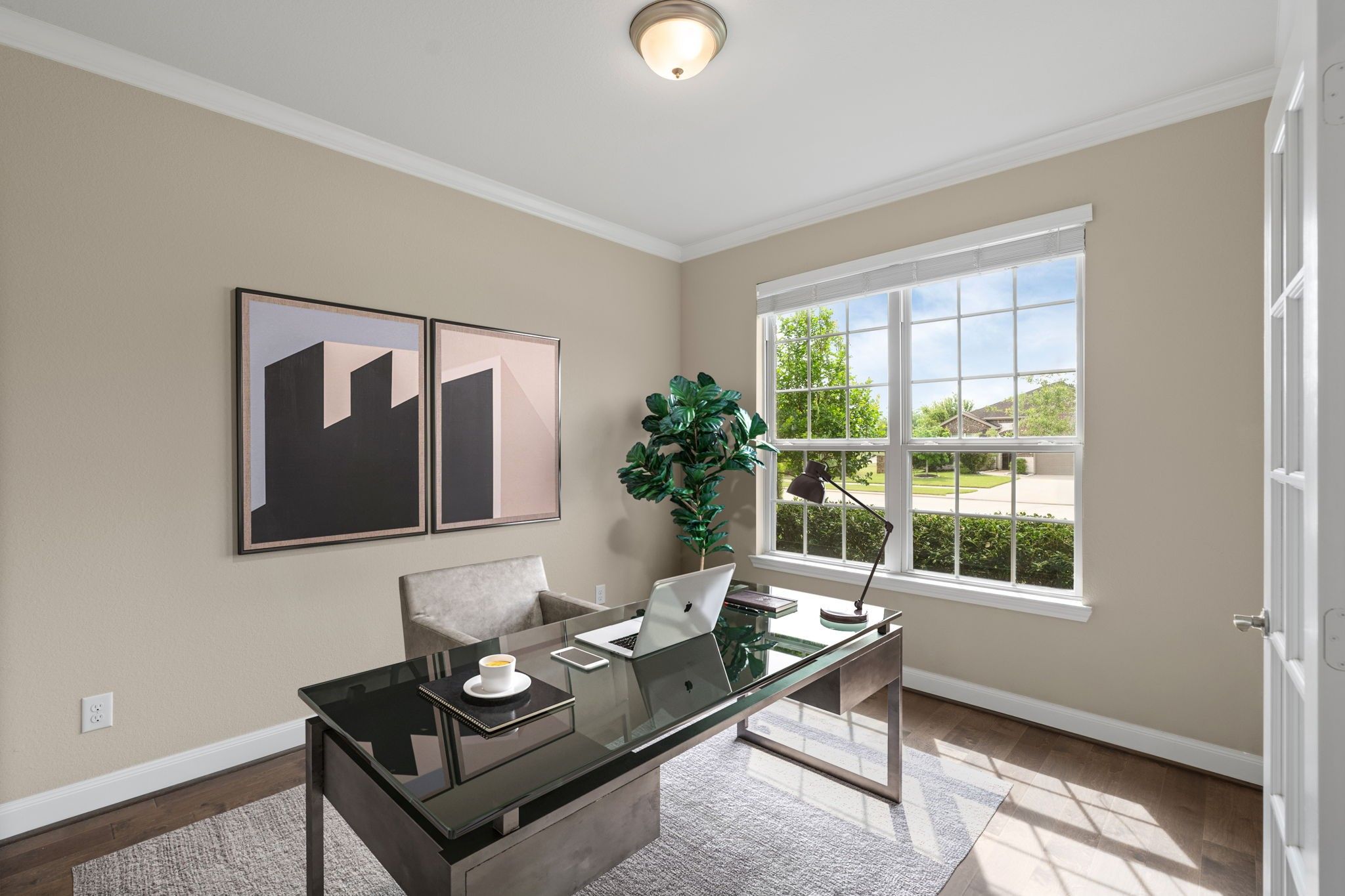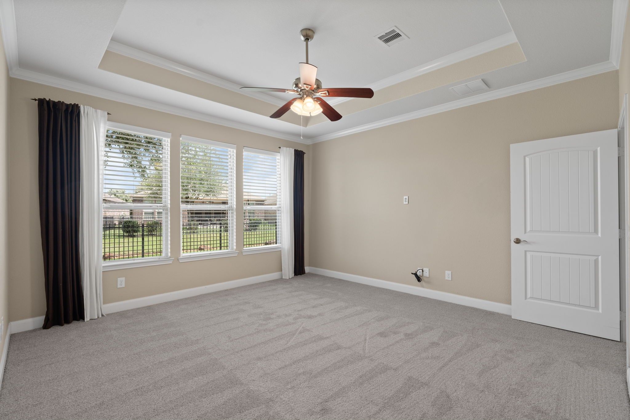 Former Model w/Upgraded elevation Texas Pecan brick & Austin Chop stone 2BR/2BA + Study. Castle Rock patio-ready for Texas sunsets w/pergola lighting, extended pavers & serene water view w/rock-lined swale creating peaceful backdrop; foyer opens to study w/French doors & sun-filled windows; Great Room w/tray ceiling & crown flows to island kitchen featuring gleaming granite, SS built-ins, gas cooktop, under cab lighting & warm tumbled stone backsplash; transom windows allow sideboard space while keeping light bright; owner’s suite w/tray ceiling; bath offers walk-in shower w/rain head, dual vanities + lowered Silestone vanity; split plan provides guest privacy; new plush carpet in bedrooms adds comfort; MUD bench at garage entry w/storage, framed mirrors, 5 1/4" baseboards; deep closet w/under-stair storage + cubby & UNIQUE 364 sq. ft. unfinished attic w/stairs—rare bonus storage off hallway; 4-sides brick; fenced yard, unwind under glowing pergola as evening skies reflect on water.