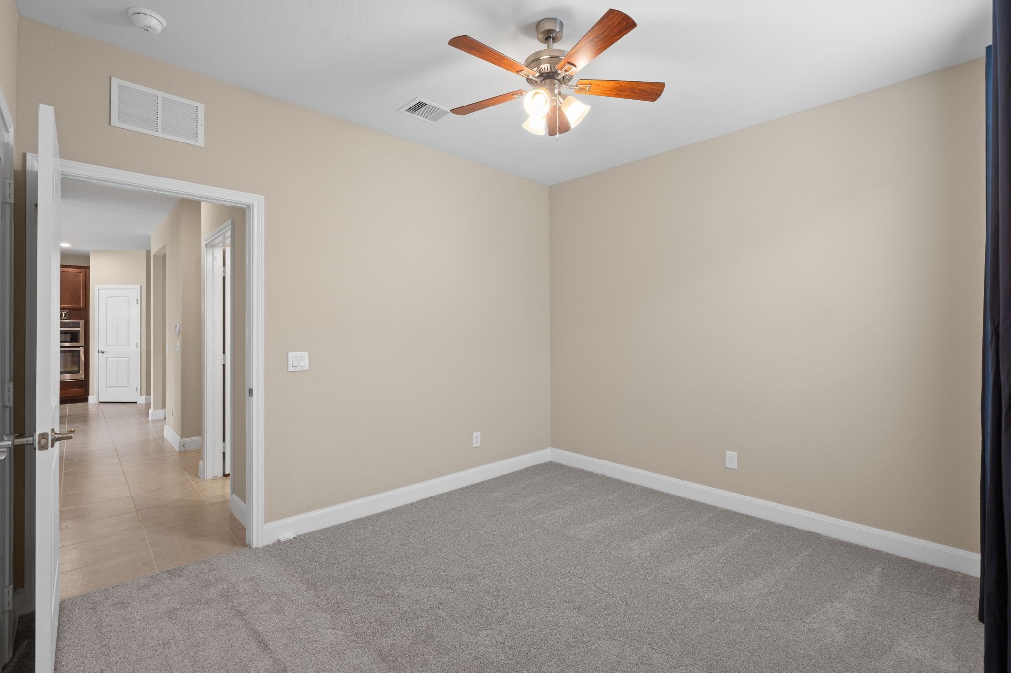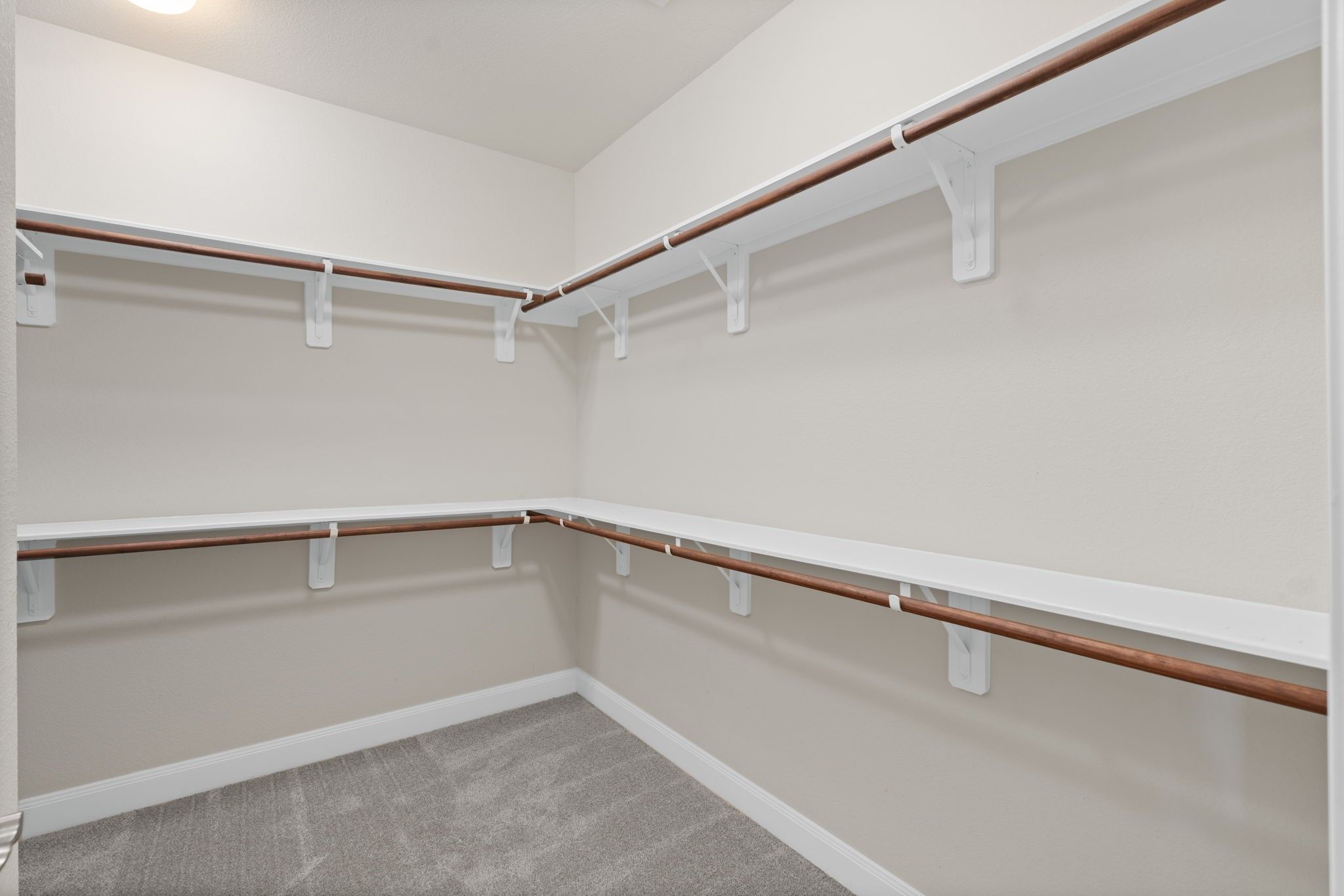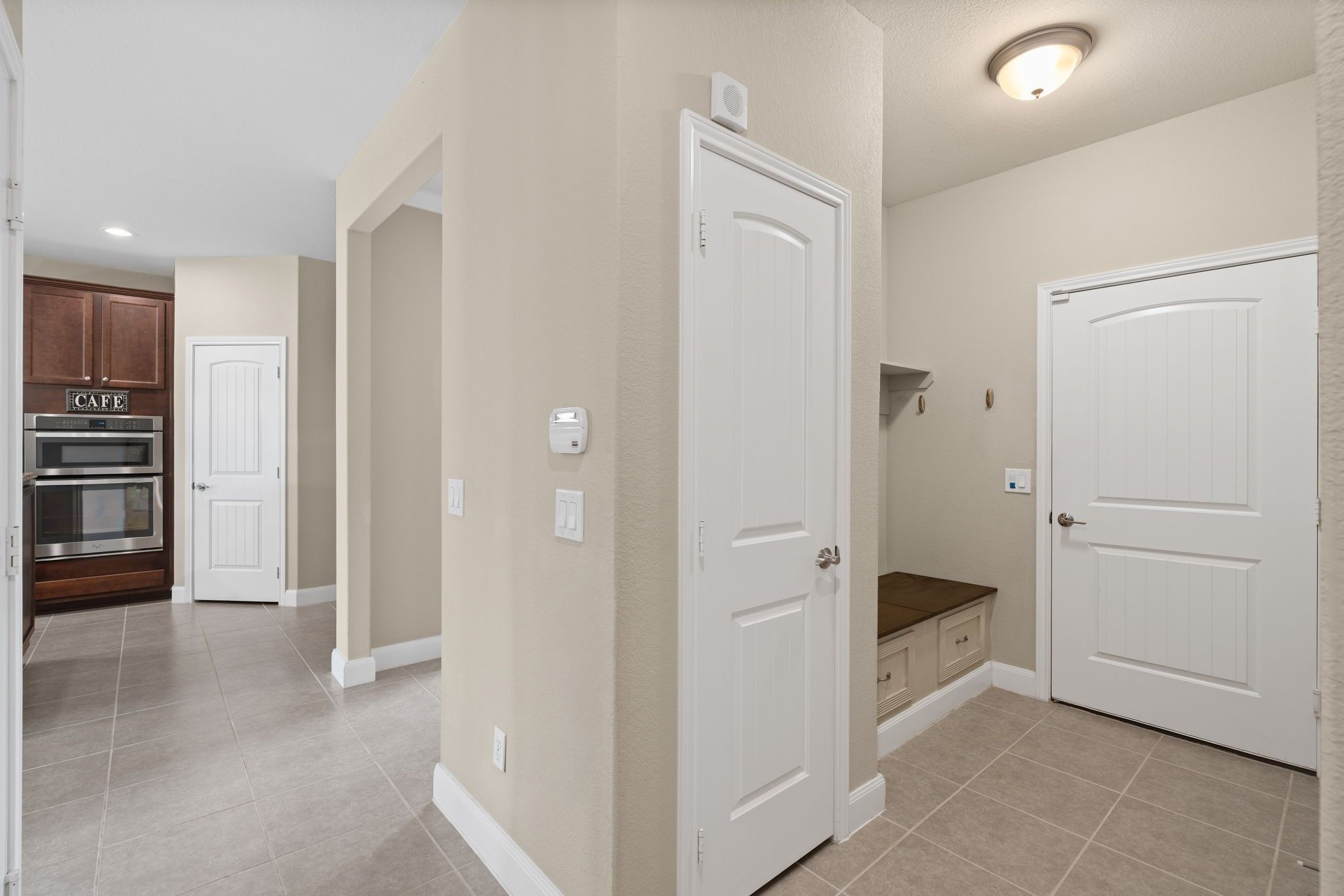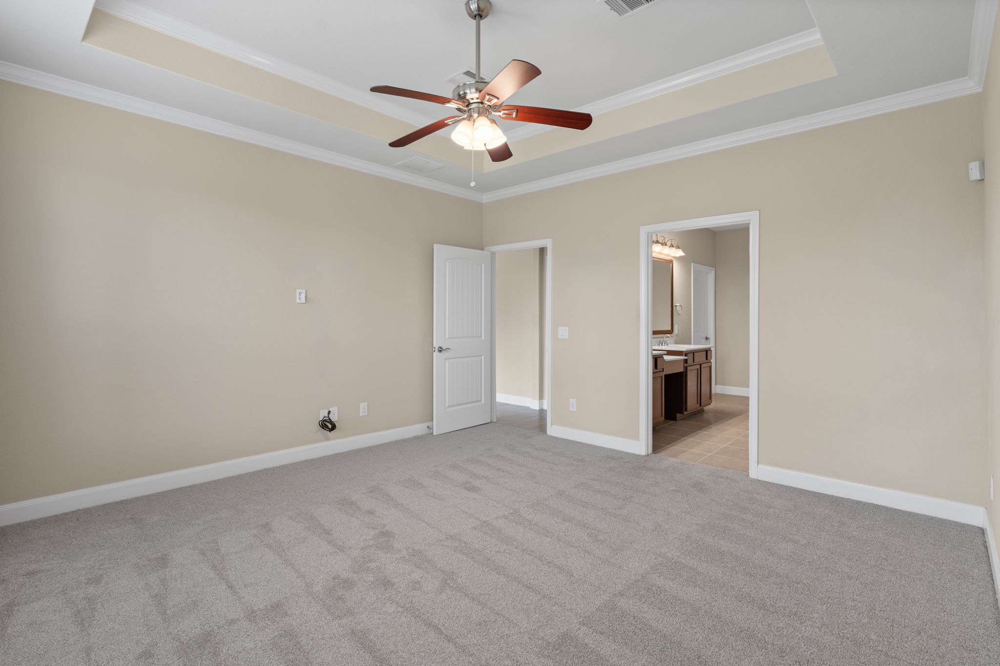 Former Model w/Upgraded elevation Texas Pecan brick & Austin Chop stone 2BR/2BA + Study. Castle Rock patio-ready for Texas sunsets w/pergola lighting, extended pavers & serene water view w/rock-lined swale creating peaceful backdrop; foyer opens to study w/French doors & sun-filled windows; Great Room w/tray ceiling & crown flows to island kitchen featuring gleaming granite, SS built-ins, gas cooktop, under cab lighting & warm tumbled stone backsplash; transom windows allow sideboard space while keeping light bright; owner’s suite w/tray ceiling; bath offers walk-in shower w/rain head, dual vanities + lowered Silestone vanity; split plan provides guest privacy; new plush carpet in bedrooms adds comfort; MUD bench at garage entry w/storage, framed mirrors, 5 1/4" baseboards; deep closet w/under-stair storage + cubby & UNIQUE 364 sq. ft. unfinished attic w/stairs—rare bonus storage off hallway; 4-sides brick; fenced yard, unwind under glowing pergola as evening skies reflect on water.