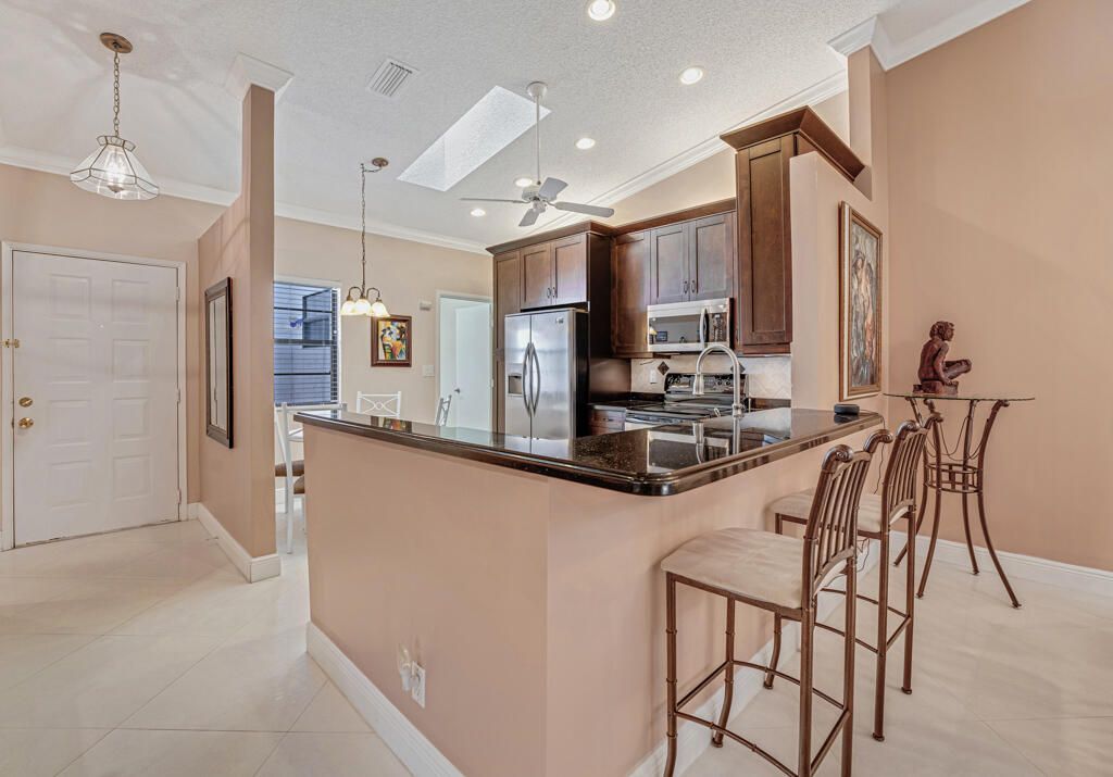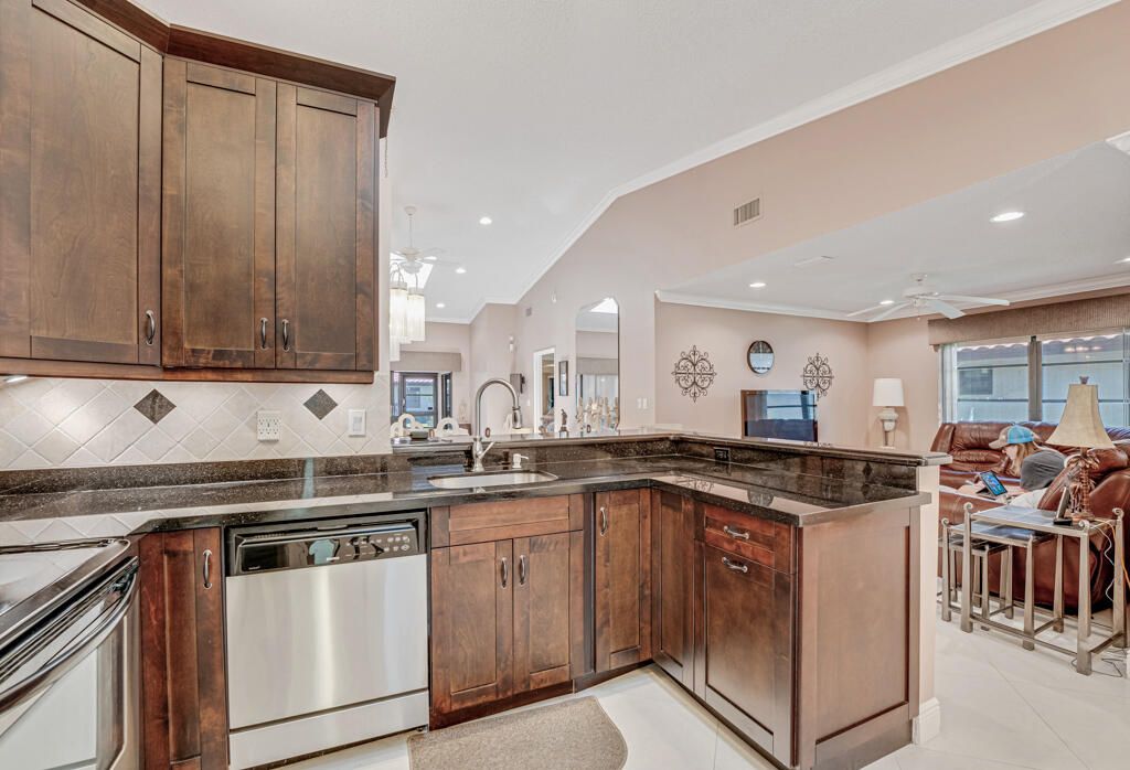 This one is a Wow! Enjoy living in this totally renovated villa w/ state of the art finishes! WALK TO SATELLITE POOL! Nothing needs doing! Some Highlights include Gorgeous open kitchen with hi-end granite, 45'' solid wood cabinets and soft close drawers and doors plus 2 lazy susans and pristine stainless steel appliances. Crown moulding in every room throughout villa. 24'' porcelain floor tiles. Accent lighting in kitchen, dining room, living room and den. Den has surround sound in the walls Primary bedroom has 2 walk in closets. Primary bathroom has 2 sinks and granite countertops. Guest bathroom has granite countertops Lanai under air, can be used as 3rd bedroom Upgraded Alarm System, Workshop in garage. Air conditioner and water heater year 2020 Skylights in kitchen and living room.